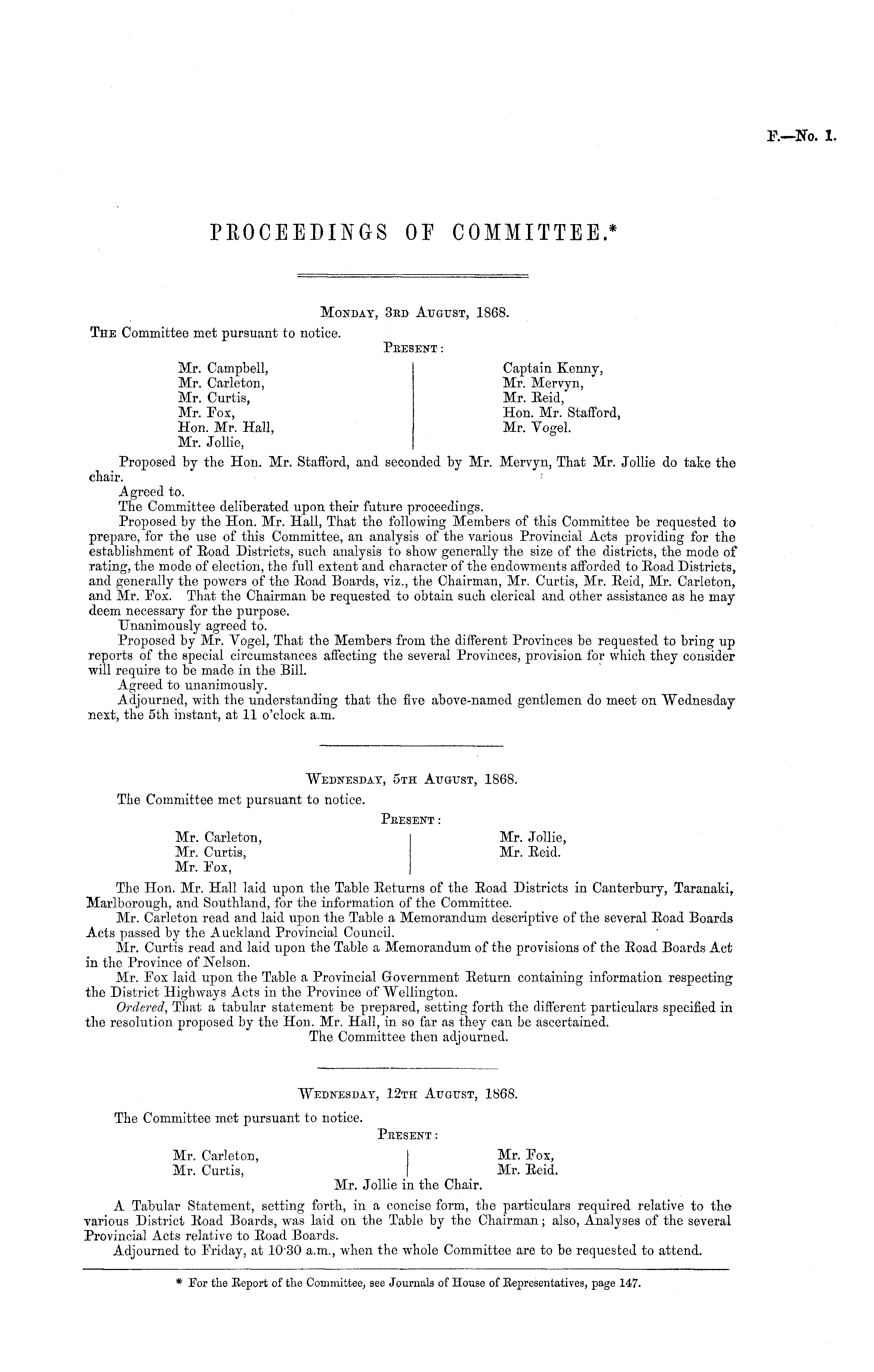 Monday, 3kd August, 1868. The Committee met pursuant to notice. Peeseitt: Mr. Campbell, Captain Kenny, Mr. Carleton, Mr. Morvyn, Mr. Curtis, Mr. Eeid, Mr. Fox, Hon. Mr. Stafford, Hon. Mr. Hall, Mr. Vogel. Mr. Jollie, Proposed by the Hon. Mr. Stafford, and seconded by Mr. Mervyn, That Mr. Jollie do take the chair. Agreed to. The Committee deliberated upon their future proceedings. Proposed by the Hon. Mr. Hall, That the following Members of this Committee be requested to prepare, for the use of this Committee, an analysis of the various Provincial Acts providing for the establishment of Eoad Districts, such analysis to show generally the size of the districts, tho mode of rating, the mode of election, the full extent and character of the endowments afforded to Eoad Districts, and generally the powers of the Eoad Boards, viz., the Chairman, Mr. Curtis, Mr. Eeid, Mr. Carleton, and Mr. Fox. That the Chairman be requested to obtain such clerical and other assistance as he may deem necessary for the purpose. Unanimously agreed to. Proposed by Mr. Vogel, That the Members from the different Provinces be requested to bring up reports of the special circumstances affecting the several Provinces, provision for which they consider will require to be made in the Bill. Agreed to unanimously. Adjourned, with tho understanding that the five above-named gentlemen do meet on Wednesday next, the sth instant, at 11 o'clock a.m.