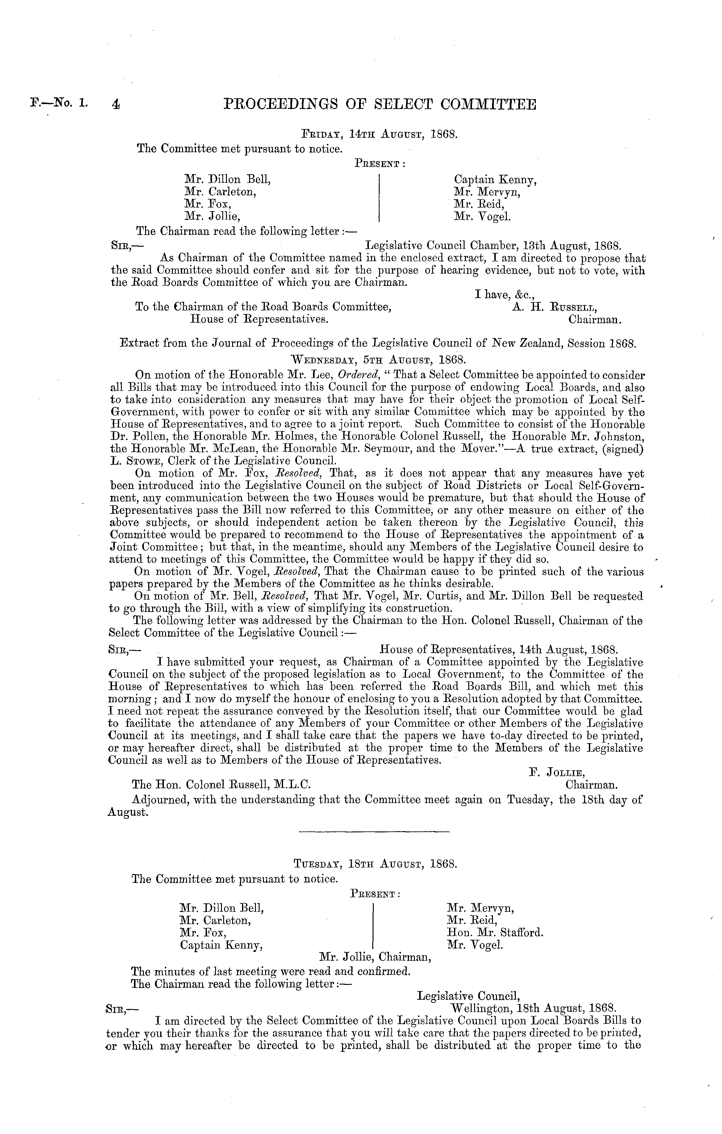 Tuesday, 18th August, 1868. The Committee met pursuant to notice. Peesent: Mr. Dillon Bell, Mr. Mervyn, Mr. Carleton, Mr. Eeid, Mr. Fox, Hon. Mr. Stafford. Captain Kenny, Mr. Vogel. Mr. Jollie, Chairman, The minutes of last meeting were read and confirmed. The Chairman read the following letter: — Legislative Council, Slßj— Wellington, 18th August, 1868. I am directed by the Select Committee of the Legislative Council upon Local Boards Bills to tender you their thanks for the assurance that you will take care that the papers directed to be printed, ■or which may hereafter be directed to be printed, shall be distributed at the proper time to the
