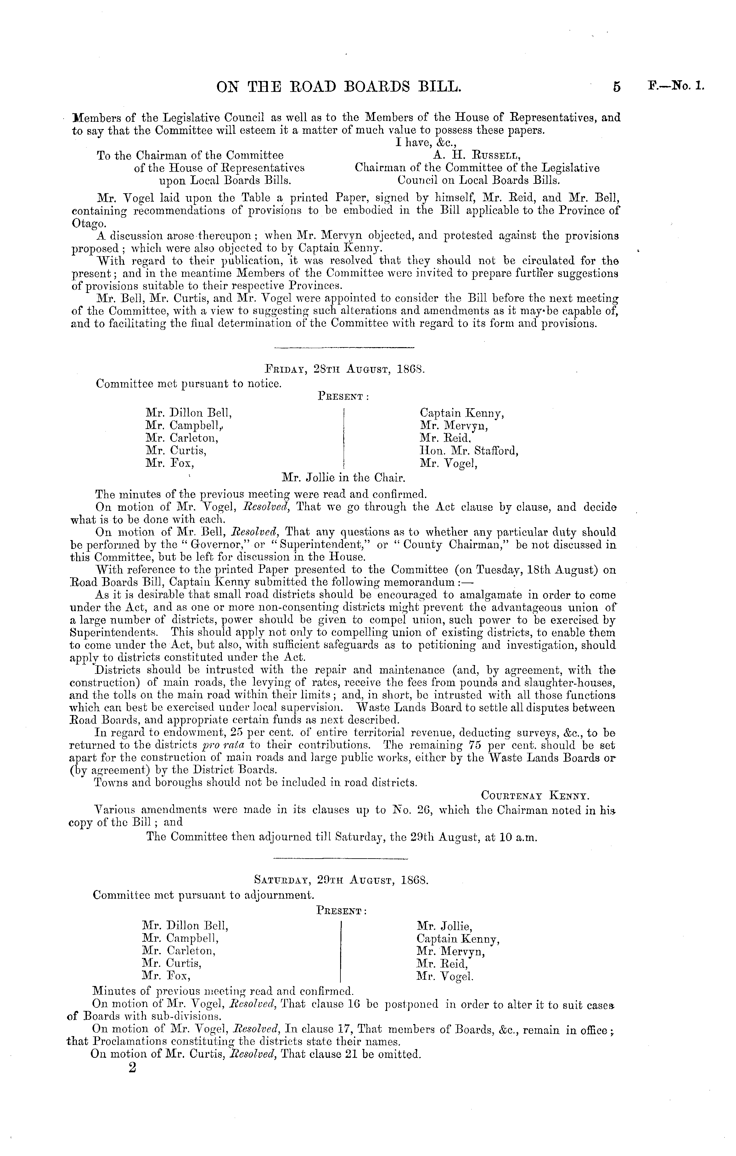 Friday, 28th August, 1868. Committee met pursuant to notice. Present: Mr. Dillon Bell, Captain Kenny, Mr. Campbell, Mr. Mervyn, Mr. Carleton, Mr. Eeid. Mr. Curtis, Hon. Mr. Stafford, Mr. Fox, Mr. Vogel, Mr. Jollie in the Chair. The minutes of the previous meeting were read and confirmed. On motion of Mr. Vogel, Resolved, That we go through the Act clause by clause, and decide what is to be done with each. On motion of Mr. Bell, Hesolved, That any questions as to whether any particular duty should be performed by the " Governor," or " Superintendent," or " County Chairman," be not discussed in this Committee, but be left for discussion in the House. With reference to the printed Paper presented to the Committee (on Tuesday, 18th August) on Eoad Boards Bill, Captain Kenny submitted the following memorandum : — As it is desirable that small road districts should be encouraged to amalgamate in order to come under the Act, and as one or more non-consenting districts might prevent the advantageous union of a large number of districts, power should be given to compel union, such power to be exercised by Superintendents. This should apply not only to compelling union of existing districts, to enable them to come under the Act, but also, with sufficient safeguards as to petitioning and investigation, should apply to districts constituted under the Act. "Districts should be, intrusted with the repair and maintenance (and, by agreement, with the construction) of main roads, the levying of rates, receive the fees from pounds and slaughter-houses, and the tolls on the main road within their limits; and, in short, bo intrusted with all those functions which can best be exercised under local supervision. Waste Lands Board to settle all disputes between Boad Boards, and appropriate certain funds as next described. In regard to endowment, 25 per cent, of entire territorial revenue, deducting surveys, &c., to be returned to the districts pro rota to their contributions. The remaining 75 per cent, should be set apart for the construction of main roads and largo public works, either by the Waste Lands Boards or (by agreement) by the District Boards. Towns and boroughs should not be included in road districts. Cotjrtenat Kenny. Various amendments were made in its clauses up to No. 2G, which the Chairman noted in his copy of the Bill; and The Committee then adjourned till Saturday, the 29th August, at 10 a.m. Satukday, 29th August, 18(58. Committee met pursuant to adjournment. Pbesest : Mr. Dillon Bell, Mr. Jollie, Mr. Campbell, Captain Kenny, Mr. Carleton, Mr. Mervyn, Mr. Curtis, Mr. Eeid, Mr. Fox, Mr. Vogel. Minutes of previous meeting read and confirmed. On motion of Mr. Vogel, Resolved, That clause 16 be postponed in order to alter it to suit case* of Boards with sub-divisions. On motion of Mr. Vogel, Resolved, In clause 17, That members of Boards, Ac, remain in office ; that Proclamations constituting the districts state their names. On motion of Mr. Curtis, Resolved, That clause 21 be omitted. 2