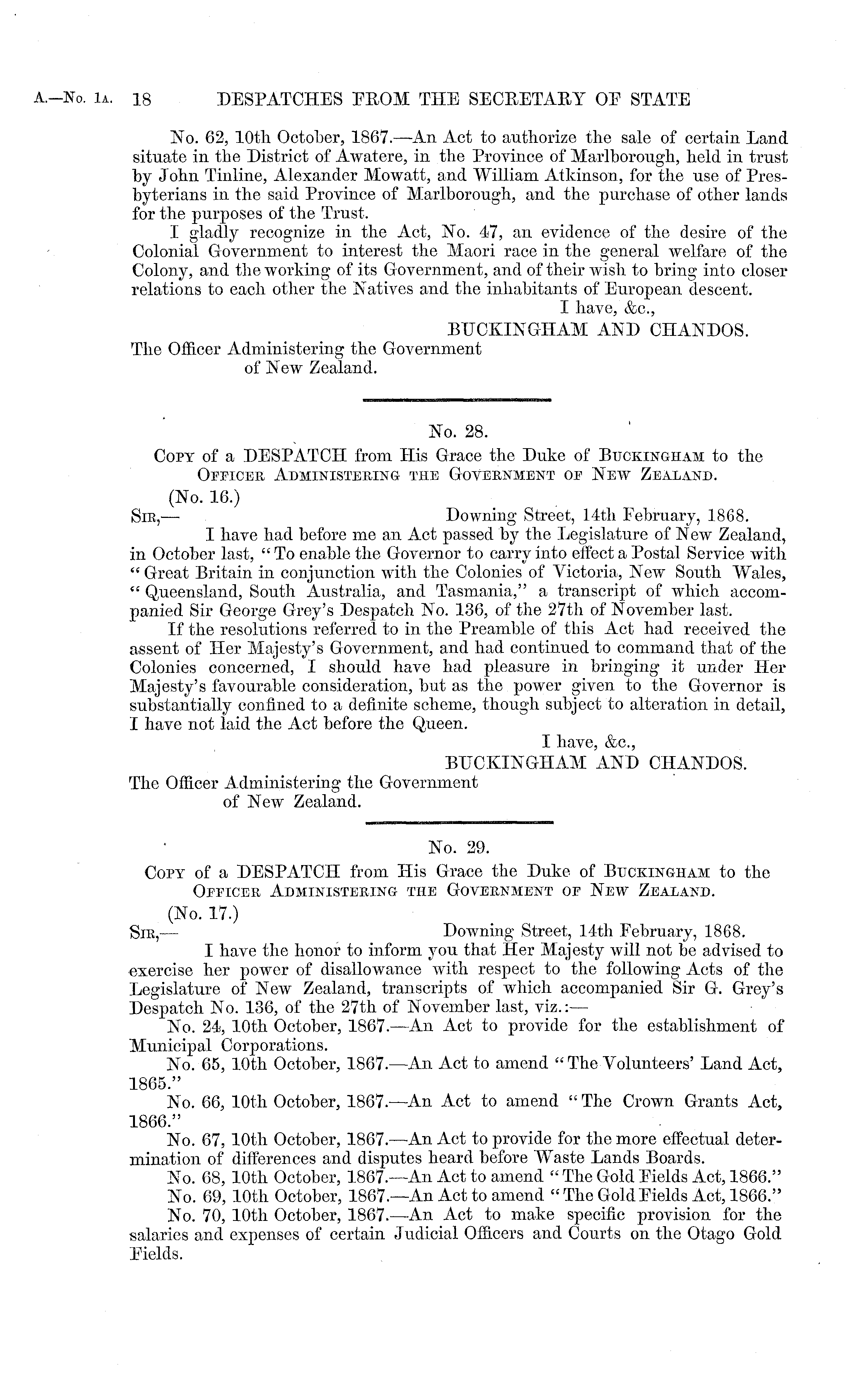 No. 29. Copy of a DESPATCH from His Grace the Duke of Buckingham to the Officer Administering the Government of New Zealand. (No. 17.) Sir, — Downing Street, 14th February, 18(58. I have the honor to inform you that Her Majesty will not be advised to exercise her power of disallowance with respect to the following Acts of the Legislature of New Zealand, transcripts of which accompanied Sir G. Grey's Despatch No. 186, of the 27th of November last, viz.:— No. 24, 10th October, 1867. —An Act to provide for the establishment of Municipal Corporations. No. 65, 10th October, 1867.—An Act to amend " The Volunteers' Land Act, 1865." No. 66, 10th October, 1867. —An Act to amend " The Crown Grants Act, 1866." No. 67, 10th October, 1867. —An Act to provide for the more effectual determination of differences and disputes heard before Waste Lands Boards. No. 68, 10th October, 1867.—An Act to amend " The Gold Fields Act, 1866." No. 69, 10th October, 1867.—An Act to amend "The Gold Fields Act, 1866." No. 70, 10th October, 1867. —An Act to make specific provision for the salaries and expenses of certain Judicial Officers and Courts on the Otago Gold Fields.