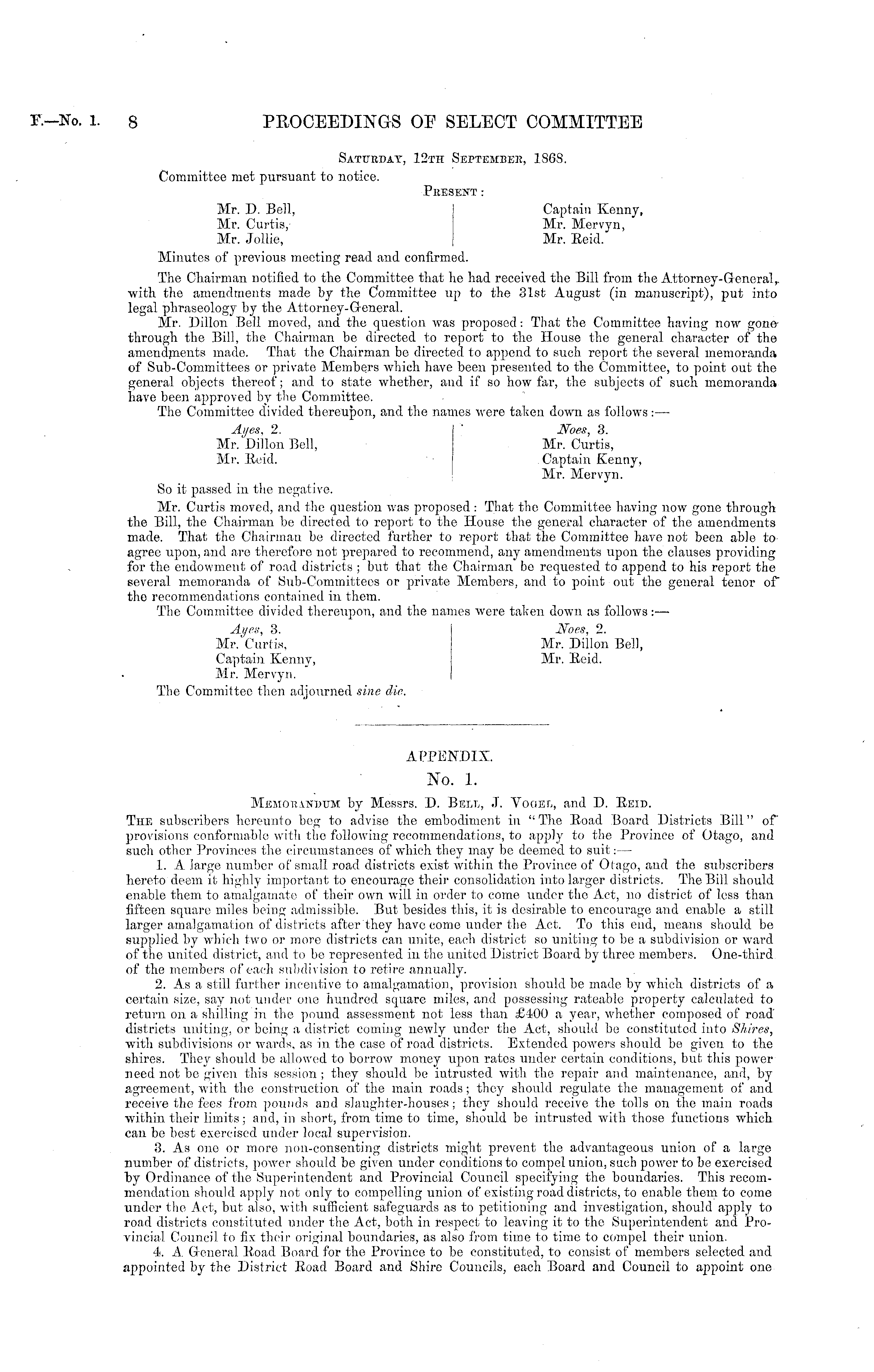 Saturday, 12th September, ISGB. Committee met pursuant to notice. Present: Mr. D. Bell, Captain Kenny, Mr. Curtis, Mr. Mervyn, Mr. Jollie, Mr. Eeid. Minutes of previous meeting read and confirmed. The Chairman notified to the Committee that he had received the Bill from the Attorney-General,, with the amendments made by the Committee up to the 31st August (in manuscript), put into legal phraseology by the Attorney-General. Mr. Dillon Bell moved, and the question was proposed: That the Committee having now gonethrough the Bill, the Chairman be directed to report to the House the general character of the amendments made. That the Chairman bo directed to append to such report the several memoranda of Sub-Committees or private Members which have been presented to the Committee, to point out the general objects thereof; and to state whether, and if so how far, the subjects of such memoranda have been approved by the Committee. The Committee divided thereupon, and the names were taken down as follows: —■ Ayes, 2. Noes, 3. Mr. Dillon Bell, Mr. Curtis, Mr. Ei'id. Captain Kenny, Mr. Mervyn. So it passed in the negative. Mr. Curtis moved, and the question was proposed : That the Committee having now gone through the Bill, the Chairman be directed to report to the House the general character of the amendments made. That the Chairman be directed further to report that the Committee have not been able to agree upon, and are therefore not prepared to recommend, any amendments upon the clauses providing for the endowment of road districts ; but that the Chairman be requested to append to his report the several memoranda of (Sub-Committees or private Members, and to point out the general tenor of the recommendations contained in them. The Committee divided thereupon, and the names were taken down as follows : — Ayes, 3. Noes, 2. Mr.'Curtis, Mr. Dillon Bell, Captain Kenny, Mr. Eeid. Mr. Mervyn. The Committee then adjourned sine die. ■