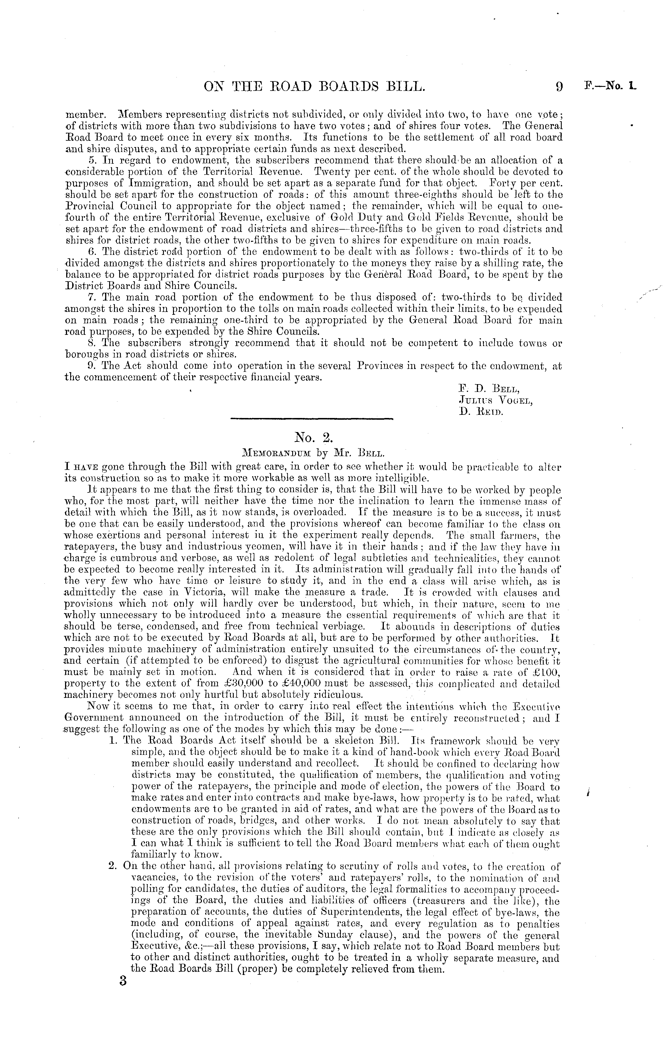 No. 2. Mejioeandusi by Mr. Bell. I hate gone through the Bill with great care, in order to see whether if; would be practicable to alter its construction so as to make it more workable as well as more intelligible. It appears to me that the first thing to consider is, that the Bill will have to be worked by people who, for the most part, will neither have the time nor the inclination to learn the immense mass of detail with which the Bill, as it now stands, is overloaded. If the measure is to be a success, it must be one that can be easily understood, and the provisions whereof can become familiar 1o the class on whose exertions and personal interest in it the experiment really depends. The small farmers, the ratepaj'ers, the busy and industrious yeomen, will have it in their hands ; and if the law they have in charge is cumbrous and verbose, as well as redolent of legal subtleties and technicalities, they cannot be expected to become really interested in it. Its administration will gradually fall into the hands of the very few who have time or leisure to study it, and in the end a class will arise which, as is admittedly the case in Victoria, will make the measure a trade. It is crowded with clauses and provisions which not only will hardly ever bo understood, but which, in their nature, seem to me ■wholly unnecessary to be introduced into a measure the essential requirements of which are that it should be terse, condensed, and free from technical verbiage. It abounds in descriptions of duties which are not to be executed by Road Boards at all, but are to be performed by other authorities. It provides minute machinery of administration entirely unsuited to the circumstances of-the country, and certain (if attempted to be enforced) to disgust the agricultural communities for whose benefit it must be mainly set in motion. And when it is considered that in order to raise a rate; of £LOO, property to the extent of from £30,000 to £1-0,000 must be assessed, this complicated and detailed machinery becomes not only hurtful but absolutely ridiculous. Now it seems to me that, in order to carry into real effect the intentions which the Executive Government announced on the introduction of the Bill, it must be entirely reconstructed ; and I suggest the following as one of the modes by which this may be done : — 1. The Road Boards Act itself should be a skeleton Bill. Its framework should be very simple, and the object should bo to make it a kind of hand-book which every Road Board member should easily understand and recollect. It should lie confined to declaring how districts may be constituted, the qualification of members, the qualification and voting power of the ratepayers, the principle and mode of election, the powers of the Board to make rates and enter into contracts and make bye-laws, how property is to be rated, what endowments are to be granted in aid of rates, and what are the powers of the Board as to construction of roads, bridges, and other works. Ido not mean absolutely to say that these are the only provisions which the Bill should contain, but I indicate as closely as I can what I think is sufficient to tell the Road Board members what each of them ought familiarly to know. 2. On the other hand, all provisions relating to scrutiny of rolls and votes, to the creation of vacancies, to the revision of the voters' and ratepayers'rolls, to the nomination of and polling for candidates, the duties of auditors, the legal formalities to accompany proceedings of the Board, the duties and liabilities of officers (treasurers and the like), the preparation of accounts, the duties of Superintendents, the legal effect of bye-laws, the mode and conditions of appeal against rates, and every regulation as to penalties (including, of course, the inevitable Sunday clause), and the powers of the general Executive, &c; —all these provisions, I say, which relate not to Road Board members but to other and distinct authorities, ought to be treated in a wholly separate measure, and the Road Boards Bill (proper) be completely relieved from them. 3