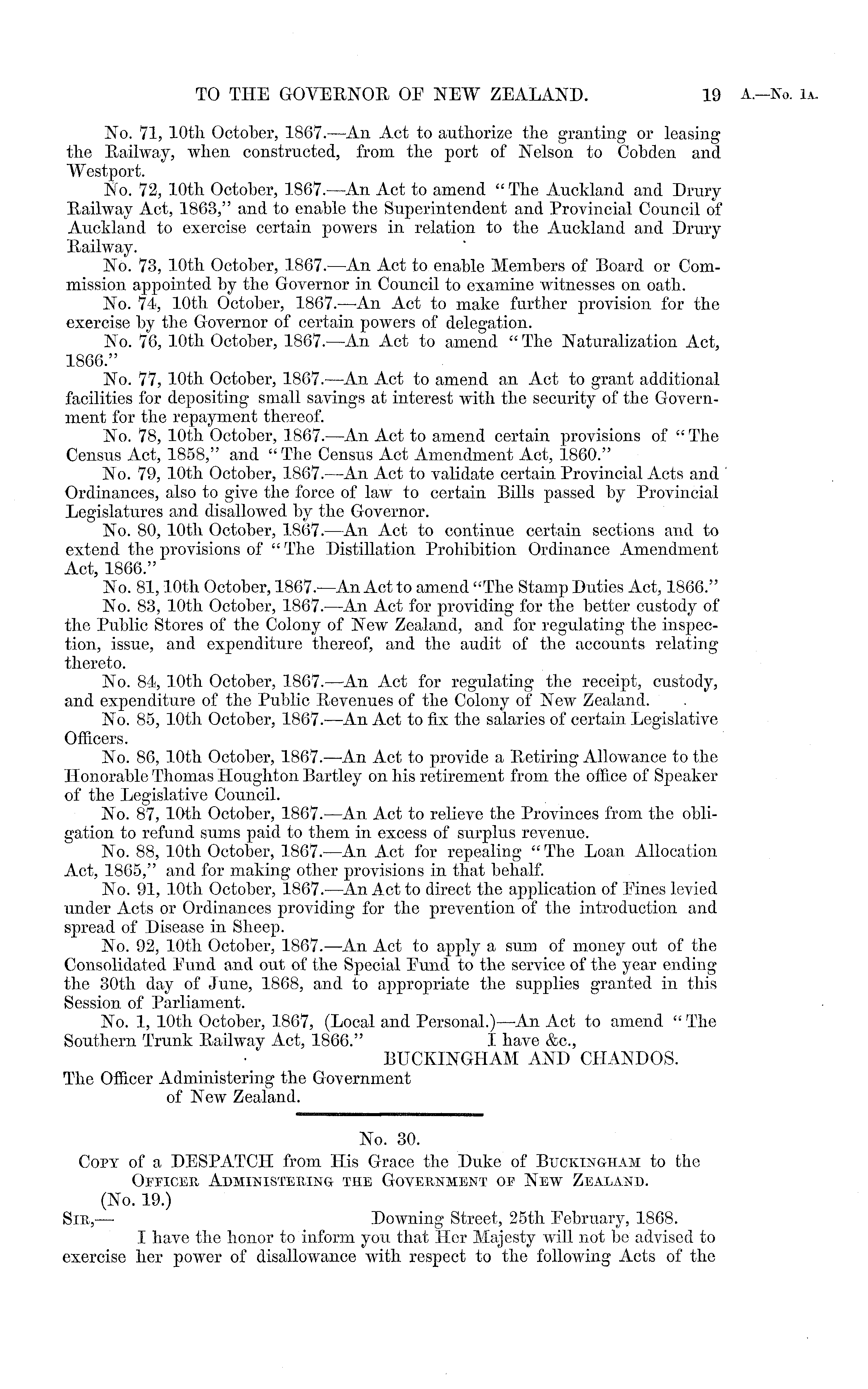 No. 30. Copy of a DESPATCH from His Grace the Duke of Buckingham to the Officer Administering the Government of New Zealand. (No. 19.) Sir,— Downing Street, 25th February, 1868. I have the honor to inform you that Her Majesty will not be advised to exercise her power of disallowance Avith respect to the following Acts of the