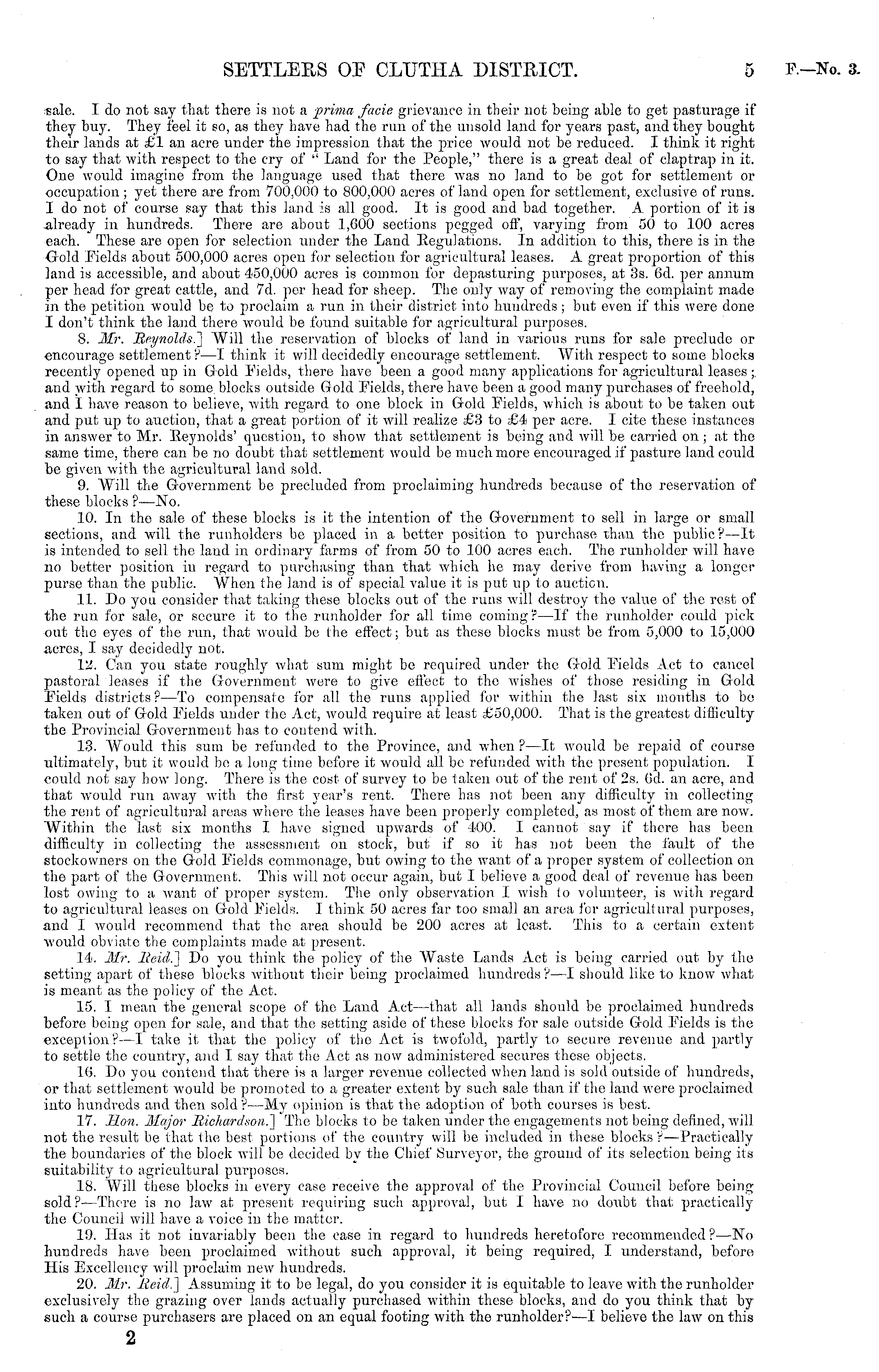 sale. Ido not say that there is not a prima facie grievance in their not being able to get pasturage if they buy. They feel it so, as they have had the run of tho unsold land for years past, and they bought their lands at £1 an acre under the impression that the price would not be reduced. I think it right to say that with respect to tho cry of " Land for the People," there is a great deal of claptrap in it. One would imagine from the language used that there was no land to be got for settlement or occupation ; yet there are from 700,000 to 800,000 acres of land open for settlement, exclusive of runs. I do not of course say that this land is all good. It is good and bad together. A portion of it is .already in hundreds. There are about 1,600 sections pegged off, varying from 50 to 100 acres each. These are open for selection under the Land Regulations. In addition to this, there is in the Gold Fields about 500,000 acres open for selection for agricultural leases. A great proportion of this land is accessible, and about 450,000 acres is common for depasturing purposes, at 3s. 6d. per annum per head for great cattle, and 7d. per head for sheep. The only way of removing the complaint made in the petition would be to proclaim a run in their district into hundreds ; but even if this were done I don't think the land there would be found suitable for agricultural purposes. 8. Mr. Reynolds^] Will the reservation of block's of land in various runs for sale preclude or encourage settlement ? —I think it will decidedly encourage settlement. With respect to some blocks recently opened up in Gold Fields, there have been a good many applications for agricultural leases ;. and with regard to some blocks outside Gold Fields, there have been a good many purchases of freehold, and I have reason to believe, with regard to one block in Gold Fields, which is about to be taken out and put up to auction, that a great portion of it will realize £3 to £4 per acre. I cite these instances in answer to Mr. Reynolds' question, to show that settlement is being aud will be carried on ; at the same time, there can bo no doubt that settlement would be much more encouraged if pasture land could be given with the agricultural land sold. 9. Will the Government be precluded from proclaiming hundreds because of the reservation of these blocks ? —No. 10. In tho sale of these blocks is it the intention of the Government to sell in largo or small sections, and will the runholders be placed in a better position to purchase than the public?—lt is intended to sell the land in ordinary farms of from 50 to 100 acres each. The runholder will have no better position in regard to purchasing than that wrhich he may derive from having a longer purse than tho public. When the land is of special value it is put up to auction. 11. Do you consider that taking these blocks out of the runs will destroy the value of the rest of the run for sale, or secure it to the runholder for all time coming? —If the runholder could pick out the eyes of the run, that would be the effect; but as these blocks must be from 5,000 to 15,000 acres, I say decidedly not. 1_ Can you state roughly what sum might be required under the Gold Fields Act to cancel pastoral leases if the Government were to give effect to the wishes of those residing in Gold Fields districts? —To compensate for all the runs applied for within the last six months to be taken out of Gold Fields under the Act, would require at least £50,000. That is the greatest difficulty the Provincial Government has to contend with. 13. Would this sum be refunded to the Province, and when ? —lt would be repaid of course ultimately, but it would bo a long time before it would all be refunded with the present population. I could not say how long. There is the cost of survey to be taken out of the rent of 2s. Od. an acre, and that would run away with the first year's rent. There has not been any difficulty in collecting the rent of agricultural areas where the leases have been properly completed, as most of them are now. Within the last six months I have signed upwards of 400. .1 cannot say if there has been difficulty in collecting the assessment on stock, but if so it has not been the fault of the stockowners on the Gold Fields commonage, but owing to the want of a proper system of collection on the part of the Government. This will not occur again, but I believe a good deal of revenue has been lost owing to a want of proper system. The only observation I wish to volunteer, is with regard to agricultural leases on Gold Fields. I think 50 acres far too small an area for agricultural purposes, and I would recommend that the area should be 200 acres at least. This to a certain extent would obviate the complaints made at present. 14. Mr. Reid.] Do you think the policy of the Waste Lauds Act is being carried out by the setting apart of these blocks without their being proclaimed hundreds? —I should like to know what is meant as the policy of the Act. 15. I mean the general scope of the Land Act—that all lands should be proclaimed hundreds before being open for sale, and that the setting aside of these blocks for sale outside Gold Fields is the exception? —I take it that the policy of the Act is twofold, partly to secure revenue and partly to settle the country, and I say that the Act as now administered secures these objects. 16. Do you contend that there is a larger revenue collected when land is sold outside of hundreds, or that settlement would be promoted to a greater extent by such sale than if the land were proclaimed into hundreds and then sold ? —My opinion is that the adoption of both courses is best. 17. Hon. Major Richardson.] The blocks to be taken under the engagements not being defined, will not the result be that the best portions of the country will be included in these blocks ? —Practically the boundaries of the block will be decided by the Chief Surveyor, the ground of i