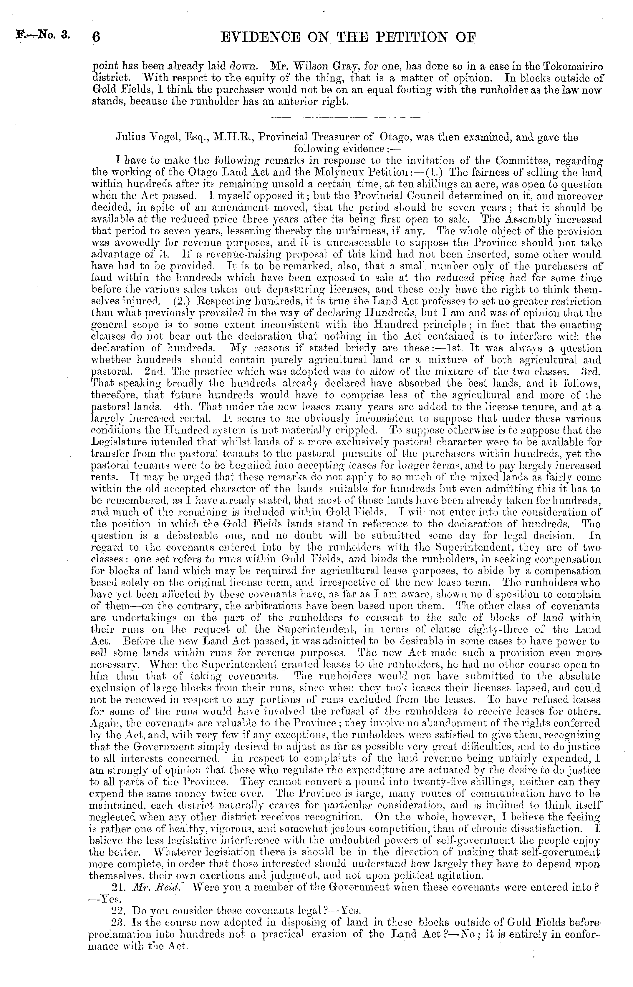 point has been already laid down. Mr. Wilson Gray, for one, has done so in a case in the Tokomairiro district. With respect to the equity of the thing, that is a matter of opinion. In blocks outside of Gold Fields, I think the purchaser would not be on an equal footing with the runholder as the law now stands, because the runholder has an anterior right. •Julius Vogel, Esq., M.11.R., Provincial Treasurer of Otago, was then examined, and gave the following evidence: — 1 have to make the following remarks in response to the invitation of the Committee, regarding the working of the Otago Land Act and the Molyneux Petition.: —(1.) The fairness of selling the land within hundreds after its remaining unsold a certain time, at ten shillings an acre, was open to question when the Act passed. I myself opposed it; but the Provincial Council determined on it, and moreover decided, in spite of an amendment moved, that the period should be seven years ; that it should be available at the reduced price three years after its being first open to sale. The Assembly increased that period to seven years, lessening thereby the unfairness, if any. The whole object of the provision was avowedly for revenue purposes, and it is unreasonable to suppose the Province should not take advantage of it. If a revenue-raising proposal of this kind had not been inserted, some other would have had to bo .provided. It is to be remarked, also, that a small number only of the purchasers of land within the hundreds which have been exposed to sale at tho reduced price had for some time before the various sales taken out depasturing licenses, and these only have the right to think themselves injured. (2.) Respecting hundreds, it is true the Land Act professes to set no greater restriction than what previously prevailed in the way of declaring Hundreds, but I am and was of opinion that tho general scope is to some extent inconsistent with the Hundred principle; in fact that the enactingclauses do not bear out the declaration that nothing in the Act contained is to interfere with the declaration of hundreds. My reasons if stated briefly are these: —lst. It was always a question whether hundreds should contain purely agricultural land or a mixture of both agricultural and pastoral. 2nd. The practice which was adopted was to allow of the mixture of the two classes. 3rd. That speaking broadly the hundreds already declared have absorbed the best lands, and it follows, therefore, that future hundreds would have to comprise less of the agricultural and more of the pastoral lands. 4th. That under tho now leases many years are added to tho license tenure, and at a largely increased rental. It seems to me obviously inconsistent to suppose that under these various conditions the Hundred system is not materially crippled. To suppose otherwise is to suppose that the Legislature intended that whilst lands of a more exclusively pastoral character wrcre to be available for transfer from the pastoral tenants to the pastoral pursuits of the purchasers within hundreds, yet the pastoral tenants were to be beguiled into accepting leases for longer terms, and to pay largely increased rents. It may bo urged that these remarks do not apply to so much of the mixed lands as fairly come within the old accepted character of the lands suitable for hundreds but even admitting this it has to bo remembered, as I have already stated, that most of those lands have been already taken for hundreds, and much of tho remaining is included within Gold Fields. I will not enter into the consideration of the position in which the Gold Fields lands stand in reference to tho declaration of hundreds. Tho question is a debateable one, and no doubt will be. submitted some day for legal decision. In regard to the covenants entered into by the runholders with the Superintendent, they are of two classes : one set refers to runs within Gold Fields, and binds the runholders, in seeking compensation for blocks of land which, may be required for agricultural lease purposes, to abide by a compensation based solely on the original license term, and irrespective of the mew lease term. Tho runholders who have yet been affected by these covenants have, as far as I am aware, shown no disposition to complain of them —on tho contrary, the arbitrations have been based upon them. The other class of covenants are undertakings on the part of the runholders to consent to the sale of blocks of land within their runs on the request of the Superintendent, in terms of clause eighty-three of the Land Act. Before the now Land Act passed, it was admitted to bo desirable in some cases to have power to sell sbme lands within runs for revenue purposes. Thenncrw r Act made such a provision even more necessary. When the Superintendent granted leases to the runholders, lie had no other course open to him than that of taking covenants. Tho runholders would not have submitted to the absolute exclusion of large blocks from their runs, since when they took leases their licenses lapsed, and could not be renewed in respect to any portions of runs excluded from the leases. To have refused leases for some of the runs would have involved the refusal of the runholders to receive leases for others. Again, tho covenants are valuable to the Province ; they involve no abandonment of the rights conferred by the Act, and, with very few if any exceptions, the runholders wore satisfied to give them, recognizing that the Government simply desired to adjust as far as possible very great difficulties, and to do justice to all interests concerned. In respect to complaints of the land revenue being unfairly expended, I am strongly of opinion that those who regulate the expenditure are actuated by the desire to do justice to all parts of tho Province. They cannot convert a pound into twenty-five shillings, neither can they expend the same money twice over. The Province is large, many routes of communication have to be mai