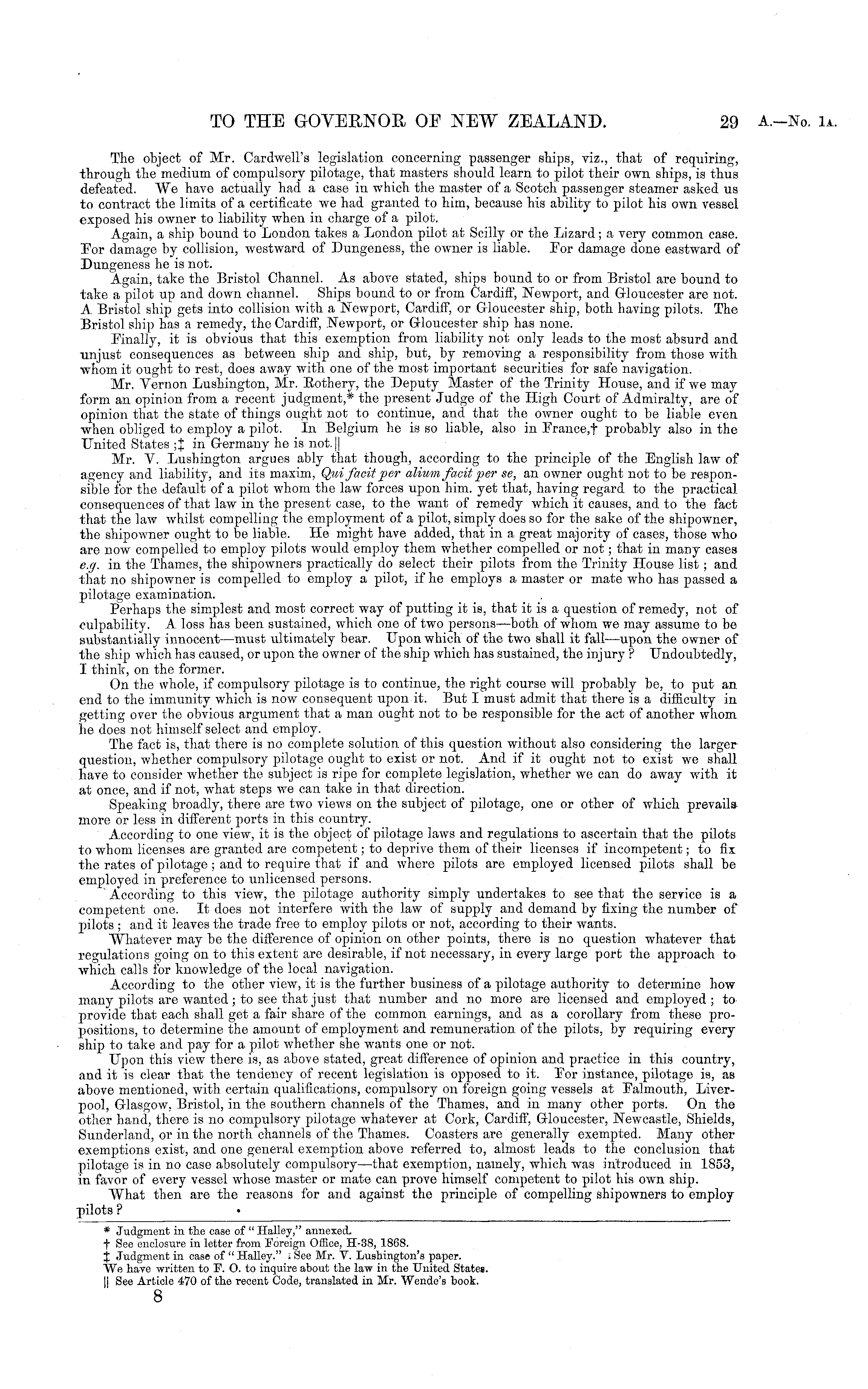 The object of Mr. Cardwcll's legislation concerning passenger ships, viz., that of requiring, through the medium of compulsory pilotage, that masters should learn to pilot their own ships, is thus defeated. We have actually had a case in which the master of a Scotch passenger steamer asked us to contract the limits of a certificate we had granted to him, because his ability to pilot his own vessel exposed his owner to liability when in charge of a pilot. Again, a ship bound to London takes a London pilot at Scilly or the Lizard; a very common case. For damage by collision, westward of Dungeness, the owner is liable. For damage done eastward of Dungeness ho is not. Again, take the Bristol Channel. As above stated, ships bound to or from Bristol are bound to take a pilot up and down channel. Ships bound to or from Cardiff, Newport, and Gloucester are not. A Bristol ship gets into collision with a Newport, Cardiff, or Gloucester ship, both having pilots. The Bristol ship has a remedy, the Cardiff, Newport, or Gloucester ship has none. Finally, it is obvious that this exemption from liability not only leads to the most absurd and unjust consequences as between ship and ship, but, by removing a responsibility from those with whom it ought to rest, does away with one of the most important securities for safe navigation. Mr. Vernon Lushington, Mr. Eothery, the Deputy Master of the Trinity House, and if we may form an opinion from a recent judgment,* the present Judge of the High Court of Admiralty, are of opinion that the state of things ought not to continue, and that the owner ought to be liable even when obliged to employ a pilot. In Belgium he is so liable, also in France,f probably also in the United States ;£ in Germany he is not. |[ Mr. V. Lushington argues ably that though, according to the principle of the English law of agency and liability, and its maxim, Qui facitper alium facitper se, an owner ought not to be responsible for the default of a pilot whom the law forces upon him. yet that, having regard to the practical conseqxiences of that law in the present case, to the want of remedy which it causes, and to the fact that the law whilst compelling the employment of a pilot, simply does so for the sake of the shipowner, the shipowner ought to be liable. He might have added, that in a great majority of cases, those who are now compelled to employ pilots would employ them whether compelled or not; that in many cases e.r/. in the Thames, the shipowners practically do select their pilots from the Trinity House list; and that no shipowner is compelled to employ a pilot, if he employs a master or mate who has passed a pilotage examination. Perhaps the simplest and most correct way of putting it is, that it is a question of remedy, not of culpability. A loss has been sustained, which one of two persons —both of whom we may assume to be substantially innocent —must ultimately bear. Upon which of the two shall it fall —upon the owner of the ship which has caused, or upon the owner of the ship which has sustained, the injury ? Undoubtedly, I think, on the former. On the whole, if compulsory pilotage is to continue, the right course will probably be, to put an end to the immunity which is now consequent upon it. But I must admit that there is a difficulty in getting over the obvious argument that a man ought not to be responsible for the act of another whom he does not himself select and employ. The fact is, that there is no complete solution of this question without also considering the larger question, whether compulsory pilotage ought to exist or not. And if it ought not to exist we shall have to consider whether the subject is ripe for complete legislation, whether we can do away with it at once, and if not, what steps we can take in that direction. Speaking broadly, there are two views on the subject of pilotage, one or other of which prevails more or less in different ports in this country. According to one view, it is the object of pilotage laws and regulations to ascertain that the pilots to whom licenses are granted are competent; to deprive them of their licenses if incompetent; to fix the rates of pilotage; and to require that if and where pilots are employed licensed pilots shall be employed in preference to unlicensed persons. According to this view, the pilotage authority simply undertakes to see that the service is a competent one. It does not interfere with the law of supply and demand by fixing the number of pilots ; and it leaves the trade free to employ pilots or not, according to their wants. Whatever may be the difference of opinion on other points, there is no question whatever that regulations going on to this extent are desirable, if not necessary, in every large port the approach to which calls for knowledge of the local navigation. According to the other view, it is the further business of a pilotage authority to determine how many pilots are wanted ;to see that just that number and no more are licensed and employed ; to provide that each shall get a fair share of the common earnings, and as a corollary from these propositions, to determine the amount of employment and remuneration of the pilots, by requiring every ship to take and pay for a pilot whether she wants one or not. Upon this view there is, as above stated, great difference of opinion and practice in this country, and it is clear that the tendency of recent legislation is opposed to it. For instance, pilotage is, as above mentioned, with certain qualifications, compulsory on foreign going vessels at Falmouth, Liverpool, Glasgow. Bristol, in the southern channels of the Thames, and in many other ports. On the other hand, there is no compulsory pilotage whatever at Cork, Cardiff, Gloucester, Newcastle, Shields, Sunderland, or in the north channels of the Thames. Coasters are generally exempted. Many other exemptions exist, and one general exemption above referred to, almost leads to the conclusion that