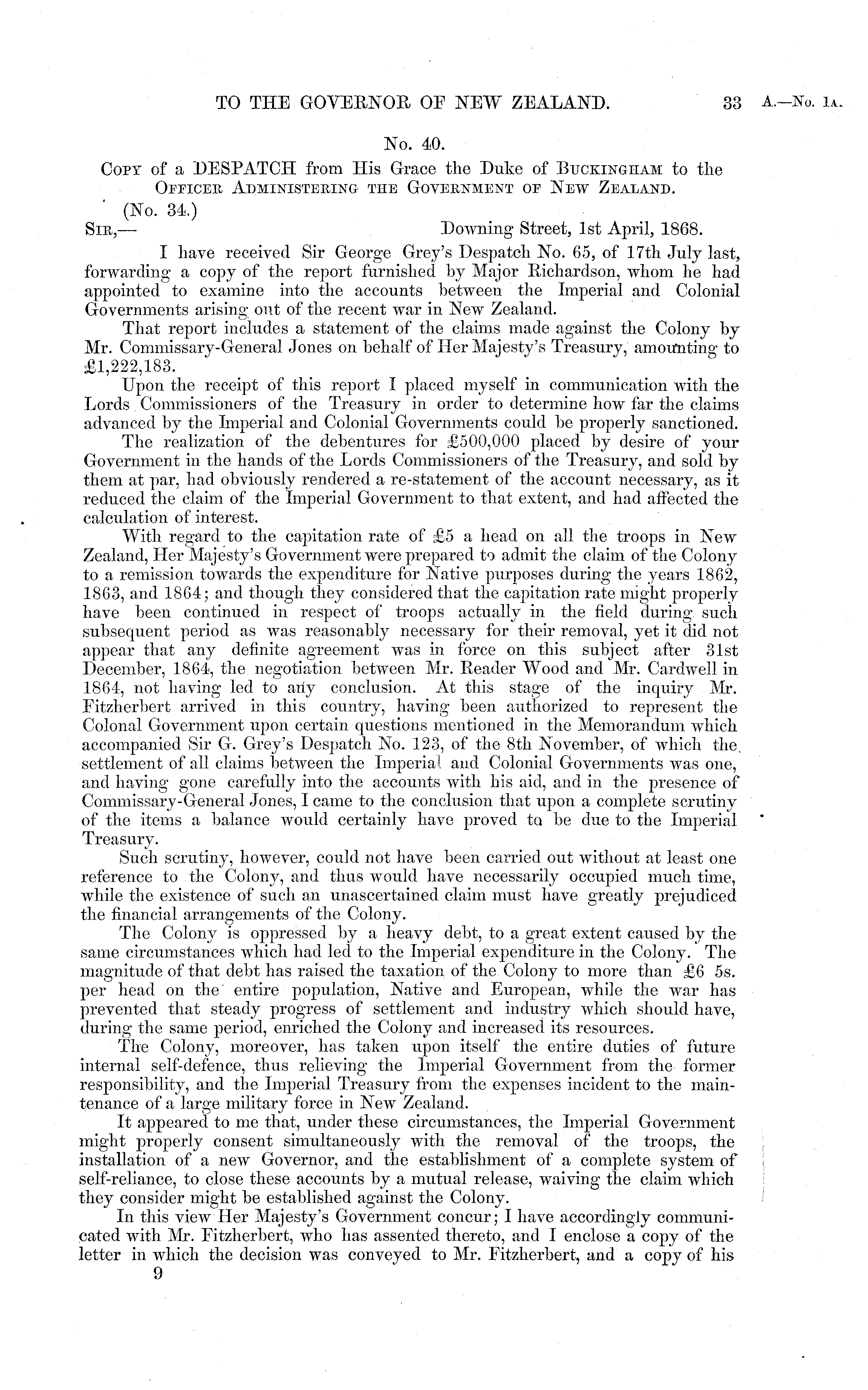 No. 40. Copy of a DESPATCH from His Grace the Duke of Buckingham to the Officer Administering the Government op New Zealand. (No. 34.) Sir, — Downing Street, Ist April, 1868. I have received Sir George Grey's Despatch No. 65, of 17th July last, forwarding a copy of the report furnished by Major Richardson, whom he had appointed to examine into the accounts between the Imperial and Colonial Governments arising out of the recent war in New Zealand. That report includes a statement of the claims made against the Colony by Mr. Commissary-General Jones on behalf of Her Majesty's Treasury, amounting to £1,222,183. Upon the receipt of this report I placed myself in communication with the Lords Commissioners of the Treasury in order to determine how far the claims advanced by the Imperial and Colonial Governments could be properly sanctioned. The realization of the debentures for £500,000 placed by desire of your Government in the hands of the Lords Commissioners of the Treasury, and sold by them at par, had obviously rendered a re-statement of the account necessary, as it reduced the claim of the Imperial Government to that extent, and had affected the calculation of interest. With regard to the capitation rate of £5 a head on all the troops in New Zealand, Her Majesty's Government were prepared to admit the claim of the Colony to a remission towards the expenditure for Native purposes during the years 1862, 1863, and 1864; and though they considered that the capitation rate might properly have been continued in respect of troops actually in the field during, such subsequent period as was reasonably necessary for their removal, yet it did not appear that any definite agreement was in force on this subject after 31st December, 1864, the negotiation between Mr. Reader Wood and Mr. Cardwell in 1864, not having led to arty conclusion. At this stage of the inquiry Mr. Fitzherbert arrived in this country, having been authorized to represent the Colonal Government upon certain questions mentioned in the Memorandum which accompanied Sir G. Grey's Despatch No. 123, of the Bth November, of which the, settlement of all claims "between the Imperial, and Colonial Governments was one, and having gone carefully into the accounts with his aid, and in the presence of Commissary-General Jones, I came to the conclusion that upon a complete scrutiny of the items a balance would certainly have proved to be due to the Imperial Treasury. Such scrutiny, however, could not have been carried out without at least one reference to the Colony, and thus would have necessarily occupied much time, while the existence of such an unascertained claim must have greatly prejudiced the financial arrangements of the Colony. The Colony is oppressed by a heavy debt, to a great extent caused by the same circumstances which had led to the Imperial expenditure in the Colony. The magnitude of that debt has raised the taxation of the Colony to more than £6 ss. per head on the entire population, Native and European, while the war has prevented that steady progress of settlement and industry which should have, during the same period, enriched the Colony and increased its resources. The Colony, moreover, has taken upon itself the entire duties of future internal self-defence, thus relieving the Imperial Government from the former responsibility, and the Imperial Treasury from the expenses incident to the maintenance of a large military force in New Zealand. It appeared to me that, under these circumstances, the Imperial Government might properly consent simultaneously with the removal of the troops, the installation of a new Governor, and the establishment of a complete system of self-reliance, to close these accounts by a mutual release, waiving the claim which they consider might be established against the Colony. In this view Her Majesty's Government concur; I have accordingly communicated with Mr. Fitzherbert, who has assented thereto, and I enclose a copy of the letter in which the decision was conveyed to Mr. Fitzherbert, and a copy of his 9