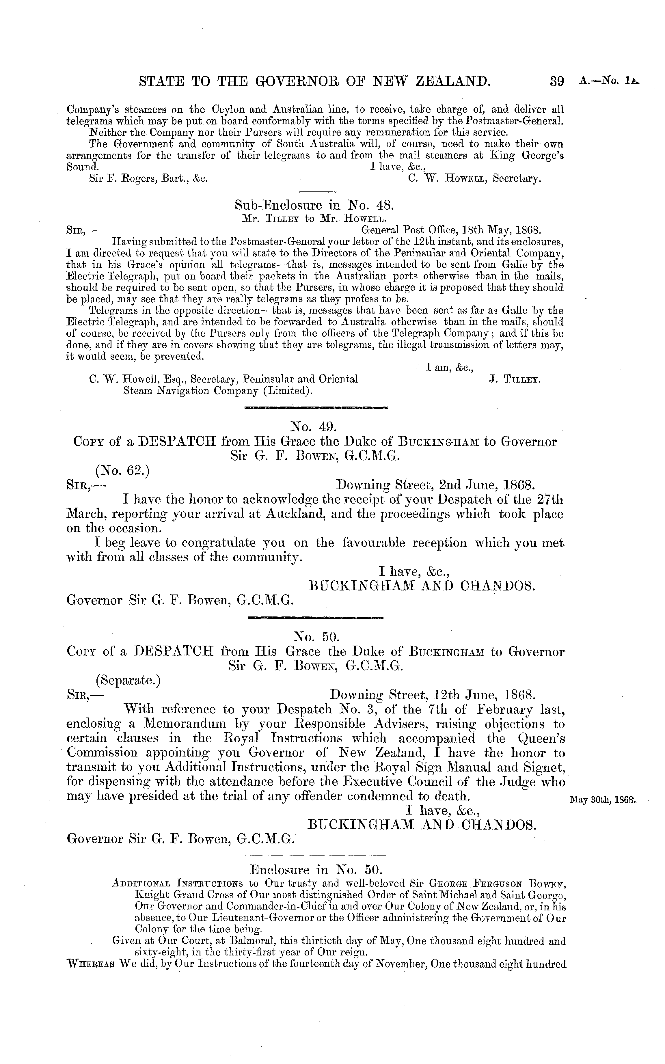 No. 50. Copy of a DESPATCH from His Grace the Duke of Buckingham to Governor Sir G. F. Bowen, G.C.M.G. (Separate.) Sir, — Downing Street, 12th June, 1868. With reference to your Despatch No. 3, of the 7th of February last, enclosing a Memorandum by your Responsible Advisers, raising objections to certain clauses in the Royal Instructions which accompanied the Queen's Commission appointing you Governor of New Zealand, I have the honor to transmit to you Additional Instructions, under the Royal Sign Manual and Signet, for dispensing with the attendance before the Executive Council of the Judge who may have presided at the trial of any offender condemned to death. I have, &c., BUCKINGHAM AND CIIANDOS. Governor Sir G. F. Bowen, G.C.M.G.
