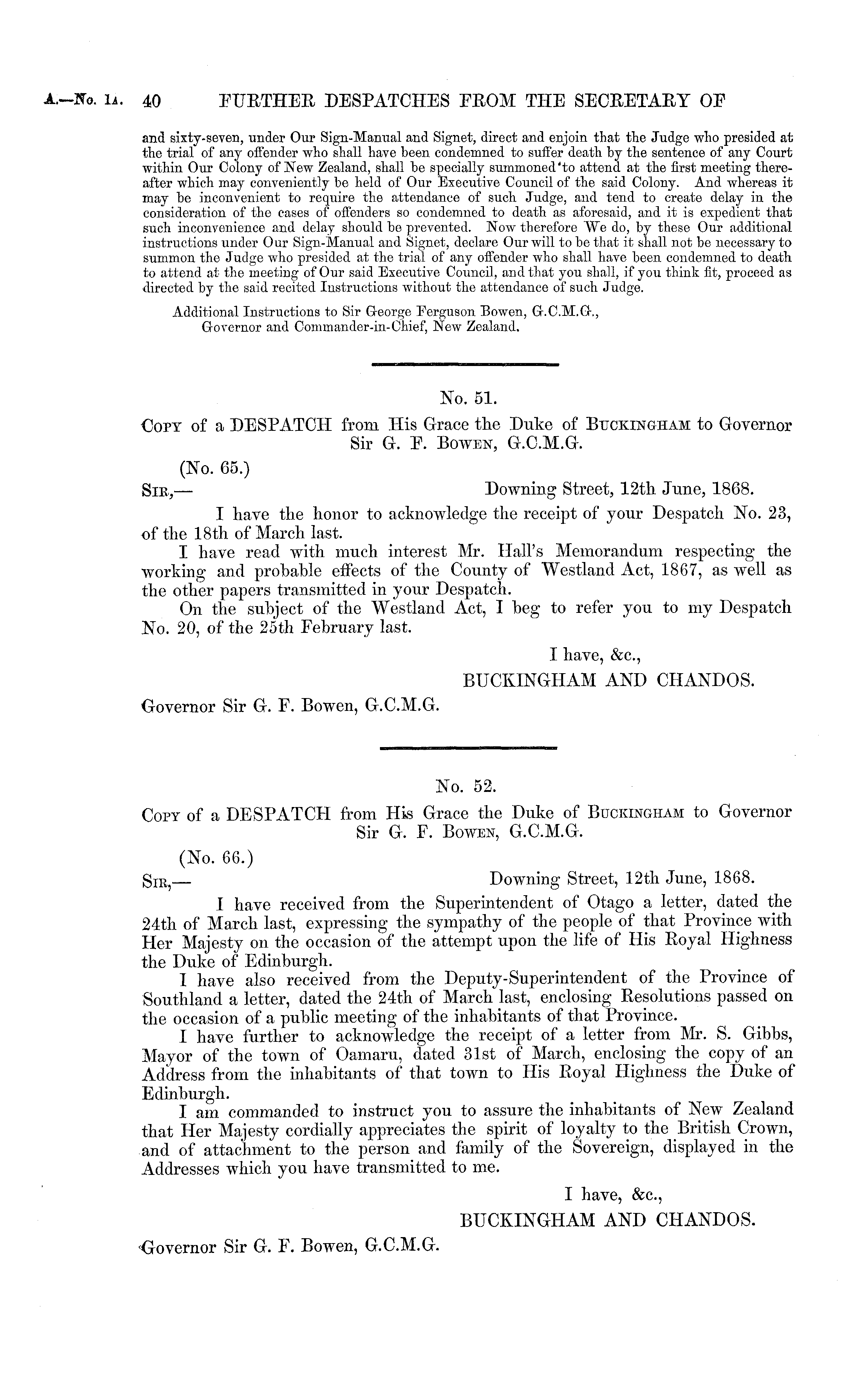 No. 51. Copy of a DESPATCH from His Grace the Duke of Buckingham to Governor Sir G. P. Bowen, G.C.M.G. (No. 65.) Sir, — Downing Street, 12th June, 1868. I have the honor to acknowledge the receipt of your Despatch No. 23, of the 18th of March last. I have read with much interest Mr. Hall's Memorandum respecting the working and probable effects of the County of Westland Act, 1867, as well as the other papers transmitted in your Despatch. On the subject of the Westland Act, I beg to refer you to my Despatch No. 20, of the 25th February last. I have, &c, BUCKINGHAM AND CHANDOS. Governor Sir G. F. Bowen, G.C.M.G.
