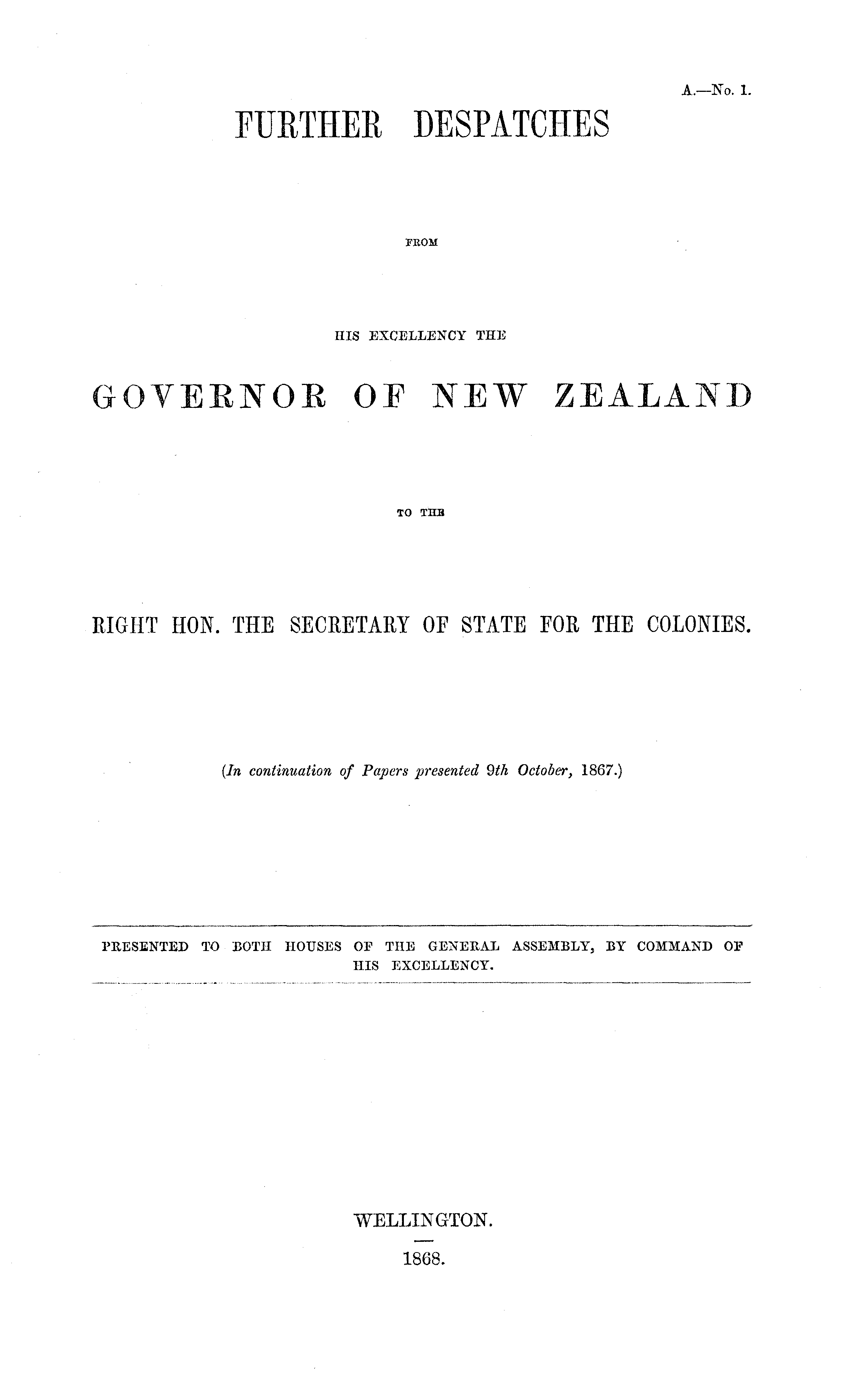 FURTHER DESPATCHES FROM HIS EXCELLENCY THE GOVERNOR OF NEW ZEALAND TO THE RIGHT HON. THE SECRETARY OF STATE FOR THE COLONIES.