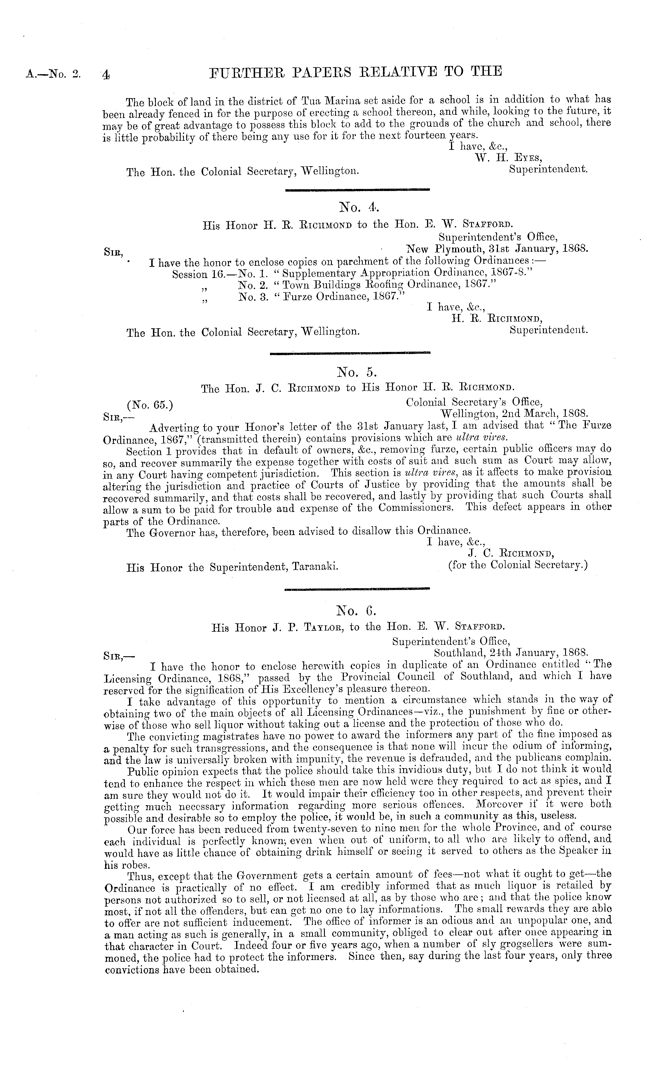 No. 4, His Honor H. R. Richmond to the Hon. E. W. Staffoed. Superintendent's Office, g IE New Plymouth, 31st January, 1868. I have the honor to enclose copies on parchment of the following Ordinances : — Session 16.—N0. 1. " Supplementary Appropriation Ordinance, 1867-8." No. 2. " Town Buildings Eoofing Ordinance, 1867." No. 3. " Furze Ordinance, 1867." I have, Ac, H. E. Richmond, The Hon. the Colonial Secretary, 'Wellington. Superintendent.