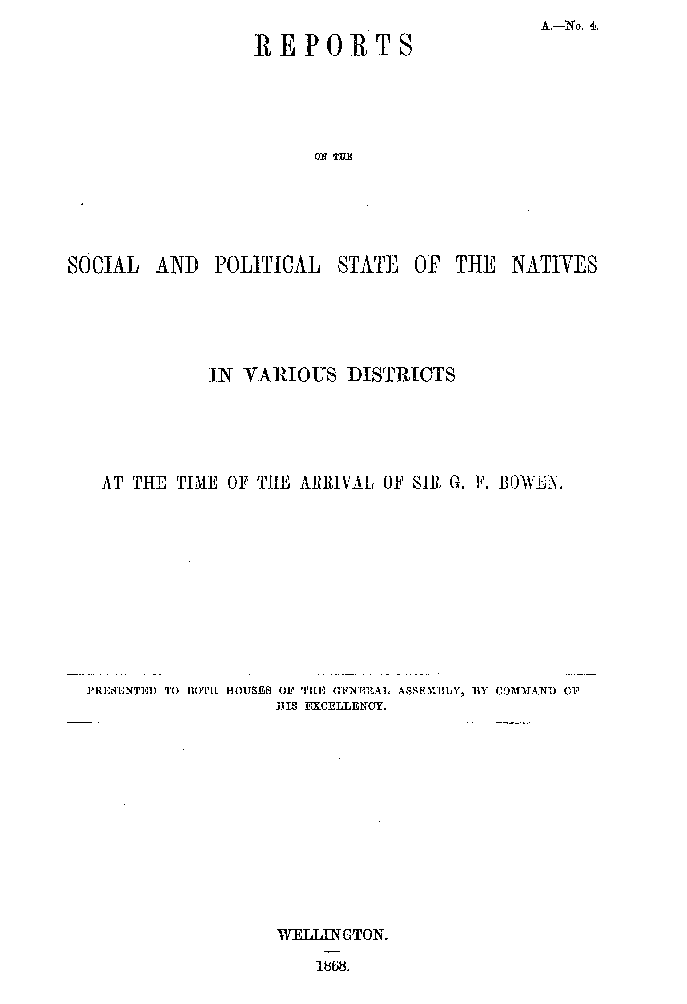REPORTS ON THE SOCIAL AND POLITICAL STATE OF THE NATIVES IN VARIOUS DISTRICTS AT THE TIME OF THE ARRIVAL OF SIR G.F. BOWEN.