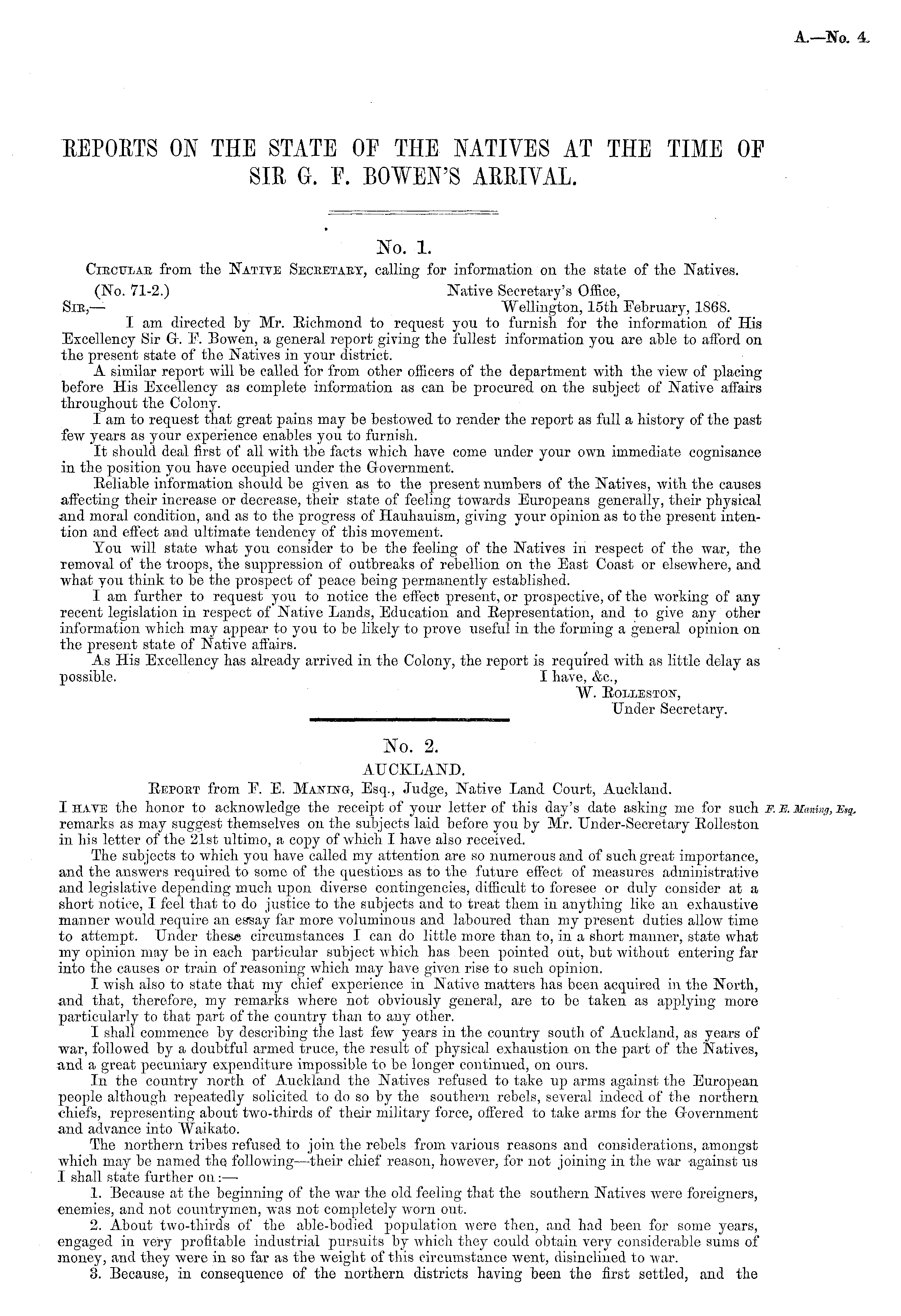 No. 1. Ciectjxab from the Native Secbetaey, calling for information on the state of the Natives. (No. 71-2.) Native Secretary's Office, Sib,— Wellington, 15th February, 1868. I am directed by Mr. Richmond to request you to furnish for the information of His Excellency Sir Or. E. Bowen, a general report giving the fullest information you are able to afford on the present state of the Natives in your district. A similar report will be called for from other officers of the department with the view of placing before His Excellency as complete information as can be procured on the subject of Native affairs throughout the Colony. I am to request that great pains may be bestowed to render the report as full a history of the past few years as your experience enables you to furnish. It should deal first of all with the facts which have come under your own immediate cognisance in the position you have occupied under the Government. Reliable information should be given as to the present numbers of the Natives, with the causes affecting their increase or decrease, their state of feeling towards Europeans generally, their physical and moral condition, and as to the progress of Hauhauism, giving your opinion as to the present intention and effect and ultimate tendency of this movement. You will state what you consider to be the feeling of the Natives in respect of the war, the removal of the troops, the suppression of outbreaks of rebellion on the East Coast or elsewhere, and what you think to be the prospect of peace being permanently established. I am further to request you to notice the effect present, or prospective, of the working of any recent legislation in respect of Native Lands, Education and Representation, and to give any other information which may appear to you to be likely to prove \iseful in the forming a general opinion on the present state of Native affairs. As His Excellency has already arrived in the Colony, the report is required with as little delay as possible. I have, &c, W. ROLLESTON", Under Secretary.