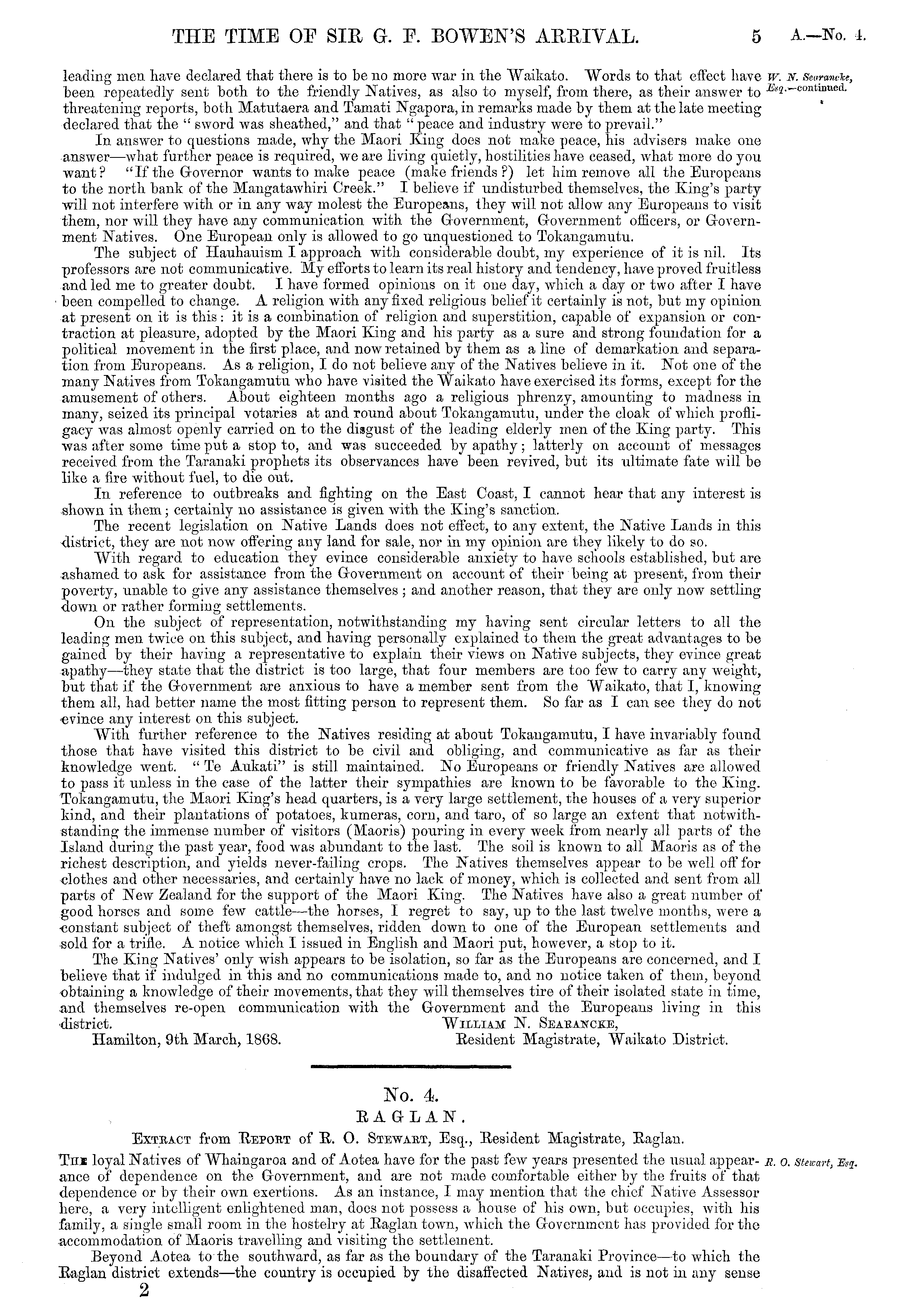 No. 4. RAGLAN. Extract from Repobt of R. O. Stewakt, Esq., Resident Magistrate, Raglan. Tni loyal Natives of Whaingaroa and of Aotea have for the past few years presented the usual appearance of dependence on the Government, and are not made comfortable either by the fruits of that dependence or by their own exertions. As an instance, I may mention that the chief Native Assessor here, a very intelligent enlightened man, does not possess a house of his own, but occupies, with his family, a single small room in the hostelry at Raglan town, which the Government has provided for the accommodation of Maoris travelling and visiting the settlement. Beyond Aotea to the southward, as far as the boundary of the Taranaki Province —to which the Raglan district extends —the country is occupied by the disaffected Natives, and is not in any sense 2