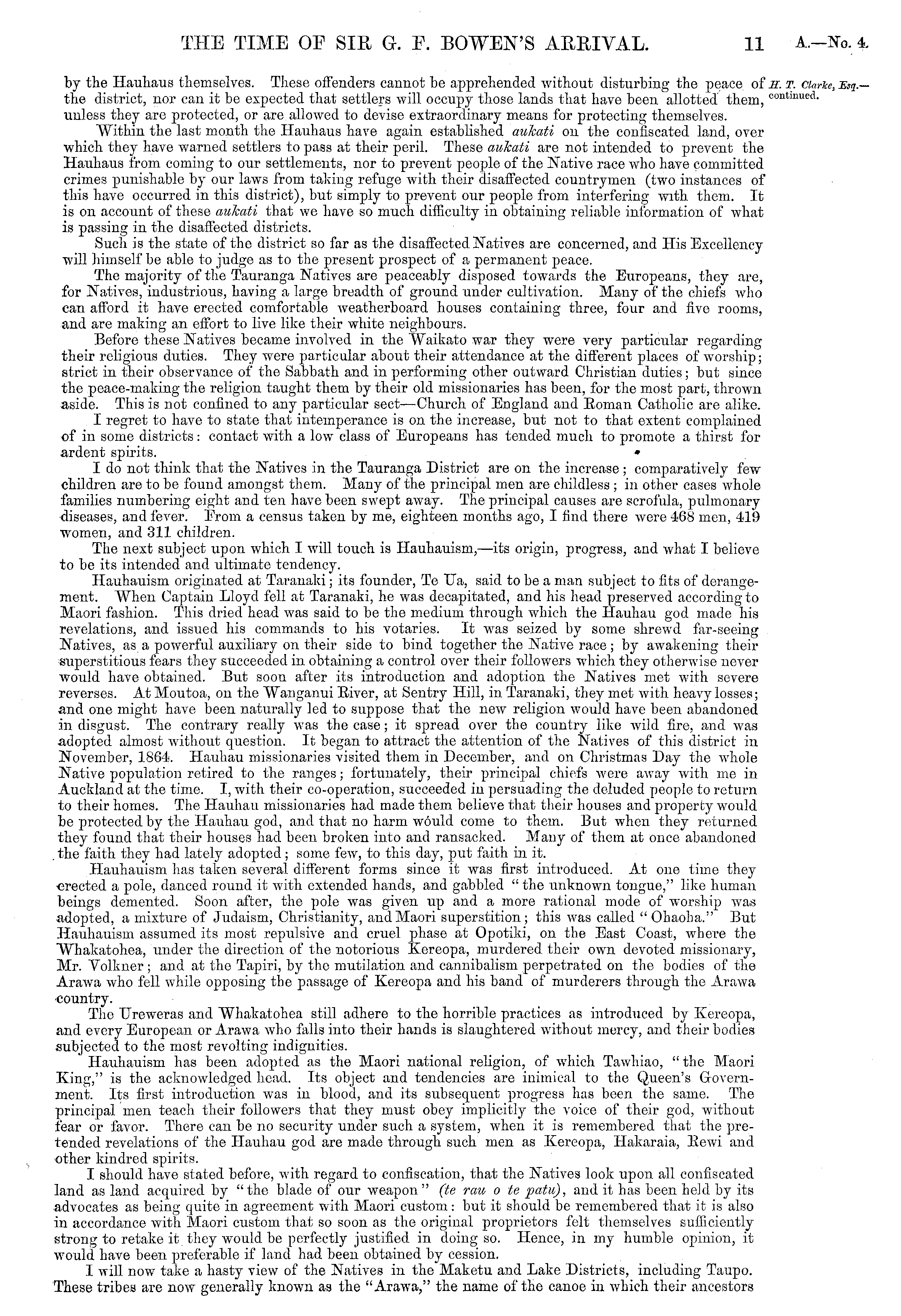 by the Hauhaus themselves. These offenders cannot be apprehended without disturbing the peace of the district, nor can it be expected that settlers will occupy those lands that have been allotted them, unless they are protected, or are allowed to devise extraordinary means for protecting themselves. Within the last month the Hauhaus have again established aulcati on the confiscated land, over which they have warned settlers to pass at their peril. These aulcati are not intended to prevent the Hauhaus from coming to our settlements, nor to prevent people of the Native race who have committed crimes punishable by our laws from taking refuge with their disaffected countrymen (two instances of this have occurred in this district), but simply to prevent our people from interfering with them. It is on account of these aulcati that we have so much difficulty in obtaining reliable information of what is passing in the disaffected districts. Such is the state of the district so far as the disaffected Natives are concerned, and His Excellency will himself be able to judge as to the present prospect of a permanent peace. The majority of the Tauranga Natives are peaceably disposed towards the Europeans, they are, for Natives, industrious, having a large breadth of ground under cultivation. Many of the chiefs who can afford it have erected comfortable weatherboard houses containing three, four and five rooms, and are making an effort to live like their white neighbours. Before these Natives became involved in the Waikato war they were very particular regarding their religious duties. They were particular about their attendance at the different places of worship; strict in their observance of the Sabbath and in performing other outward Christian duties; but since the peace-making the religion taught them by their old missionaries has been, for the most part, thrown aside. This is not confined to any particular sect —Church of England and Roman Catholic are alike. I regret to have to state that intemperance is on the increase, but not to that extent complained of in some districts: contact with a low class of Europeans has tended much to promote a thirst for ardent spirits. • Ido not think that the Natives in the Tauranga District are on the increase; comparatively few children are to bo found amongst them. Many of the principal men are childless ; in other cases whole families numbering eight and ten have been swept away. The principal causes are scrofula, pulmonary diseases, and fever. From a census taken by mo, eighteen months ago, I find there were 468 men, 419 women, and 311 children. The next subject upon which I will touch is Hauhauism, —its origin, progress, and what I believe to be its intended and ultimate tendency. Hauhauism originated at Taranaki; its founder, Te Ua, said to be a man subject to fits of derangement. When Captain Lloyd fell at Taranaki, he was decapitated, and his head preserved according to Maori fashion. This dried head was said to be the medium through which the liauhau god made his revelations, and issued his commands to his votaries. It was seized by some shrewd far-seeing Natives, as a powerful auxiliary on their side to bind together the Native race; by awakening their superstitious fears they succeeded in obtaining a control over their followers which they otherwise never would have obtained. But soon after its introduction and adoption the Natives met with severe reverses. At Moutoa, on the Wanganui River, at Sentry Hill, in Taranaki, they met with heavy losses; and one might have been naturally led to suppose that the new religion would have been abandoned in disgust. The contrary really was the case; it spread over the country like wild fire, and was adopted almost without question. It began to attract the attention of the Natives of this district in November, 1864. Hauhau missionaries visited them in December, and on Christmas Day the whole Native population retired to the ranges; fortunately, their principal chiefs were away with me in Auckland at the time. I, with their co-operation, succeeded in persuading the deluded people to return to their homes. The Hauhau missionaries had made them believe that their houses and property would be protected by the Hauhau god, and that no harm would come to them. But when they returned they found that their houses had been broken into and ransacked. Many of them at once abandoned the faith they had lately adopted; some few, to this day, put faith in it. Hauhauism has taken several different forms since it was first introduced. At one time they ■erected a pole, danced round it with extended hands, and gabbled " the unknown tongue," like human beings demented. Soon after, the pole was given up and a more rational mode of worship was adopted, a mixture of Judaism, Christianity, and Maori superstition; this was called "Ohaolia." But Hauhauism assumed its most repulsive and cruel phase at Opotiki, on the East Coast, where the Whakatohea, under the direction of the notorious Kereopa, murdered their own devoted missionary, Mr. Volkner; and at the Tapiri, by the mutilation and cannibalism perpetrated on the bodies of the Arawa who fell while opposing the passage of Kereopa and his band of murderers through the Arawa country. The TJreweras and Whakatohea still adhere to the horrible practices as introduced by Kereopa, and every European or Arawa who falls into their hands is slaughtered without mercy, and their bodies subjected to the most revolting indignities. Hauhauism has been adopted as the Maori national religion, of which Tawhiao, " the Maori King," is the acknowledged head. Its object and tendencies are inimical to the Queen's Government. Its first introduction was in blood, and its subsequent progress has been the same. The principal men teach their followers that they must obey implicitly the voice of their god, without fear or favor. There can be no security under such a system, when it is remembered that the prete
