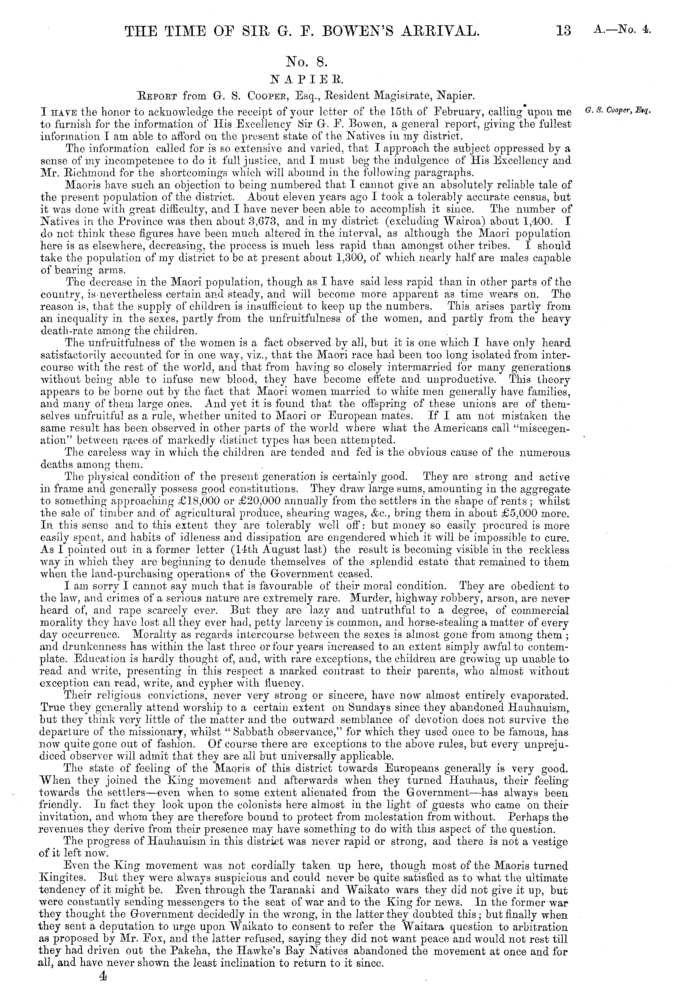No. 8. N A P I E E, Report from G. S. Coopek, Esq., Eesident Magistrate, Napier. I hate the honor to acknowledge the receipt of your letter of the 15th of February, calling upon me to furnish for the information of His Excellency Sir G. Pl. Bovven, a general report, giving the fullest information I am able to afford on the present state of the Natives in my district. The information called for is so extensive and varied, that I approach the subject oppressed by a sense of my incompetence to do it full justice, and I must beg the indulgence of His Excellency and Mr. Richmond for the shortcomings which will abound in the following paragraphs. Maoris have such an objection to being numbered that I cannot give an absolutely reliable tale of the present population of the district. About eleven years ago I took a tolerably accurate census, but it was done with great difficulty, and I have never been able to accomplish it since. The number of Natives in the Province was then about 3,673, and in my district (excluding "Wairoa) about 1,400. I do not think these figures have been much altered in the interval, as although the Maori population here is as elsewhere, decreasing, the process is much less rapid than amongst other tribes. I should take the population of my district to bo at present about 1,300, of which nearly half are males capable of bearing arms. The decrease in the Maori population, though as I have said less rapid than in other parts of the country, isnevertheless certain and steady, and will become more apparent as time wears on. The reason is, that the supply of children is insufficient to keep up the numbers. This arises partly from an inequality in the sexes, partly from the unfruitfulness of the women, and partly from the heavy death-rate among the children. The unfruitfulness of the women is a fact observed by all, but it is one which I have only heard satisfactorily accounted for in one way, viz., that the Maori race had been too long isolated from intercourse with the rest of the world, and that from having so closely intermarried for many generations without being able to infuse new blood, they have become effete and unproductive. This theory appears to be borne out by the fact that Maori women married to white men generally have families, and many of them large ones. And yet it is found that the offspring of these unions are of themselves unfruitful as a rule, whether united to Maori or European mates. If lam not mistaken the same result has been observed in other parts of the world where what the Americans call "miscegenation" between races of markedly distinct types has been attempted. The careless way in which the children are tended and fed is the obvious cause of the numerous deaths among them. The jjhysical condition of the present generation is certainly good. They are strong and active in frame and generally possess good constitutions. They draw large sums, amounting in the aggregate to something approaching £IH,OOO or £20,000 annuall} r from the settlers in the shape of rents ; whilst the sale of timber and of agricultural produce, shearing wages, &c, bring them in about £5,000 more. In this sense and to this extent they are tolerably well off: but money so easily procured is more easily spent, and habits of idleness and dissipation are engendered which it will bo impossible to cure. As I pointed out in a former letter (14th August last) the result is becoming visible in the reckless way in which they are beginning to denude themselves of the splendid estate that remained to them when the land-purchasing operations of the Government ceased. lam sorry I cannot say much that is favourable of their moral condition. They are obedient to the law, and crimes of a serious nature are extremely rare. Murder, highway robbery, arson, are never heard of, and rape scarcely ever. But they are lazy and untruthful to a degree, of commercial morality they have lost all they ever had, petty larceny is common, and horse-stealing a matter of every day occurrence. Morality as regards intercourse between the sexes is almost gone from among them ; and drunkenness has within the last three or four years increased to an extent simply awful to contemplate. Education is hardly thought of, and, with rare exceptions, the children are growing up unable to read and write, presenting in this respect a marked contrast to their parents, who almost without exception can read, write, and cypher with fluency. Their religious convictions, never very strong or sincere, have now almost entirely evaporated. True they generally attend worship to a certain extent on Sundays since they abandoned Hauhauism, but they think very little of the matter and the outward semblance of devotion does not survive the departure of the missionary, whilst " Sabbath observance," for which they used once to be famous, has now quite gone out of fashion. Of course there are exceptions to the above rules, but every unprejudiced observer will admit that they are all but universally applicable. The state of feeling of the Maoris of this district towards Europeans generally is very good. When they joined the King movement and afterwards when they turned Hauhaus, their fooling towards the settlers—even when to some extent alienated from the Government —has always been friendly. In fact they look upon the colonists here almost in the light of guests who came on their invitation, and whom they are therefore bound to protect from molestation from without. Perhaps the revenues they derive from their presence may have something to do with this aspect of the question. The progress of Hauhanism in this district was never rapid or strong, and there is not a vestige of it left now. Even the King movement was not cordially taken up here, though most of the Maoris turned Kingites. But they were always suspicious and could never be quite satisfied as to what the ultimate tendency of it might be. Even through the Taranaki and Waikato war
