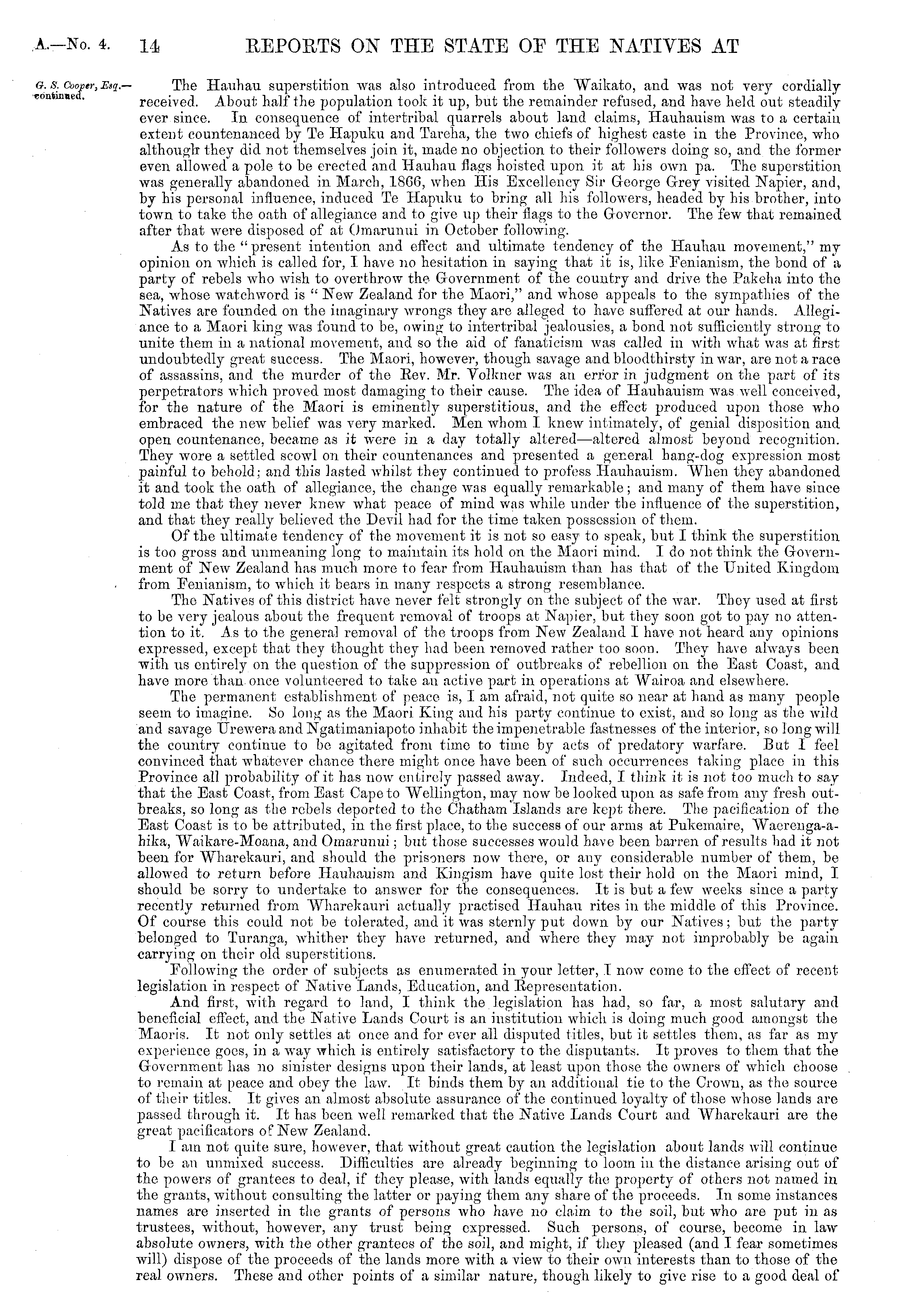 The Hauhau superstition was also introduced from the Waikato, and was not very cordially received. About half tho population took it up, but the remainder refused, and have held out steadily ever since. In consequence of intertribal quarrels about land claims, Hauhauism was to a certain extent countenanced by Te Hapuku and Taroha, the two chiefs of highest caste in the Province, who although they did not themselves join it, made no objection to their followers doing so, and the former even allowed a pole to be erected and Hauhau flags hoisted upon it at his own pa. The superstition was generally abandoned in March, 1866, when His Excellency Sir George Grey visited Napier, and, by his personal influence, induced Te Hapuku to bring all his followers, headed by his brother, into town to take the oath of allegiance and to give up their flags to tho Governor. The few that remained after that were disposed of at Omarunui in October following. As to the "present intention and effect and ultimate tendency of tho Hauhau movement," my opinion on which is called for, I have no hesitation in saying that it is, like Fenianism, the bond of a party of rebels who wish to overthrow the Government of the country and drive the Pakeha into the sea, whose watchword is " Now Zealand for the Maori," and whose appeals to the sympathies of the Natives are founded on tho imaginary wrongs they are alleged to have suffered at our hands. Allegiance to a Maori king was found to be, owing to intertribal jealousies, a bond not sufficiently strong to unite them in a national movement, and so the aid of fanaticism was called in with what was at first undoubtedly great success. The Maori, however, though savage and bloodthirsty in war, are not a race of assassins, and the murder of the Eev. Mr. Volkner was an error in judgment on the part of its perpetrators which proved most damaging to their cause. The idea of Hauhauism was well conceived, for the nature of the Maori is eminently superstitious, and the effect produced upon those who embraced the new belief was very marked. Men whom I knew intimately, of genial disposition and open countenance, became as it were in a day totally altered —altered almost beyond recognition. They wore a settled scowl on their countenances and presented a general hang-dog expression most painful to behold; and this lasted whilst they continued to profess Hauhauism. When they abandoned it and took the oath of allegiance, the change was equally remarkable ; <and many of them have since told me that they never knew what peace of mind was while under the influence of the superstition, and that they really believed tho Devil had for the time taken possession of them. Of the ultimate tendency of the movement it is not so easy to speak, but I think the superstition is too gross and unmeaning long to maintain its hold on tho Maori mind. Ido not think the Government of New Zealand has much more to fear from Hauhauism than has that of the United Kingdom from Fenianism, to which it bears in many respects a strong resemblance. Tho Natives of this district have never felt strongly on the subject of the war. They used at first to be very jealous about the frequent removal of troops at Napier, but they soon got to pay no attention to it. As to the general remov<al of the troops from New Zealand I have not heard any opinions expressed, except that they thought they had been removed rather too soon. They have always been with us entirely on the question of the suppression of outbreaks of rebellion, on the East Coast, and have more than once volunteered to take an active part in operations at Wairoa .and elsewhere. The permanent establishment of peiico is, I am afraid, not quite so near at hand as many people seem to imagine. So long as the Maori King and his party continue to exist, and so long as the wild and savage Urewera and Ngatimaniapoto inhabit the impenetrable fastnesses of the interior, so long will the country continue to be agitated from time to time by acts of predatory warfare. But I feel convinced that whatever chance there might once have been of such occurrences taking place in this Province all probability of it has now entirely passed away. Indeed, I think it is not too much to say that the East Coast, from East Cape to Wellington, may now be looked upon as safe from any fresh outbreaks, so long as the rebels deported to tho Chatham Islands are kept there. The pacification of the East Coast is to be attributed, in the first place, to tho success of our arms at Pukemaire, Waerenga-a-hika, Waikare-Moana, and Omarunui; but those successes would have been barren of results had it not been for Wharekauri, and should the prisoners now there, or any considerable number of them, be allowed to return before Hauhauism and Kingism have quite lost their hold on the Maori mind, I should be sorry to undertake to answer for the consequences. It is but a few weeks since a party recently returned from Wharekauri actually practised Hauhau rites in the middle of this Province. Of course this could not bo tolerated, and it was sternly put down by our Natives; but the party belonged to Turanga, whither they have returned, and where they may not improbably be again carrying on their old superstitions. Following the order of subjects as enumerated in your letter, I now come to the effect of recent legislation in respect of Native Lands, Education, and Eepresentation. And first, with regard to land, I think the legislation has had, so far, a most salutary and beneficial effect, and the Native Lands Court is an institution which is doing much good amongst the Maoris. It not only settles at once and for ever all disputed titles, but it settles them, as far as my experience goes, in a way which is entirely satisfactory to the disputants. It proves to them that the Government has no sinister designs upon their lands, at least upon those the owners of which choose to remain at peace and obey the law. It binds them by