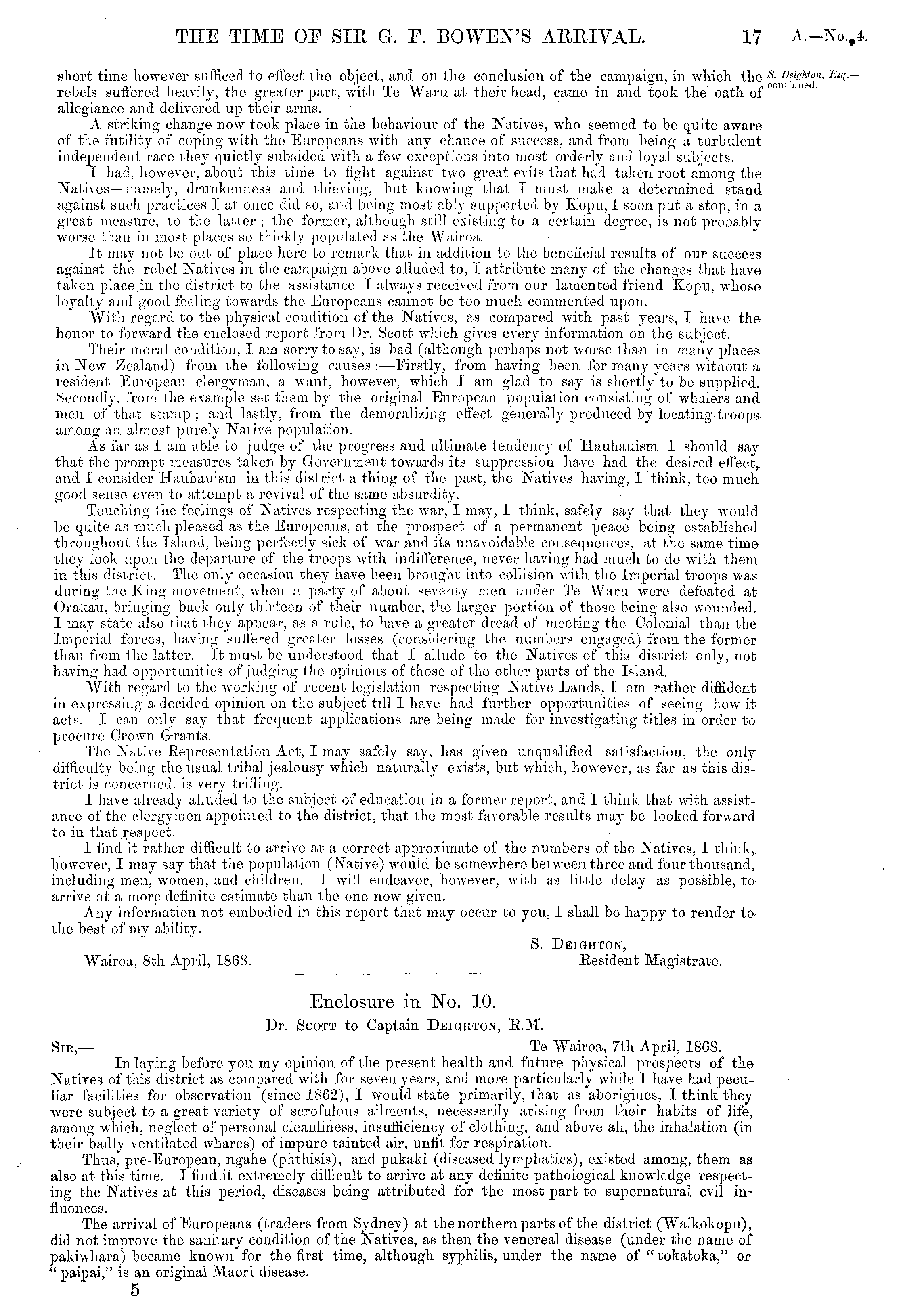 Enclosure in No. 10. Dr. Scott to Captain Deighton, E.M. Sir ,— To Wairoa, 7th April, 1868. Inlaying before you my opinion of the present health and future physical prospects of the Natives of this district as compared with for seven years, and more particularly while I have had peculiar facilities for observation (since 1862), I would state primarily, that as aborigines, 1 think they were subject to a great variety of scrofulous ailments, necessarily arising from their habits of life, among which, neglect of personal cleanliness, insufficiency of clothing, and above all, the inhalation (in their badly ventilated whares) of impure tainted air, unfit for respiration. Thus, pre-European, ngahe (phthisis), and pukaki (diseased lymphatics), existed among, them as also at this time. I find.it extremely difficult to arrive at any definite pathological knowledge respecting the Natives at this period, diseases being attributed for the most part to supernatural evil influences. The arrival of Europeans (traders from Sydney) at the northern parts of the district (Waikokopu), did not improve the sanitary condition of the Natives, as then the venereal disease (under the name of pakiwhara) became known for the first time, although syphilis, under the name of " tokatoka," or "paipai," is an original Maori disease. 5