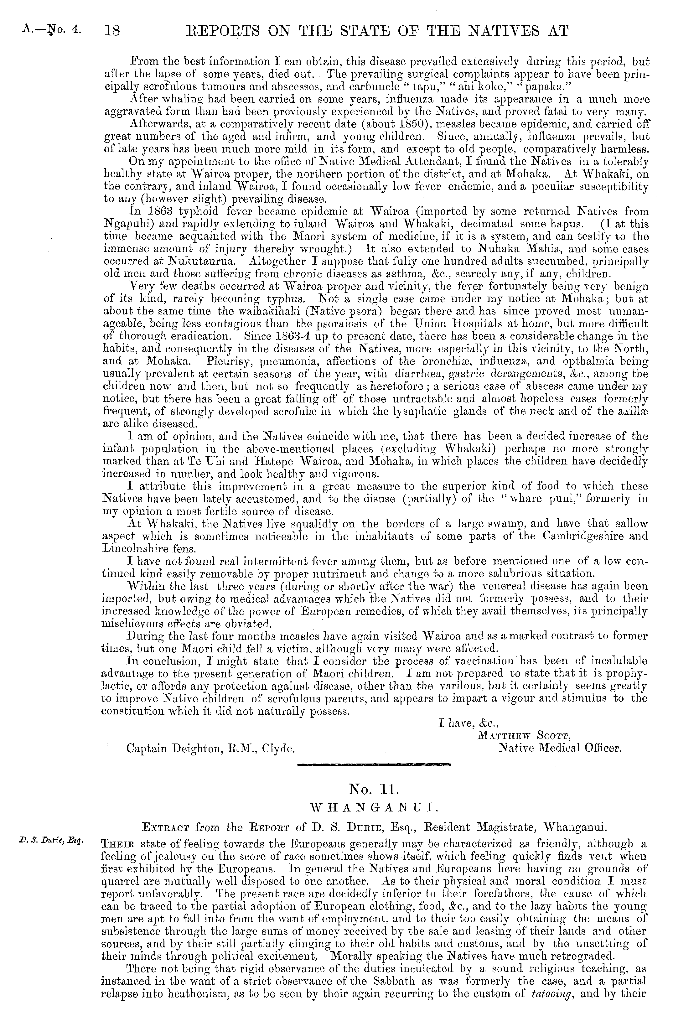 From the best information I can obtain, this disease prevailed extensively during this period, but after the lapse of some years, died out. The prevailing surgical complaints appear to have been principally scrofulous tumours and abscesses, and carbuncle " tapu," " ahi koko," " papaka." After whaling had been carried on some years, influenza made its appearance in a much more aggravated form than had been previously experienced by the Natives, and proved fatal to very many. Afterwards, at a comparatively recent date (about 1850), measles became epidemic, and carried off great numbers of the aged and infirm, and young children. Since, annually, influenza prevails, but of late years has been much more mild in its form, and except to old people, comparatively harmless. On my appointment to the office of Native Medical Attendant, I found the Natives in a tolerably healthy state at Wairoa proper, the northern portion of the district, and at Mohaka. At Whakaki, on. the contrary, and inland Wairoa, 1 found occasionally low fever endemic, and a peculiar susceptibility to any (however slight) prevailing disease. In 1863 typhoid fever became epidemic at Wairoa (imported by some returned Natives from Ngapuhi) and rapidly extending to inland Vv Tairoa and Whakaki, decimated some hapus. (I at this time became acquainted with the Maori system of medicine, if it is a system, and can testify to the immense amount of injury thereby wrought.) It also extended to Nuhaka Mahia, and some cases occurred at Nukutaurua. Altogether I suppose that fully one hundred adults succumbed, principally old men and those suffering from chronic diseases as asthma, &c, scarcely any, if any, children. Very few deaths occurred at Wairoa proper and vicinity, the fever fortunately being very benign of its kind, rarely becoming typhus. Not a single case came under my notice at Mohaka; but at about the same time the waihakihaki (Native psora) began there and has since proved most unmanageable, being less contagious than the psoraiosis of the Union Hospitals at home, but more difficult of thorough eradication. Since 1863-4 up to present date, there has been a considerable change in the habits, and consequently in the diseases of the Natives, more especially in this vicinity, to the North, and at Mohaka. Pleurisy, pneumonia, affections of the bronchia^, influenza, and opthalmia being usually prevalent at certain seasons of the year, with diarrhosa, gastric derangements, &c, among the children now and then, but not so frequently as heretofore ; a serious case of abscess came under my notice, but there has been a great falling off of those untractable and almost hopeless cases formerljr frequent, of strongly developed scrofula? in which the lysuphatic glands of the neck and of the axilla) are alike diseased. I am of opinion, and the Natives coincide with me, that there has been a decided increase of the infant population in the above-mentioned places (excluding Whakaki) perhaps no more strongly marked than at Te Uhi and Ilatepe Wairoa, and Mohaka, in which places the children have decidedly increased in number, and look healthy and vigorous. I attribute this improvement in a great measure to the superior kind of food to which these Natives have been lately accustomed, and to the disuse (partially) of the " whare puni," formerly in my opinion a most fertile source of disease. At Whakaki, the Natives live squalidly on the borders of a large swamp, and have that sallow aspect which is sometimes noticeable in the inhabitants of some parts of the Cambridgeshire and Lincolnshire fens. I have not found real intermittent fever among them, but as before mentioned one of a low continued kind easily removable by proper nutriment and change to a more salubrious situation. Within the last three years (during or shortly after the war) the venereal disease has again been imported, but owing to medical advantages which the Natives did not formerly possess, and to their increased knowledge of the power of European remedies, of which they avail themselves, its principally mischievous effects are obviated. During the last four months measles have again visited Wairoa and as a marked contrast to former times, but one Maori child fell a victim, although very many were affected. In conclusion, I might state that I consider the process of vaccination has been of inealulable advantage to the present generation of Maori children. lam not prepared to state that it is prophylactic, or affords any protection against disease, other than the varilous, but it certainly seems greatly to improve Native children of scrofulous parents, and appears to impart a vigour and stimulus to the constitution which it did not naturally possess. I have, &c, Matthew Scott, Captain Deighton, R.M., Clyde. Native Medical Officer.