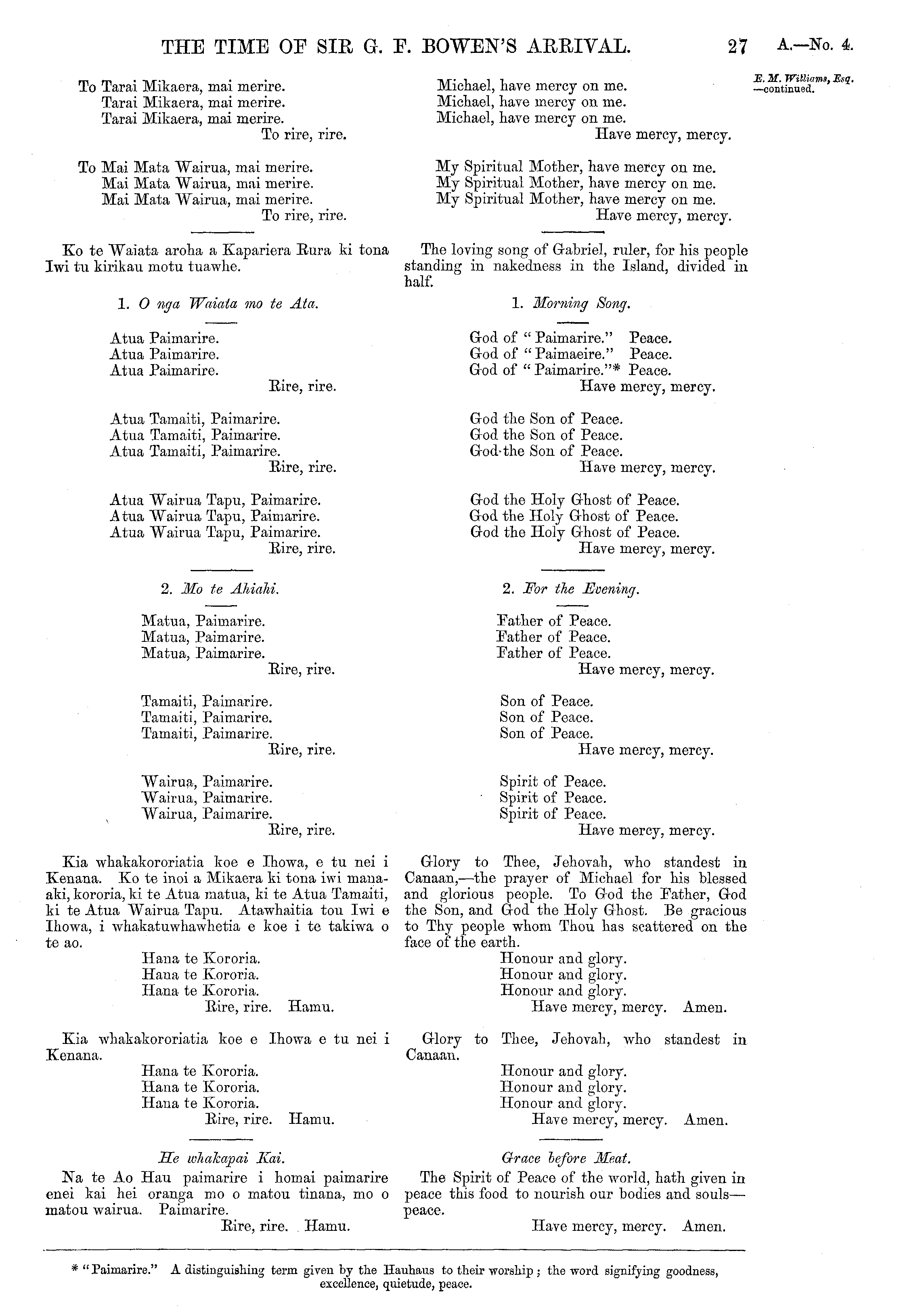 To Tarai Mikaera, mai mcrire. Michael, have mercy on me. Tarai Mikaera, mai merire. Michael, have mercy on me. Tarai Mikaera, mai merire. Michael, have mercy on me. To rire, rire. Have mercy, mercy. To Mai Mata Wairua, mai merire. My Spiritual Mother, have mercy on me. Mai Mata Wairua, mai meriro. My Spiritual Mother, have mercy on me. Mai Mata Wairua, mai meriro. My Spiritual Mother, have mercy on me. To rire, rire. Have mercy, mercy. Ko te Waiata aroha a Kapariera Eura ki tona The loving song of Gabriel, ruler, for his people Iwi tv kirikau motu tuawhe. standing in nakedness in the Island, divided in half. 1. O nga TVaiata mo to Ata. 1. Morning Song. Atua Paimarire. G-od of " Paimarire." Peace. Atua Paimarire. God of "Paimaeire." Peace. Atua Paimarire. God of " Paimarire."* Peace. Eire, rire. Have mercy, mercy. Atua Tamaiti, Paimarire. God the Son of Peace. Atua Tamaiti, Paimarire. God the Son of Peace. Atua Tamaiti, Paimarire. God the Son of Peace. Eire, rire. Have mercy, mercy. Atua Wairua Tapu, Paimarire. God the Holy Ghost of Peace. Atua Wairua Tapu, Paimarire. God the Holy Ghost of Peace. Atua Wairua Tapu, Paimarire. God the Holy Ghost of Peace. Eire, rire. Have mercy, mercy. 2. Mo te Ahiald. 2. For the Evening. Matua, Paimarire. Father of Peace. Matua, Paimarire. Father of Peace. Matua, Paimarire. Father of Peace. Eire, rire. Have mercy, mercy. Tamaiti, Paimarire. Son of Peace. Tamaiti, Paimarire. Son of Peace. Tamaiti, Paimarire. Son of Peace. Eire, rire. Have mercy, mercy. Wairua, Paimarire. Spirit of Peace. Wairua, Paimarire. ' Spirit of Peace. Wairua, Paimarire. Spirit of Peace. Eire, rire. Have mercy, mercy. Kia whakakororiatia koe c Ihowa, c tv nei i Glory to Thee, Jehovah, who standest in Kenana. Ko te inoi a Mikaera ki tona iwi mana- Canaan, —the prayer of Michael for his blessed aid, kororia, kite Atua matua, kite Atua Tamaiti, and glorious people. To God the Father, God kite Atua Wairua Tapu. Atawhaitia tou Iwi c the Son, and God the Holy Ghost. Be gracious Ihowa, i whakatuwhawhetia c koe ite takiwa o to Thy people whom Thou has scattered on the te ao. face of the earth. Hana te Kororia. Honour and glory. Hana te Kororia. Honour and glory. Hana te Kororia. Honour and glory. Eire, rire. Hamu. Have mercy, mercy. Amen. Kia whakakororiatia koo c Ihowa c tv nei i Glory to Thee, Jehovah, who standest in Kenana. Canaan. Hana te Kororia. Honour and glory. Hana te Kororia. Honour and glory. Hana te Kororia. Honour and glory. Eire, rire. Hamu. Have mercy, mercy. Amen. He wlialcapai Kai. Grace before Meat. Na te Ao Hau paimarire i homai paimarire The Spirit of Peace of the world, hath given in enei kai hei oranga mo o matou tinana, mo o peace this food to nourish our bodies and souls— matou wairua. Paimarire. peace. Eire, rire. Hamu. Have mercy, mercy. Amen. '"Paimarire." A distinguishing term given by the Hauhaus to their worship ; the ■word signifying goodness, excellence, quietude, peace.