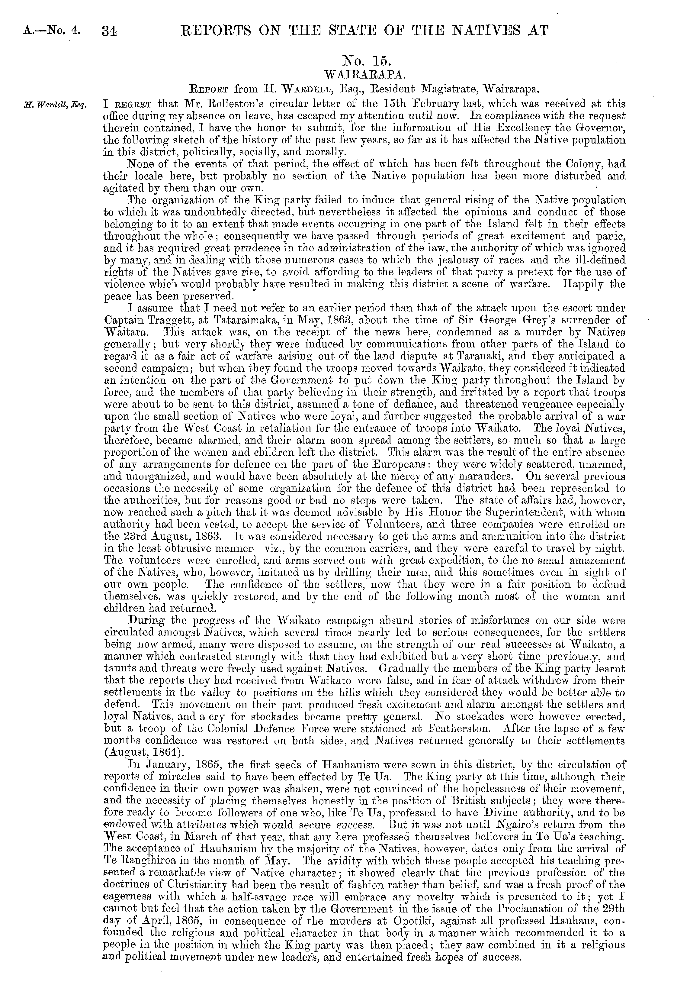 No. 15. WAIKABAPA. Report from H. Wabdeli, Esq., Resident Magistrate, Wairarapa. I eegeet that Mr. Eolleston's circular letter of the ]sth February last, which was received at this office during my absence on leave, has escaped my attention until now. In compliance with the request therein contained, I have the honor to submit, for the information of His Excellency the Governor, the following sketch of the history of the past few years, so far as it has affected the Native population in this district, politically, socially, and morally. None of the events of that period, the effect of which has been felt throughout the Colony, had their locale here, but probably no section of the Native population has been more disturbed and agitated by them than our own. The organization of the King party failed to induce that general rising of the Native population to which it was undoubtedly directed, but nevertheless it affected the opinions and conduct of those belonging to it to an extent that made events occurring in one part of the Island felt in their effects throughout the whole; consequently we have passed through periods of great excitement and panic, and it has required great prudence in the administration of the law, the authority of which was ignored by many, and in dealing with those numerous cases to which the jealousy of races and the ill-defined rights of the Natives gave rise, to avoid affording to the leaders of that party a pretext for the use of violence which would probably have resulted in making this district a scene of warfare. Happily the peace has been preserved. I assume that I need not refer to an earlier period than that of the attack upon the escort under Captain Traggctt, at Tataraimaka, in May, 1863, about the time of Sir George Grey's surrender of "VVaitara. This attack was, on the receipt of the news here, condemned as a murder by Natives generally; but very shortly they were induced by communications from other parts of the Island to regard it as a fair act of warfare arising out of the land dispute at Taranaki, and they anticipated a second campaign; but when they found the troops moved towards Waikato, they considered it indicated an intention on the part of the Government to put down the King party throughout the Island by force, and the members of that party believing in their strength, and irritated by a report that troops were about to be sent to this district, assumed a tone of defiance, and threatened vengeance especially upon the small section of Natives who were loyal, and further suggested the probable arrival of a war party from the West Coast in retaliation for the entrance of troops into Waikato. The loyal Natives, therefore, became alarmed, and their alarm soon spread among the settlers, so much so that a large proportion of the women and children left the district. This alarm was the result of the entire absence of any arrangements for defence on the part of the Europeans: they were widely scattered, unarmed, and unorganized, and would have been absolutely at the mercy of any marauders. On several previous occasions the necessity of some organization for the defence of this district had been represented to the authorities, but for reasons good or bad no steps were taken. The state of affairs had, however, now reached such a pitch that it was deemed advisable by His Honor the Superintendent, with whom authority had been vested, to accept the service of Volunteers, and three companies were enrolled on the 23rd August, 1863. It was considered necessary to get the arms and ammunition into the district in the least obtrusive manner —viz., by the common carriers, and they were careful to travel by night. The volunteers were enrolled, and arms served out with great expedition, to the no small amazement of the Natives, who, however, imitated us by drilling their men, and this sometimes even in sight of our own people. The confidence of the settlers, now that they wore in a fair position to defend themselves, was quickly restored, and by the end of the following month most of the women and children had returned. During the progress of the Waikato campaign absurd stories of misfortunes on our side were circulated amongst Natives, which several times nearly led to serious consequences, for the settlers being now armed, many were disposed to assume, on the strength of our real successes at Waikato, a manner which contrasted strongly with that they had exhibited but a very short time previously, and taunts and threats were freely used against Natives. Gradually the members of the King party learnt that the reports they had received from Waikato were false, and in fear of attack withdrew from their settlements in the valley to positions on the hills which they considered they would be better able to defend. This movement on their part produced fresh excitement and alarm amongst the settlers and loyal Natives, and a cry for stockades became pretty general. No stockades were however erected, but a troop of the Colonial Defence Eorce were stationed at Featherston. After the lapse of a few months confidence was restored on both sides, and Natives returned generally to their settlements (August, 1864). In January, 1865, the first seeds of Hauhauism were sown in this district, by the circulation of reports of miracles said to have been effected by Te Ua. The King party at this time, although their ■confidence in their own power was shaken, were not convinced of the hopelessness of their movement, and the necessity of placing themselves honestly in the position of British subjects; they were therefore ready to become followers of one who, like Te Ua, professed to have Divine authority, and to be endowed with attributes which would secure success. 13ut it was not until Ngairo's return from the West Coast, in March of that year, that any here professed themselves believers in Te TJa's teaching. The acceptance of Hauhauism by the majority of the Natives, however, dates o