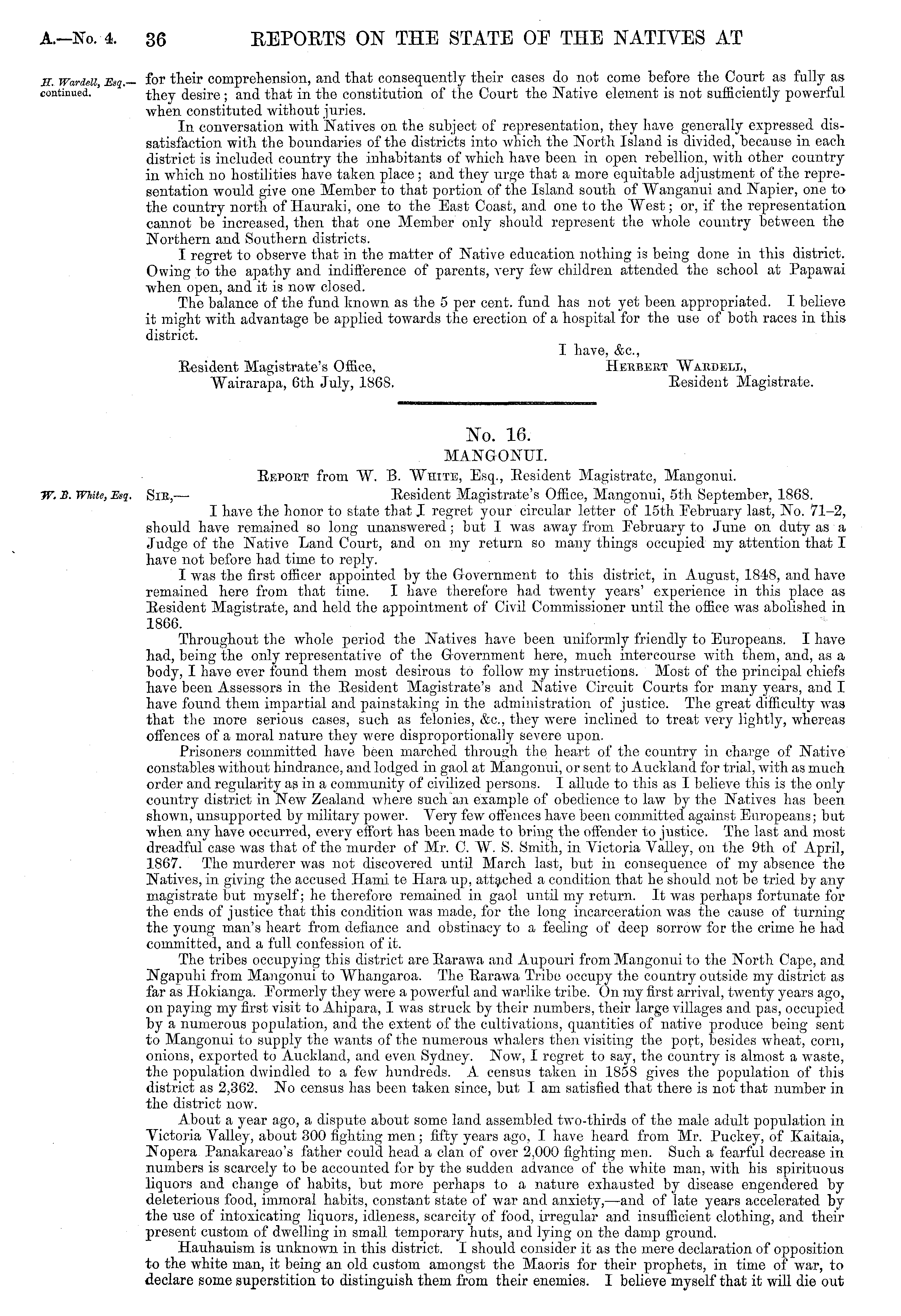 No. 16. MANGONUI. Eepokt from "W. B. "White, Esq., Eesident Magistrate, Mangonui. Sic, — Resident Magistrate's Office, Mangonui, sth September, 186 S. I have the honor to state that J regret your circular letter of 15th February last, No. 71-2, should have remained so long unanswered; but I was away from February to June on duty as a Judge of the Native Land Court, and on my return so many things occupied my attention that I have not before had time to reply. I was the first officer appointed by the Government to this district, in August, 184S, and have remained here from that time. I have therefore had twenty years' experience in this place as Eesident Magistrate, and held the appointment of Civil Commissioner until the office was abolished in 1860. Throughout the whole period the Natives have been uniformly friendly to Europeans. I have had, being the only representative of the Government here, much, intercourse with them, and, as a body, I have ever found them most desirous to follow my instructions. Most of the principal chiefs have been Assessors in the Eesident Magistrate's and Native Circuit Courts for many years, and I have found them impartial and painstaking in the administration of justice. The great difficulty was that the more serious cases, such as felonies, &c, they were inclined to treat very lightly, whereas offences of a moral nature they were disproportionally severe upon. Prisoners committed have been marched through the heart of the country in charge of Native constables without hindrance, and lodged in gaol at Mangonui, or sent to Auckland for trial, with as much order and regularity as in a community of civilized persons. I allude to this as I believe this is the only country district in New Zealand where such an example of obedience to law by the Natives has been shown, unsupported by military power. Very few offences have been committed against Europeans; but when any have occurred, every effort has been made to bring the offender to justice. The last and most dreadful case was that of the murder of Mr. C. "W. S. Smith, in Victoria Valley, on the 9th of April, 18G7. The murderer was not discovered until March last, but in consequence of my absence the Natives, in giving the accused Hami te Hara up, attached a condition that he should not be tried by any magistrate but myself; he therefore remained in gaol until my return. It was perhaps fortunate for the ends of justice that this condition was made, for the long incarceration was the cause of turning the young man's heart from defiance and obstinacy to a feeling of deep sorrow for the crime he had committed, and a full confession of it. The tribes occupying this district are Earawa and Aupouri from Mangonui to the North Cape, and Ngapuhi from Mangonui to Whangaroa. The Earawa Tribe occupy the county outside my district as far as Hokianga. Formerly they were a powerful and warlike tribe. On my first arrival, twenty years ago, on paying my first visit to Ahipara, I was struck by their numbers, their large villages and pas, occupied by a numerous population, and the extent of the cultivations, quantities of native produce being sent to Mangonui to supply the wants of the numerous whalers then visiting the port, besides wheat, corn, onions, exported to Auckland, and even Sydney. Now, I regret to say, the country is almost a waste, the population dwindled to a few hundreds. A census taken in 1858 gives the population of this district as 2,362. No census has been taken since, but lam satisfied that there is not that number in the district now. About a year ago, a dispute about some land assembled two-thirds of the male adult population in Victoria Valley, about 300 fighting men; fifty years ago, I have heard from Mr. Puckey, of Kaitaia, Nopera Panakareao's father could head a clan of over 2,000 fighting men. Such a fearful decrease in numbers is scarcely to be accounted for by the sudden advance of the white man, with his spirituous liquors and change of habits, but more perhaps to a nature exhausted by disease engendered by deleterious food, immoral habits, constant state of war and anxiety, —and of late years accelerated by the use of intoxicating liquors, idleness, scarcity of food, irregular and insufficient clothing, and their present custom of dwelling in small temporary huts, and lying on the damp ground. Hauhauism is unknown in this district. I should consider it as the mere declaration of opposition to the white man, it being an old custom amongst the Maoris for their prophets, in time of war, to declare some superstition to distinguish them from their enemies. I believe myself that it will die out