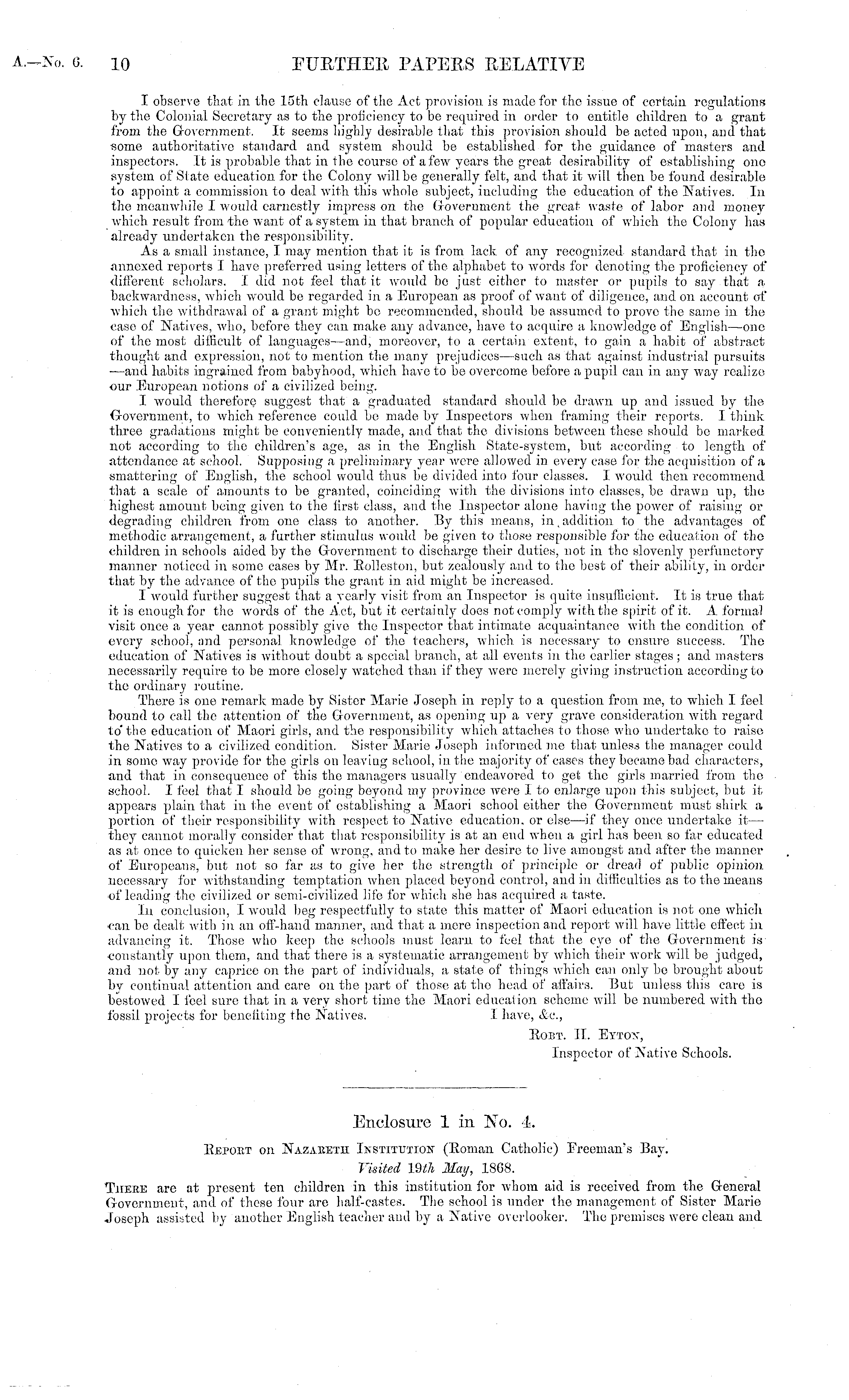 Enclosure 1 in Nq. 4. Eepokt on Hazabbxh Ixstitutiox (Koman Catholic) Freeman's Bay. Visited 19th May, 1868. Tjieke are at present ten children in this institution for whom aid is received from the General Government, and of these four are half-castes. The school is under the management of Sister Marie Joseph assisted by another English teacher and by a Native overlooker. The premises were clean and