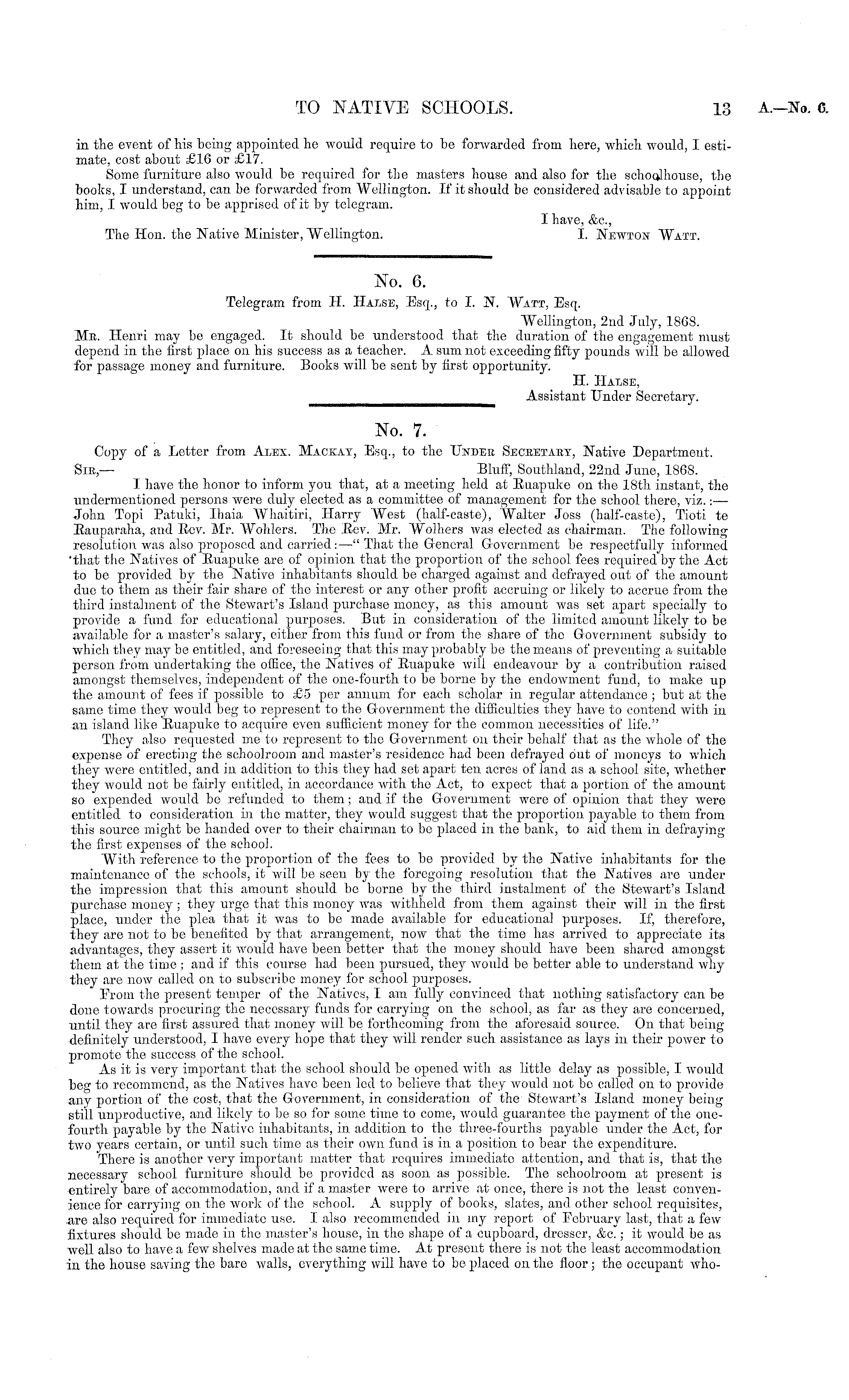 No. 7. Copy of a Letter from Alex. Mackay, Esq., to the Under Secbetaey, Native Department. Sir,— Bluff, Southland, 22nd June, 1368. I have the honor to inform you that, at a meeting held at Ruapuke on the 18th instant, the undermentioned persons were duly elected as a committee of management for the school there, viz.:— John Topi Patuki, Ihaia AVhaitiri, Harry "West (half-caste), Walter Joss (half-caste), Tioti te Rauparaha, and Rev. Mr. "Wohlers. The Rev. Mr. "Wolhers was elected as chairman. The following resolution was also proposed and carried: —" That the General Government be respectfully informed 'that the Natives of Ruapuko are of opinion that the proportion of the school fees required by the Act to be provided by the Native inhabitants should be charged against and defrayed out of the amount due to them as their fair share of the interest or any other profit accruing or likely to accrue from the third instalment of the Stewart's Island purchase money, as this amount was set apart specially to provide a fund for educational purposes. But in consideration of the limited amount likely to be available for a master's salary, either from this fund or from the share of the Government subsidy to which they may be entitled, and foreseeing that this may probably be the means of preventing a suitable person from undertaking the office, the Natives of Ruapuke will endeavour by a contribution raised amongst themselves, independent of the one-fourth to be borne by the endowment fund, to make up the amount of fees if possible to £5 per annum for each scholar in regular attendance ; but at the same time they would beg to represent to the Government the difficulties they have to contend with in an island like Ruapuke to acquire even sufficient money for the common necessities of life." They also requested me to represent to the Government on their behalf that as the whole of the expense of erecting the schoolroom and master's residence had been defrayed out of moneys to which they were entitled, and in addition to this they had set apart ten acres of land as a school site, whether they would not be fairly entitled, in accordance with the Act, to expect that a portion of the amount so expended would be refunded to them; and if the Government were of opinion that they were entitled to consideration in the matter, they would suggest that the proportion payable to them from this source might be handed over to their chairman to be placed in the bank, to aid them in defraying the first expenses of the school. "With reference to the proportion of the fees to be provided by the Native inhabitants for the maintenance of the schools, it will be seen by the foregoing resolution that the Natives are under the impression that this amount should bo borne by the third instalment of the Stewart's Island purchase money ; they urge that this money was withheld from them against their will in the first place, under the plea that it was to bo made available for educational purposes. If, therefore, they are not to bo benefited by that arrangement, now that the time has arrived to appreciate its advantages, they assert it would have been better that the money should have been shared amongst them at the time ; and if this course had been pursued, they would be better able to understand why they are now called on to subscribe money for school purposes. From the present temper of the Natives, I am fully convinced that nothing satisfactory can bo done towards procuring the necessary funds for carrying on the school, as far as they are concerned, until they are first assured that money will be forthcoming from the aforesaid source. On that being definitely understood, I have every hope that they will render such assistance as lays in their power to promote the success of the school. As it is very important that the school should be opened with as little delay as possible, I would beg to recommend, as the Natives have been led to believe that they would not be called on to provide any portion of the cost, that the Government, in consideration of the Stewart's Island money being still unproductive, and likely to bo so for some time to come, would guarantee the payment of the onefourth payable by the Native inhabitants, in. addition to the three-fourths payable under the Act, for two years certain, or until such time as their own fund is in a position to bear the expenditure. There is another very important matter that requires immediate attention, and that is, that the necessary school furniture should be provided as soon as possible. The schoolroom at present is entirely bare of accommodation, and if a master were to arrive at once, there is not the least convenience for carrying on the work of the school. A supply of books, slates, and other school requisites, are also required for immediate use. I also recommended in my report of February last, that a few fixtures should be made in the master's house, in the shape of a cupboard, dresser, &c.; it would be as well also to have a few shelves made at the same time. At present there is not the least accommodation in the house saving the bare walls, everything will have to be placed on the floor; the occupant who-