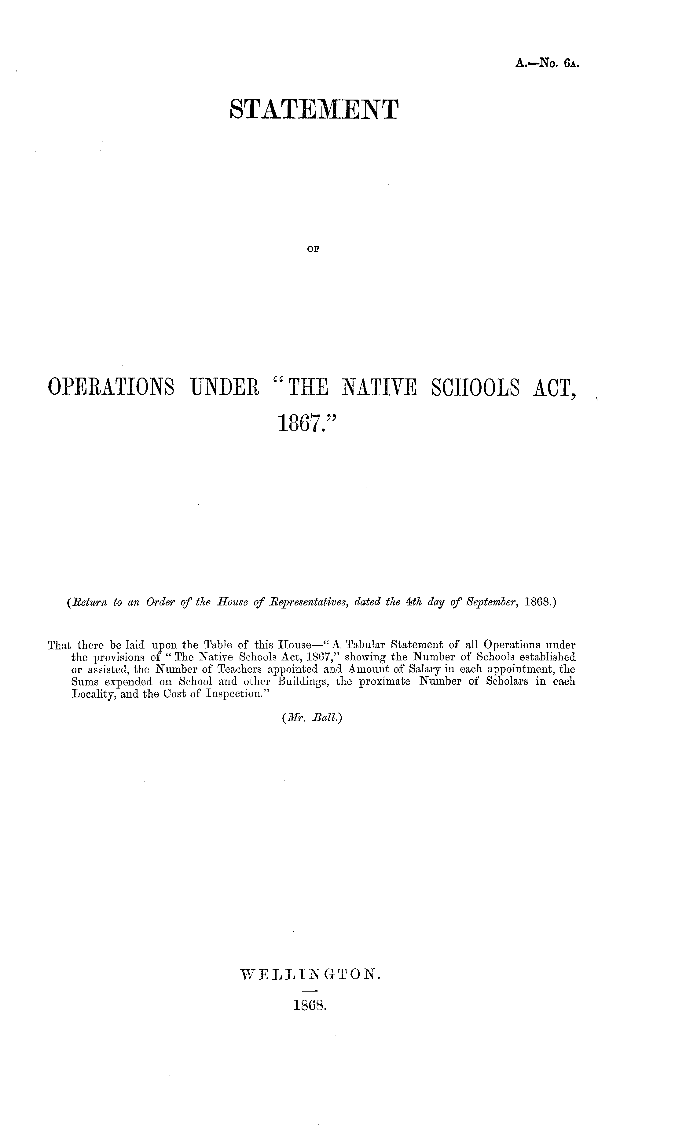 That there be laid upon the Table of this House—" A Tabular Statement of all Operations under the provisions of " The Native Schools Act, 1867," showing the Number of Schools established or assisted, the Number of Teachers appointed and Amount of Salary in each appointment, the Sums expended on School and other Buildings, the proximate Number of Scholars in each Locality, and the Cost of Inspection." {Mr. Ball.)