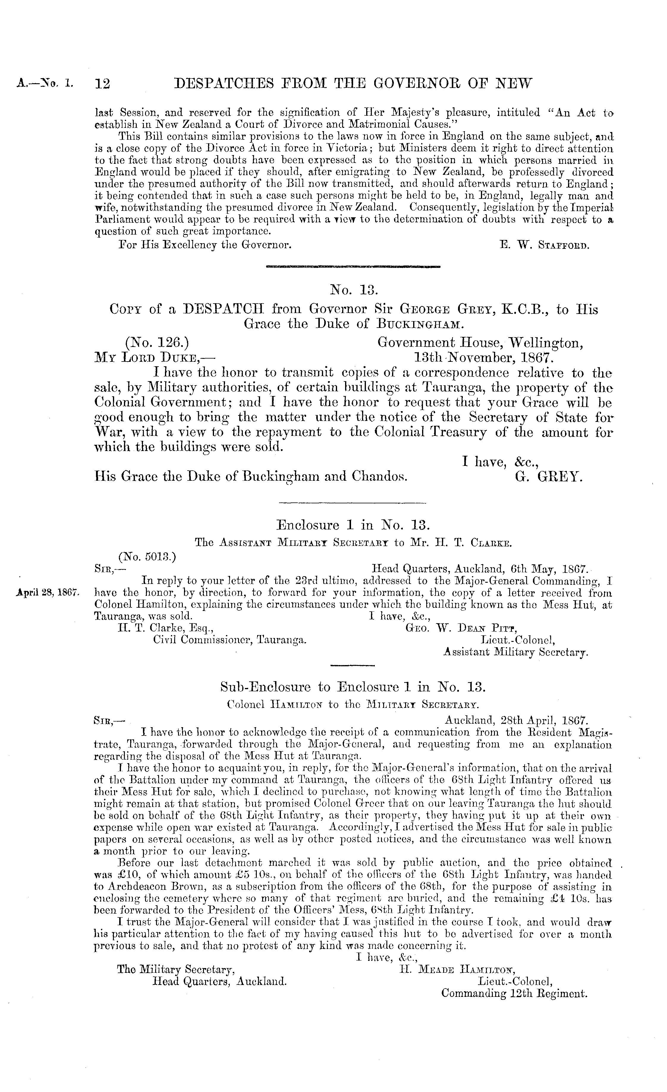 No. 13. Copy of a DESPATCH from Governor Sir George Grey, X.C.8., to His Grace the Duke of Buckingham. (No. 126.) Government House, Wellington, My Loud Duke, — 13th November, 1867. I have the honor to transmit copies of a correspondence relative to the sale, by Military authorities, of certain buildings at Tauranga, the property of the Colonial Government; and I have the honor to request that your Grace will be good enough to bring the matter under the notice of the Secretary of State for War, with a view to the repayment to the Colonial Treasury of the amount for which the buildings were sold. I have, &c, His Grace the Duke of Buckingham and Chandos. G. GREY.