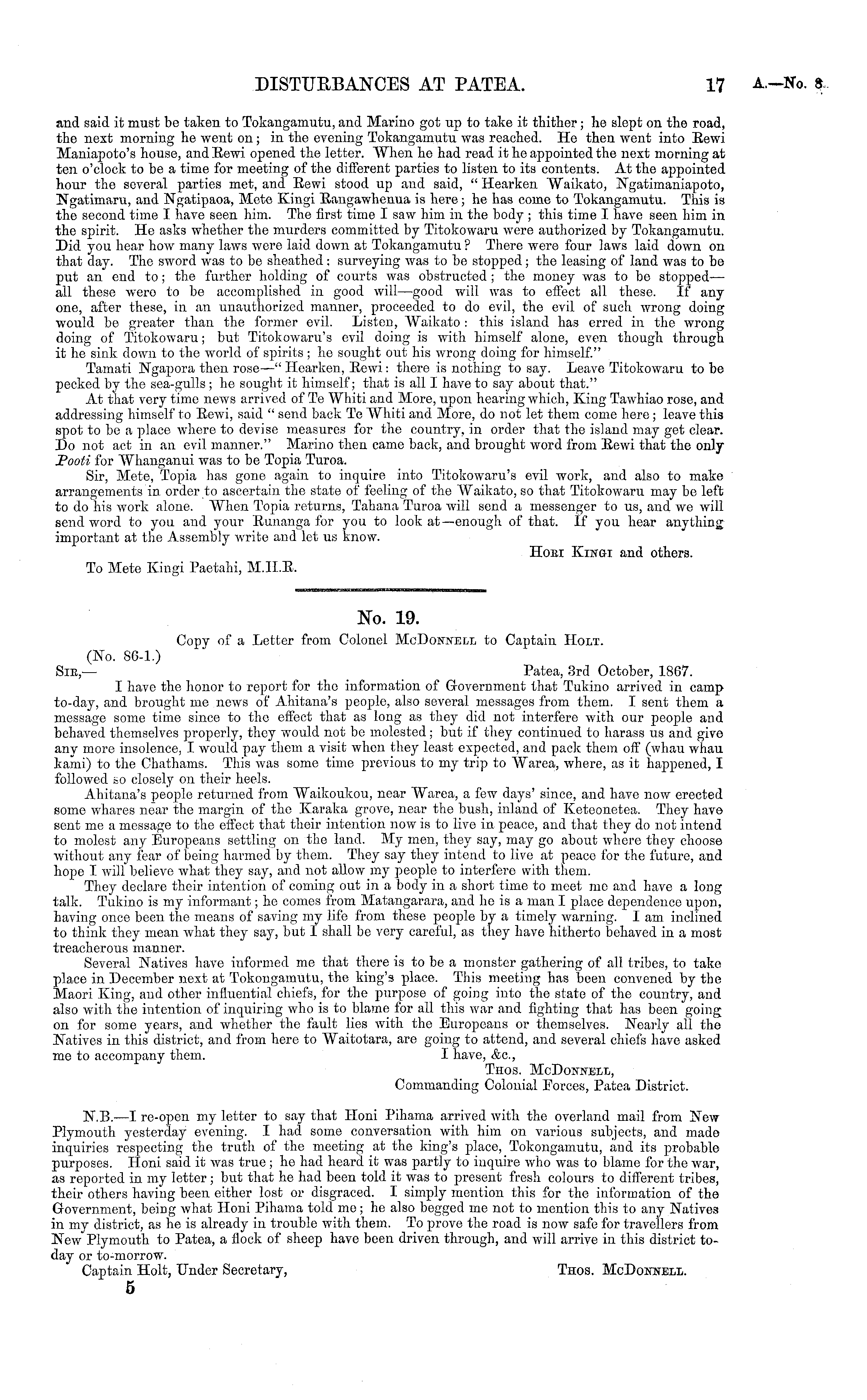 No. 19. Copy of a Letter from Colonel McDonnell to Captain Holt. (No. 86-1.) Sic,— Patea, 3rd October, 1867. I have the honor to report for tho information of Government that Tukino arrived in camp to-day, and brought me news of Ahitana's people, also several messages from them. I sent them a message some time since to tho effect that as long as they did not interfere with our people and behaved themselves properly, they would not be molested; but if they continued to harass us and give any more insolence, I would pay them a visit when they least expected, and pack them off (whau whau kami) to the Chathams. This was some time previous to my trip to Warea, where, as it happened, I followed so closely on their heels. Ahitana's people returned from Waikoukou, near Warea, a few days' since, and have now erected some whares near the margin of tho Karaka grove, near the bush, inland of Keteonetea. They have sent me a message to the effect that their intention now is to live in peace, and that they do not intend to molest any Europeans settling on the land. My men, they say, may go about where they choose without any fear of being harmed by them. They say they intend to live at peace for the future, and hope I will believe what they say, and not allow my people to interfere with them. They declare their intention of coming out in a body in a short time to meet me and have a long talk. Tukino is my informant; he comes from Matangarara, and ho is a man I place dependence upon, having once been the means of saving my life from these people by a timely wrarning. I am. inclined to think they mean what they say, but I shall be very careful, as they have hitherto behaved in a most treacherous manner. Several Natives have informed me that there is to be a monster gathering of all tribes, to take place in December next at Tokongamutu, the king's place. This meeting has been convened by the Maori King, and other influential chiefs, for the purpose of going into the state of the country, and also with the intention of inquiring who is to blame for all this war and fighting that has been going on for some years, and whether the fault lies with the Europeans or themselves. Nearly all the Natives in this district, and from hero to Waitotara, aro going to attend, and several chiefs have asked me to accompany them. I have, &c, Thos. McDonnell, Commanding Colonial Forces, Patea District. N. 8.—1 re-open my letter to say that Honi Pihama arrived with the overland mail from New Plymouth yesterday evening. I had some conversation with him on various subjects, and made inquiries respecting the truth of the meeting at the king's place, Tokongamutu, and its probable purposes. Honi said it was true ; he had heard it was partly to inquire who was to blame for tho war, as reported in my letter ; but that he had been told it was to present fresh colours to different tribes, their others having been either lost or disgraced. I simply mention this for the information of the Government, being what Honi Pihama told me; he also begged me not to mention this to any Natives in my district, as he is already in trouble with them. To prove the road is now safe for travellers from New Plymouth to Patea, a flock of sheep have been driven through, and will arrive in this district today or to-morrow. Captain Holt, Under Secretary, Thos. McDonnell. 5