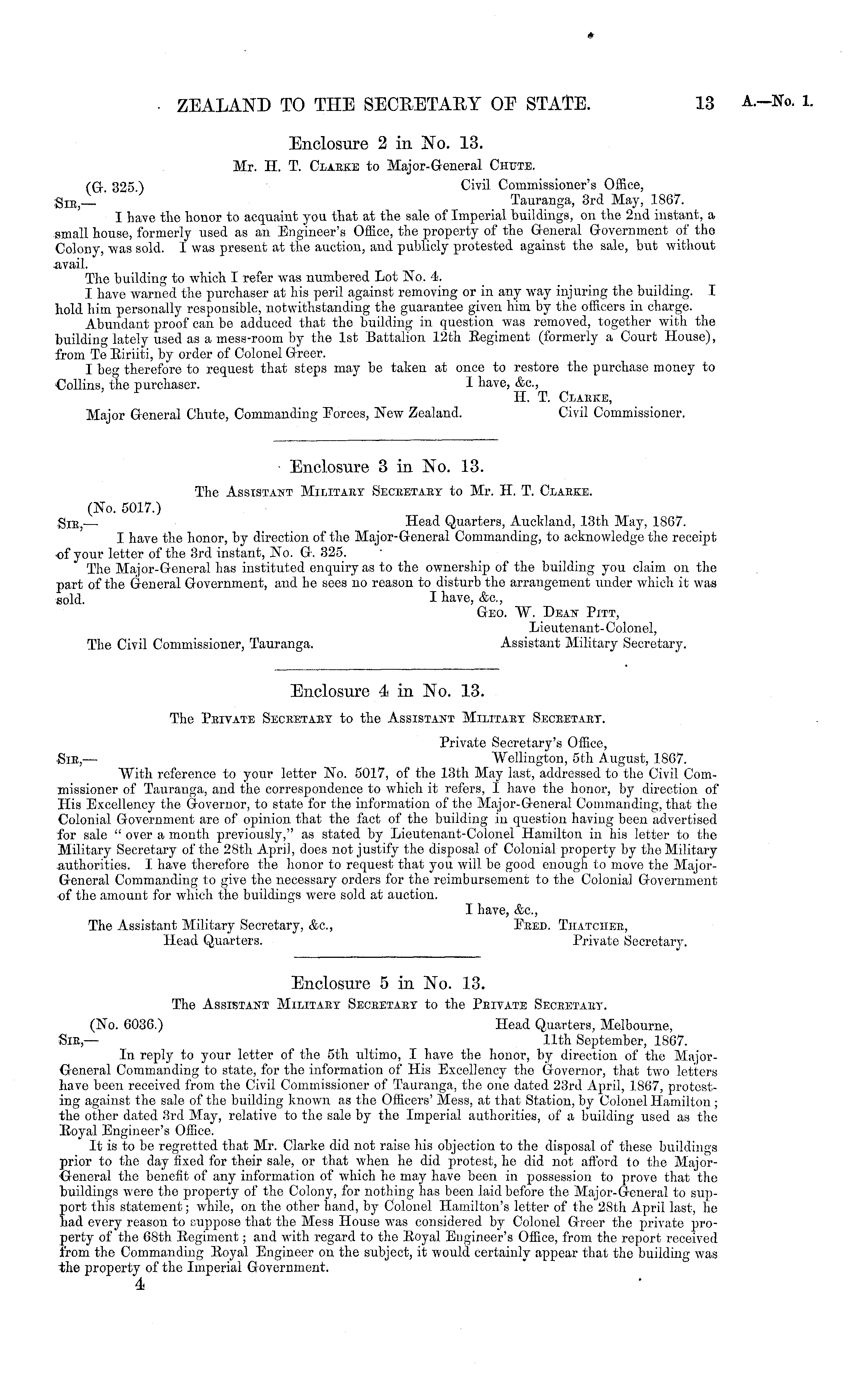 Enclosure 4 in No. 13. The Private Secretary to the Assistant Military Secretart. Private Secretary's Office, Sir,— "Wellington, sth August, 1867. "With reference to your letter No. 5017, of the 13th May last, addressed to the Civil Commissioner of Tauranga, and the correspondence to which it refers, I have the honor, by direction of His Excellency the Governor, to state for the information of the Major-General Commanding, that the Colonial Government are of opinion that the fact of the building in question having been advertised for sale " over a month previously," as stated by Lieutenant-Colonel Hamilton in his letter to the Military Secretary of the 28th April, does not justify the disposal of Colonial property by the Military authorities. I have therefore the honor to request that you will be good enough to move the MajorGeneral Commanding to give the necessary orders for the reimbursement to the Colonial Government of the amount for which the buildings were sold at auction. I have, &c, The Assistant Military Secretary, &c, Feed. Thatcher, Head Quarters. Private Secretary.