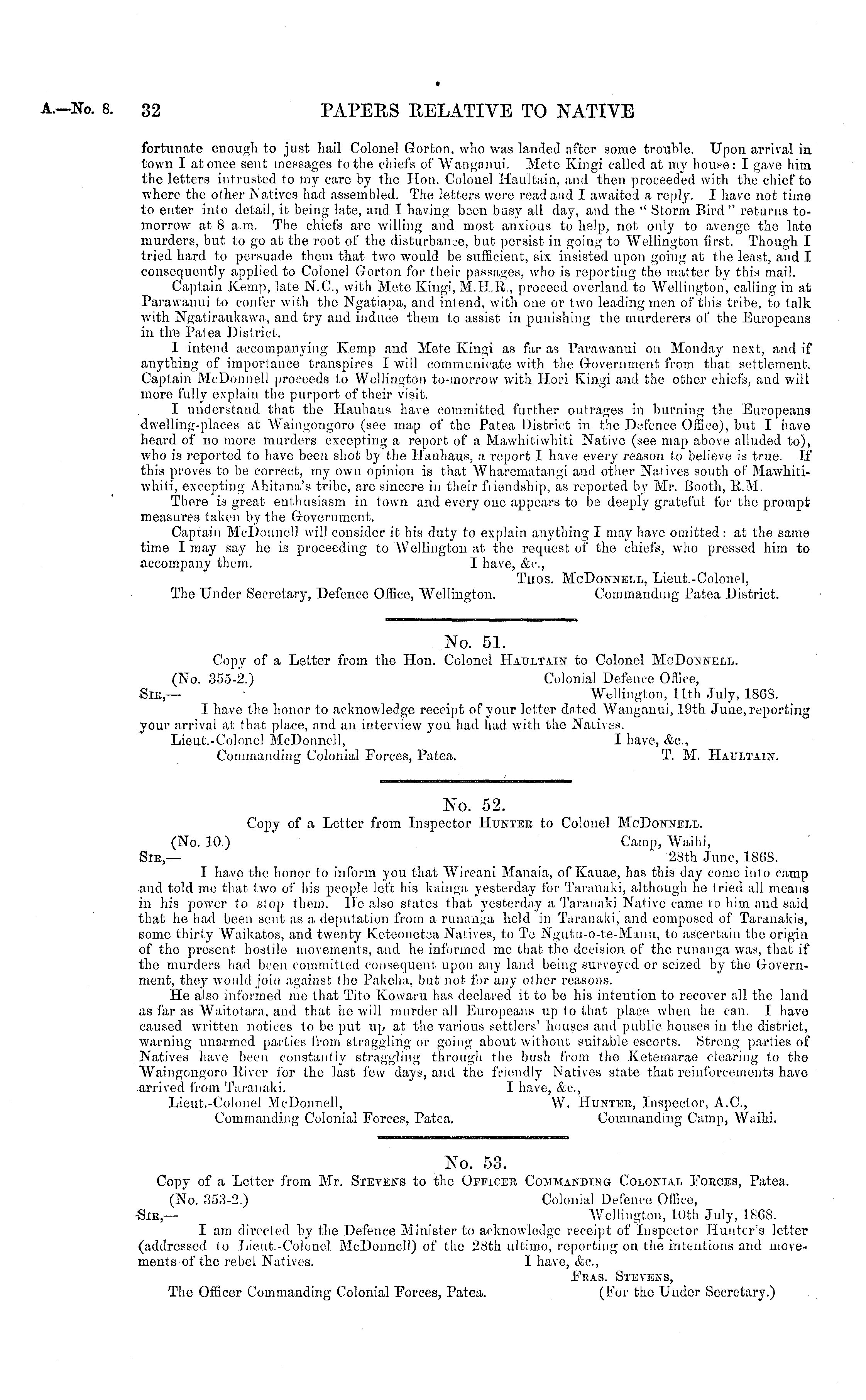 No. 52. Copy of a Letter from Inspector Huntee to Colonel McDonnell. (No. 10.) Camp, Waihi, Sic,— 28th June, 1868. I have the honor to inform you that Wireani Manaia, of Kauae, has this day come into camp and told me that two of his people left his kainga yesterday for Taranaki, although he tried all means in his power to slop them. He also states that yesterday a Taranaki Native came to him and said that he bad been sent as a deputation from a runanga held in Taranaki, and composed of Taranakis, some thirty Waikatos, and twenty Keteonetea Natives, to Te Ngutu-o-te-Manu, to ascertain the origin of the present hostile movements, and he informed me that the decision of the runanga was, that if tho murders had been committed consequent upon any land being surveyed or seized by the Government, they would join against the Pakeha, but not for any other reasons. He also informed me that Tito Kowaru has declared it to be his intention to recover all the land as far as Waitotara, and that he will murder all Europeans up to that place when he can. I have caused written notices to be put up at the various settlers' houses and public houses in the district, warning unarmed parties from straggling or going about without suitable escorts. Strong parlies of Natives have been constantly straggling through the bush from the Ketemarae clearing to the Waingongoro Biver for the last few days, and the friendly Natives state that reinforcements have arrived from Taranaki. I have, &c, Lieut.-Colonel McDonnell, W. Huntee, Inspector, A.C, Commanding Colonial Forces, Patea. Commanding Camp, Waihi.