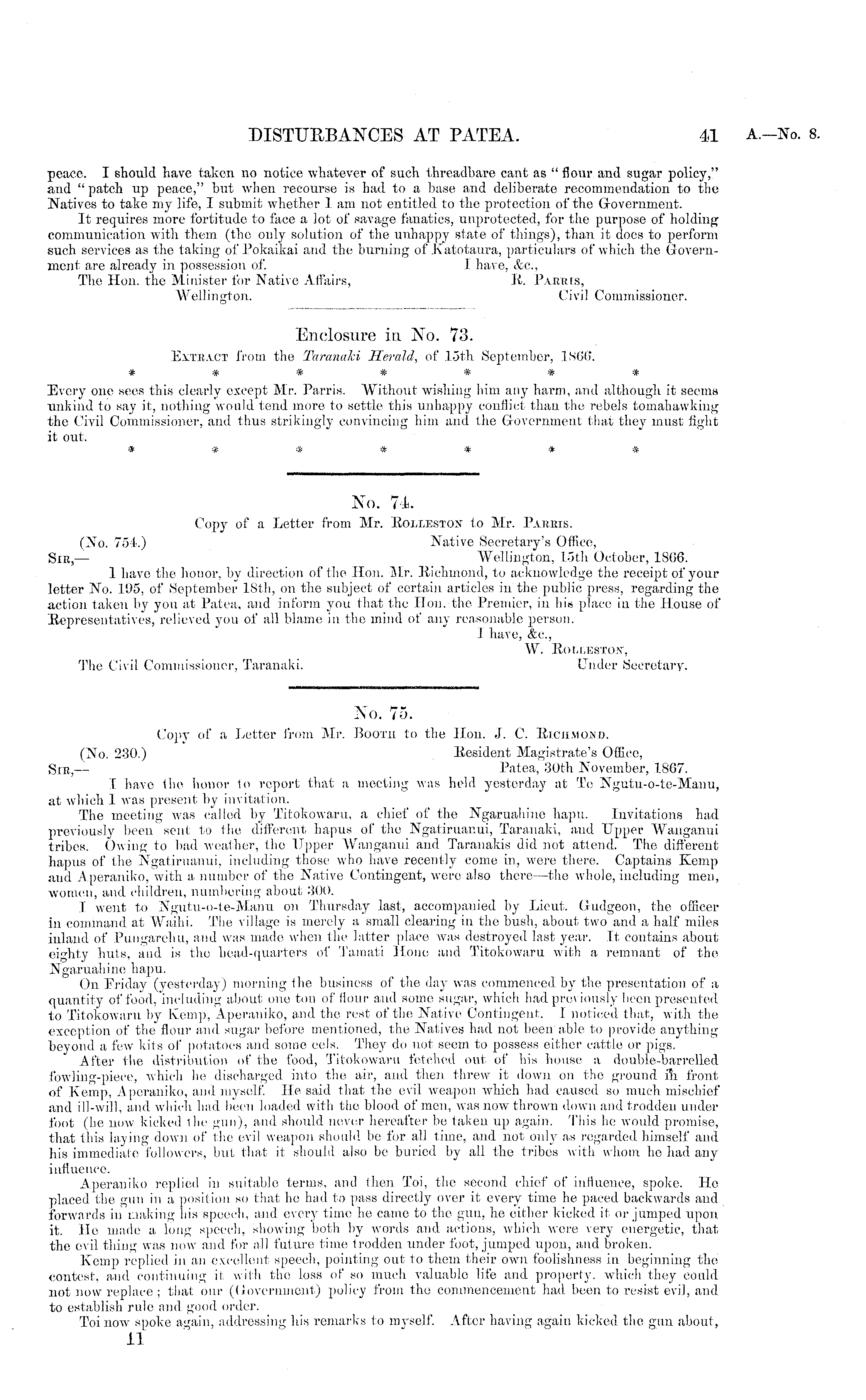 Enclosure in No. 73. Extract from tho Taranaki Herald, of 15th September, 1866. ******* Every one sees this clearly except Mr. Parris. Without wishing him any harm, and although it seems unkind to say it, nothing would tend more to settle this unhappy conflict than the rebels tomahawking the Civil Commissioner, and thus strikingly convincing him and the Government that they must fight it out. * * * * * * *