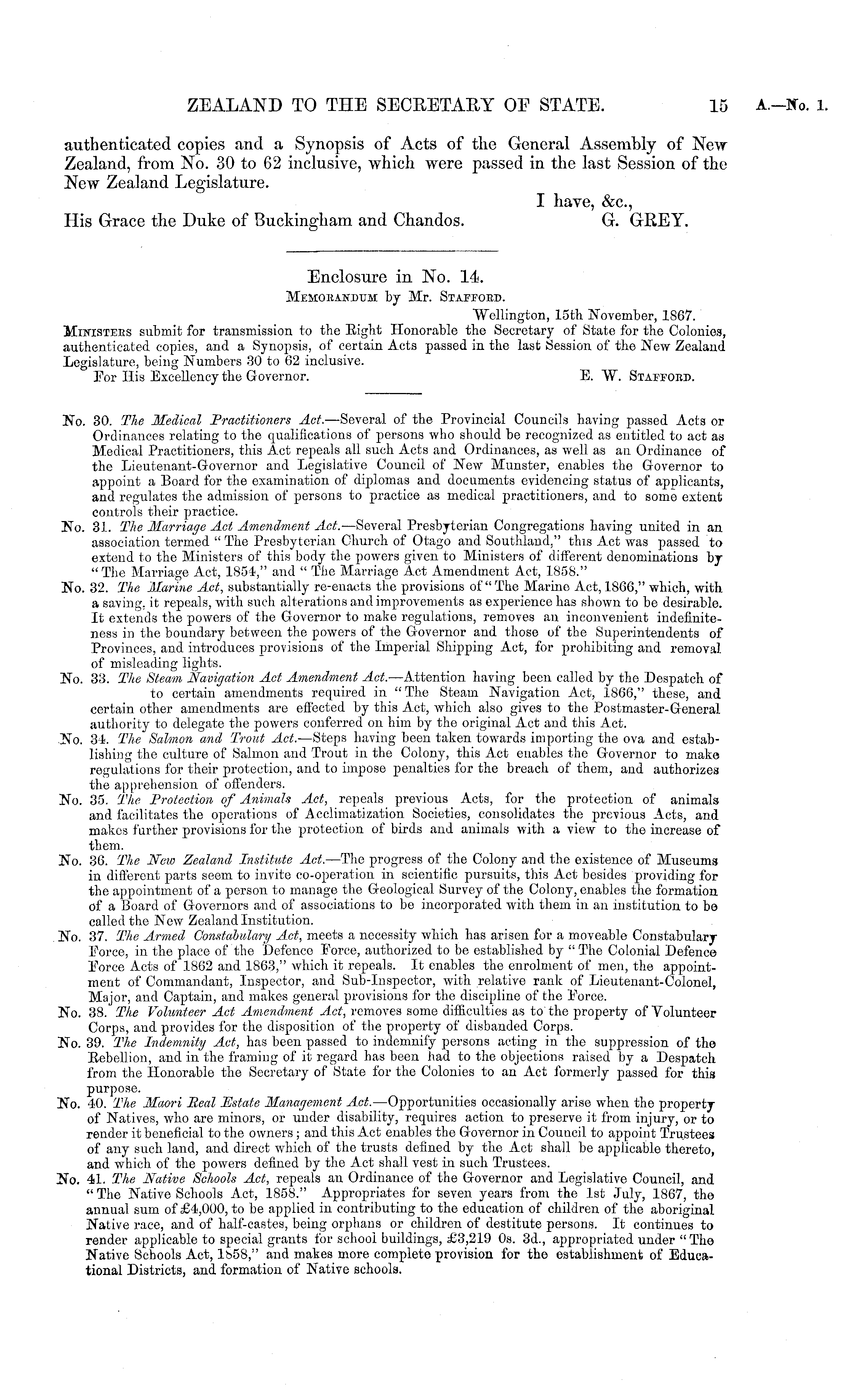 Enclosure in No. 14. Memorandum by Mr. Staffoed. ■Wellington, 15th November, 1867. Ministers submit for transmission to the Eight Honorable the Secretary of State for the Colonies, authenticated copies, and a Synopsis, of certain Acts passed in the last Session of the New Zealand Legislature, being Numbers 30 to 62 inclusive. For His Excellency the Governor. E. ~W". Staitoed. No. 30. The Medical Practitioners Act. —Several of the Provincial Councils having passed Acts or Ordinances relating to the qualifications of persons who should be recognized as entitled to act as Medical Practitioners, this Act repeals all such Acts and Ordinances, as well as an Ordinance of the Lieutenant-Governor and Legislative Council of New Munster, enables the Governor to appoint a Board for the examination of diplomas and documents evidencing status of applicants, and regulates the admission of persons to practice as medical practitioners, and to some extent controls their practice. No. 81. The Marriage Act Amendment Act.- —Several Presbyterian Congregations having united in an association termed " The Presbyterian Church of Otago and Southland," this Act was passed to extend to the Ministers of this body the powers given to Ministers of different denominations by "The Marriage Act, 1854," and " The Marriage Act Amendment Act, 1858." No. 32. The Marine Act, substantially re-enacts the provisions of "The Marine Act, 1866," which, with a saving, it repeals, with such alterations and improvements as experience has shown to be desirable. It extends the powers of the Governor to make regulations, removes an inconvenient indefiniteness in the boundary between the powers of the Governor and those of the Superintendents of Provinces, and introduces provisions of the Imperial Shipping Act, for prohibiting and removal of misleading lights. No. 33. The Steam Navigation Act Amendment Act. —Attention having been called by the Despatch of to certain amendments required in "The Steam Navigation Act, 1866," these, and certain other amendments are effected by this Act, which also gives to the Postmaster-General authority to delegate the powers conferred on him by the original Act and this Act. No. 34. The Salmon and Trout Act. —Steps having been taken towards importing the ova and establishing the culture of Salmon and Trout in the Colony, this Act enables the Governor to make regulations for their protection, and to impose penalties for the broach of them, and authorizes the apprehension of offenders. No. 35. The Protection of Animals Act, repeals previous Acts, for the protection of animals and facilitates the operations of Acclimatization Societies, consolidates the previous Acts, and makes further provisions for the protection of birds and animals with a view to the increase of them. No. 36. The New Zealand Institute Act. —The progress of the Colony and the existence of Museums in different parts seem to invite co-operation in scientific pursuits, this Act besides providing for the appointment of a person to manage the Geological Survey of the Colony, enables the formation of a Board of Governors and of associations to be incorporated with them in an institution to bo called the New Zealand Institution. No. 37. The Armed Constabulary Act, meets a necessity which has arisen for a moveable Constabulary Force, in the place of the Defence Force, authorized to be established by " The Colonial Defence Force Acts of 1862 and 1863," which it repeals. It enables the enrolment of men, the appointment of Commandant, Inspector, and Sub-Inspector, with relative rank of Lieutenant-Colonel, Major, and Captain, and makes general provisions for the discipline of the Force. No. 38. The Volunteer Act Amendment Act, removes some difficulties as to the property of Volunteer Corps, and provides for the disposition of the property of disbanded Corps. No. 39. The Indemnity Act, has been passed to indemnify persons acting in the suppression of the Rebellion, and in the framing of it regard has been had to the objections raised by a Despatch from the Honorable the Secretary of State for the Colonies to an Act formerly passed for this purpose. No. 40. The Maori Real Estate Management Act. —Opportunities occasionally arise when the property of Natives, who are minors, or under disability, requires action to preserve it from injury, or to render it beneficial to the owners ; and this Act enables the Governor in Council to appoint Trustees of any such land, and direct which of the trusts defined by the Act shall be applicable thereto, and which of the powers defined by the Act shall vest in such Trustees. No. 41. The Native Schools Act, repeals an Ordinance of the Governor and Legislative Council, and " The Native Schools Act, 1858." Appropriates for seven years from the Ist July, 1867, the annual sum of £4,000, to be applied in contributing to the education of children of the aboriginal Native race, and of half-castes, being orphans or children of destitute persons. It continues to render applicable to special grants for school buildings, £3,219 Os. 3d., appropriated under "The Native Schools Act, 1858," and makes more complete provision for the establishment of Educational Districts, and. formation of Native schools.