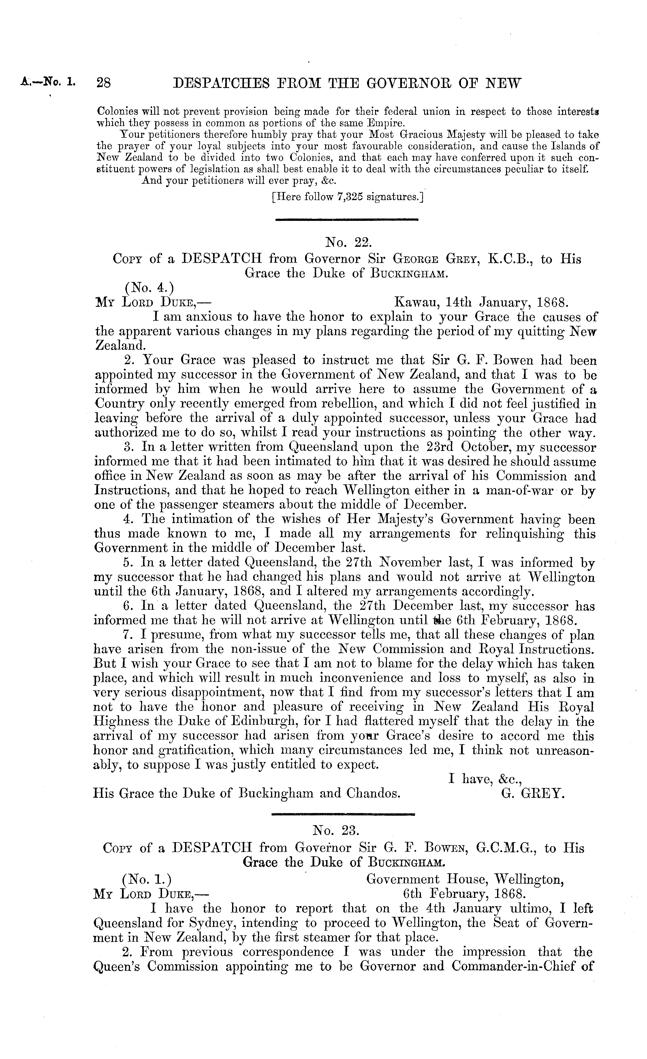 No. 23. Copy of a DESPATCH from Governor Sir G. F. Bowen, G.C.M.G., to His Grace the Duke of Buckingham. (No. 1.) Government House, Wellington, My Lord Duke, — 6th February, 1868. I have the honor to report that on the 4th January ultimo, I left Queensland for Sydney, intending to proceed to Wellington, the Seat of Government in New Zealand, by the first steamer for that place. 2. From previous correspondence I was under the impression that the Queen's Commission appointing me to be Governor and Commander-in-Chief of