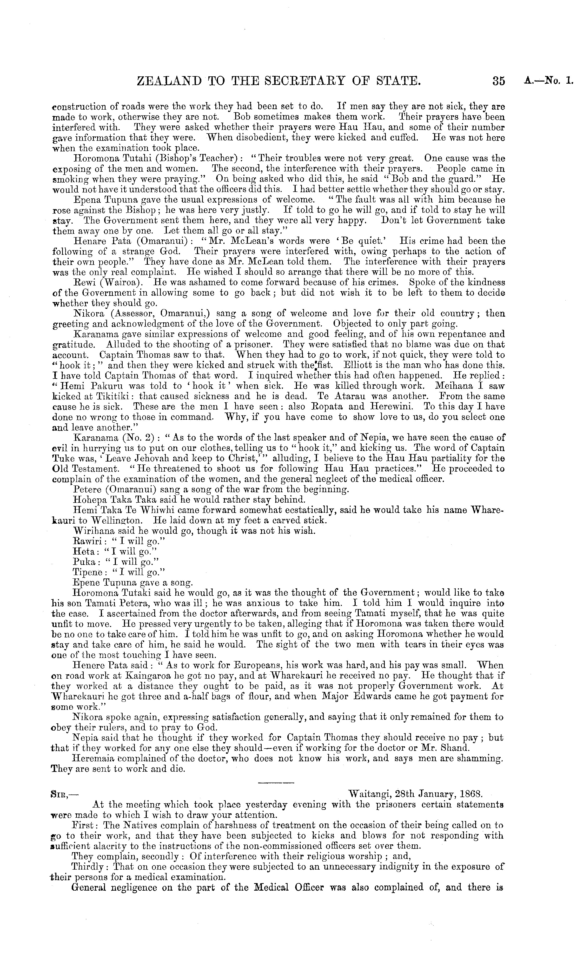 Sic,— Waitangi, 28th January, 1868. At the meeting which took place yesterday evening with tho prisoners certain statements were made to which I wish to draw your attention. Eirst: The Natives complain of harshness of treatment on the occasion of their being called on to go to their work, and that they have been subjected to kicks and blows for not responding with sufficient alacrity to the instructions of the non-commissioned officers set over them. They complain, secondly : Of interference with their religious worship ; and, Thirdly: That on ono occasion they were subjected to an unnecessary indignity in the exposure of their persons for a medical examination. General negligence on the part of the Medical Officer was also complained of, and there is