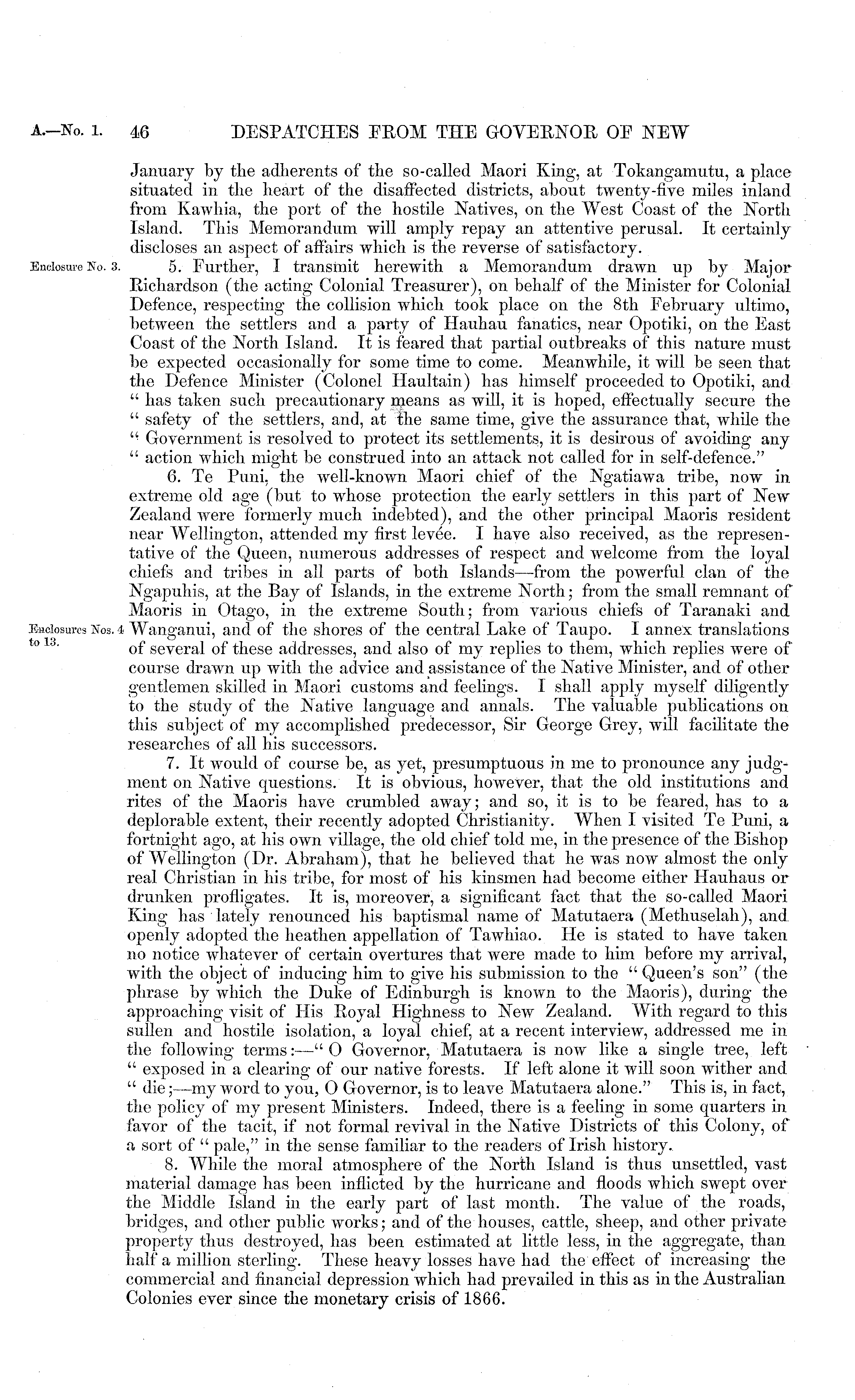 January by the adherents of the so-called Maori King, at Tokangamutu, a place situated in the heart of the disaffected districts, about twenty-five miles inland from Kawhia, the port of the hostile Natives, on the West Coast of the North Island. This Memorandum will amply repay an attentive perusal. It certainly discloses an aspect of affairs which is the reverse of satisfactory. 5. Further, I transmit herewith a Memorandum drawn up by Major .Richardson (the acting Colonial Treasurer), on behalf of the Minister for Colonial Defence, respecting the collision which took place on the Bth February ultimo, between the settlers and a party of Hauhau fanatics, near Opotiki, on the East Coast of the North Island. It is feared that partial outbreaks of this nature must be expected occasionally for some time to come. Meanwhile, it will be seen that the Defence Minister (Colonel Haultain) has himself proceeded to Opotiki, and " has taken such precautionary means as will, it is hoped, effectually secure the " safety of the settlers, and, at the same time, give the assurance that, while the " Government is resolved to protect its settlements, it is desirous of avoiding any " action which might be construed into an attack not called for in self-defence." 6. Te Puni, the well-known Maori chief of the Ngatiawa tribe, now in extreme old age (but to whose protection the early settlers in this part of New Zealand were formerly much indebted), and the other principal Maoris resident near Wellington, attended my first levee. I have also received, as the representative of the Queen, numerous addresses of respect and welcome from the loyal chiefs and tribes in all parts of both Islands—from the powerful clan of the Ngapuhis, at the Bay of Islands, in the extreme North; from the small remnant of Maoris in Otago, in the extreme South; from various chiefs of Taranaki and t Wanganui, and of the shores of the central Lake of Taupo. I annex translations of several of these addresses, and also of my replies to them, which replies were of course drawn up with the advice and assistance of the Native Minister, and of other gentlemen skilled in Maori customs and feelings. I shall apply myself diligently to the study of the Native language and annals. The valuable publications on this subject of my accomplished predecessor, Sir George Grey, will facilitate the researches of all his successors. 7. It would of course be, as yet, presumptuous in me to pronounce any judgment on Native questions. It is obvious, however, that the old institutions and rites of the Maoris have crumbled away; and so, it is to be feared, has to a deplorable extent, their recently adopted Christianity. When I visited Te Puni, a fortnight ago, at his own village, the old chief told me, in the presence of the Bishop of Wellington (Dr. Abraham), that he believed that he was now almost the only real Christian in his tribe, for most of his kinsmen had become either Hauhaus or drunken profligates. It is, moreover, a significant fact that the so-called Maori King has lately renounced his baptismal name of Matutaera (Methuselah), and. openly adopted the heathen appellation of Tawhiao. He is stated to have taken no notice whatever of certain overtures that were made to him before my arrival, with the object of inducing him to give his submission to the " Queen's son" (the phrase by which the Duke of Edinburgh is known to the Maoris), during the approaching visit of His Royal Highness to New Zealand. With regard to this sullen and hostile isolation, a loyal chief, at a recent interview, addressed me in the following terms: —"0 Governor, Matutaera is now like a single tree, left " exposed in a clearing of our native forests. If left alone it will soon wither and " die; —my word to you, O Governor, is to leave Matutaera alone." This is, in fact, the policy of my present Ministers. Indeed, there is a feeling in some quarters in favor of the tacit, if not formal revival in the Native Districts of this Colony, of a sort of " pale," in the sense familiar to the readers of Irish history. 8. While the moral atmosphere of the North Island is thus unsettled, vast material damage has been inflicted by the hurricane and floods which swept over the Middle Island in the early part of last month. The value of the roads, bridges, and other public works; and of the houses, cattle, sheep, and other private property thus destroyed, has been estimated at little less, in the aggregate, than half a million sterling. These heavy losses have had the effect of increasing the commercial and financial depression which had prevailed in this as in the Australian Colonies ever since the monetary crisis of 1866.