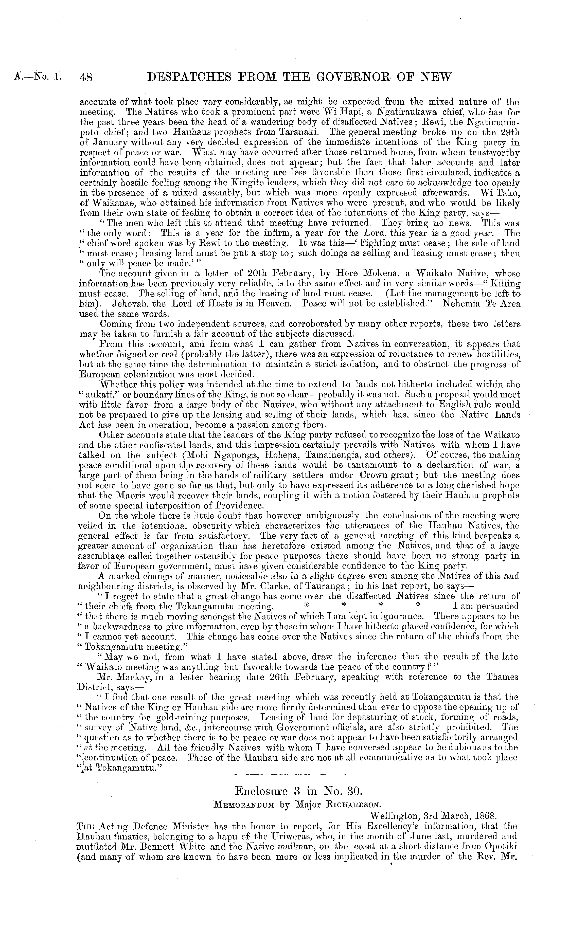 Enclosure 3 in No. 30. Memokandum by Major Richardson. Wellington, 3rd March, 1868. The Acting Defence Minister has the honor to report, for His Excellency's information, that the Hauhau fanatics, belonging to a hapu of' the Uriwcras, who, in the month of June last, murdered and mutilated Mr. Bennett White and the Native mailman, on the coast at a short distance from Opotiki (and many -of whom are known to have been more or less implicated in the murder of the Bey. Mr.