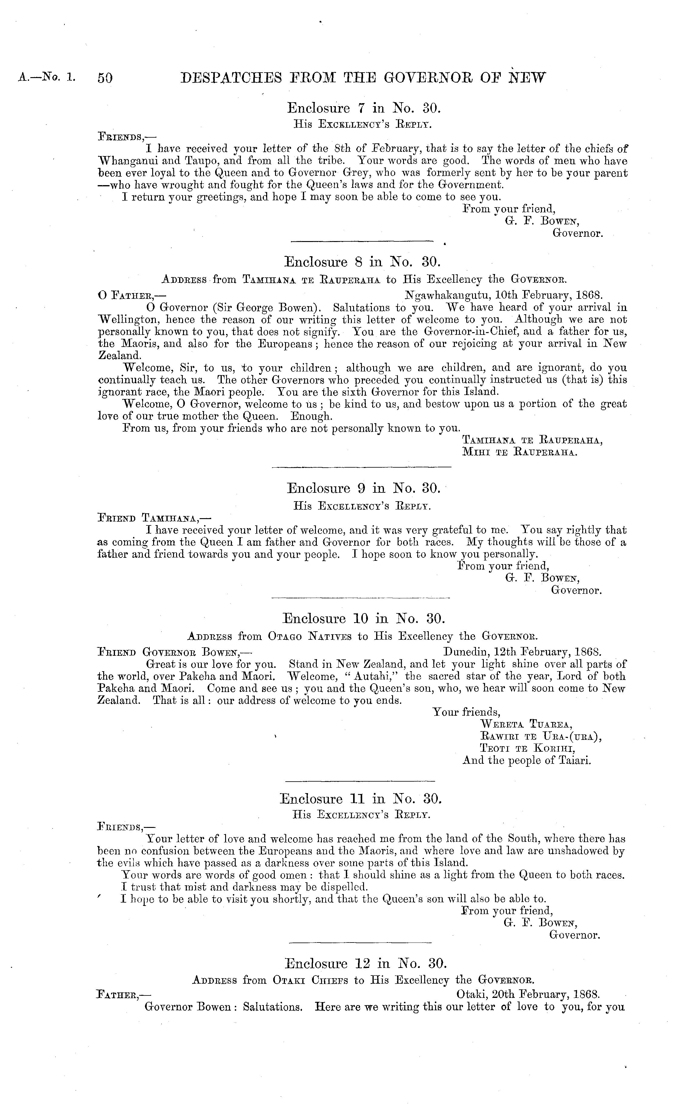 Enclosure 12 in No. 30. Addeess from Otaki Chiefs to His Excellency the Goveenor. Father,— Otaki, 20th February. 1868. Governor Bowen : Salutations. Here are we writing this our letter of love to you, for you