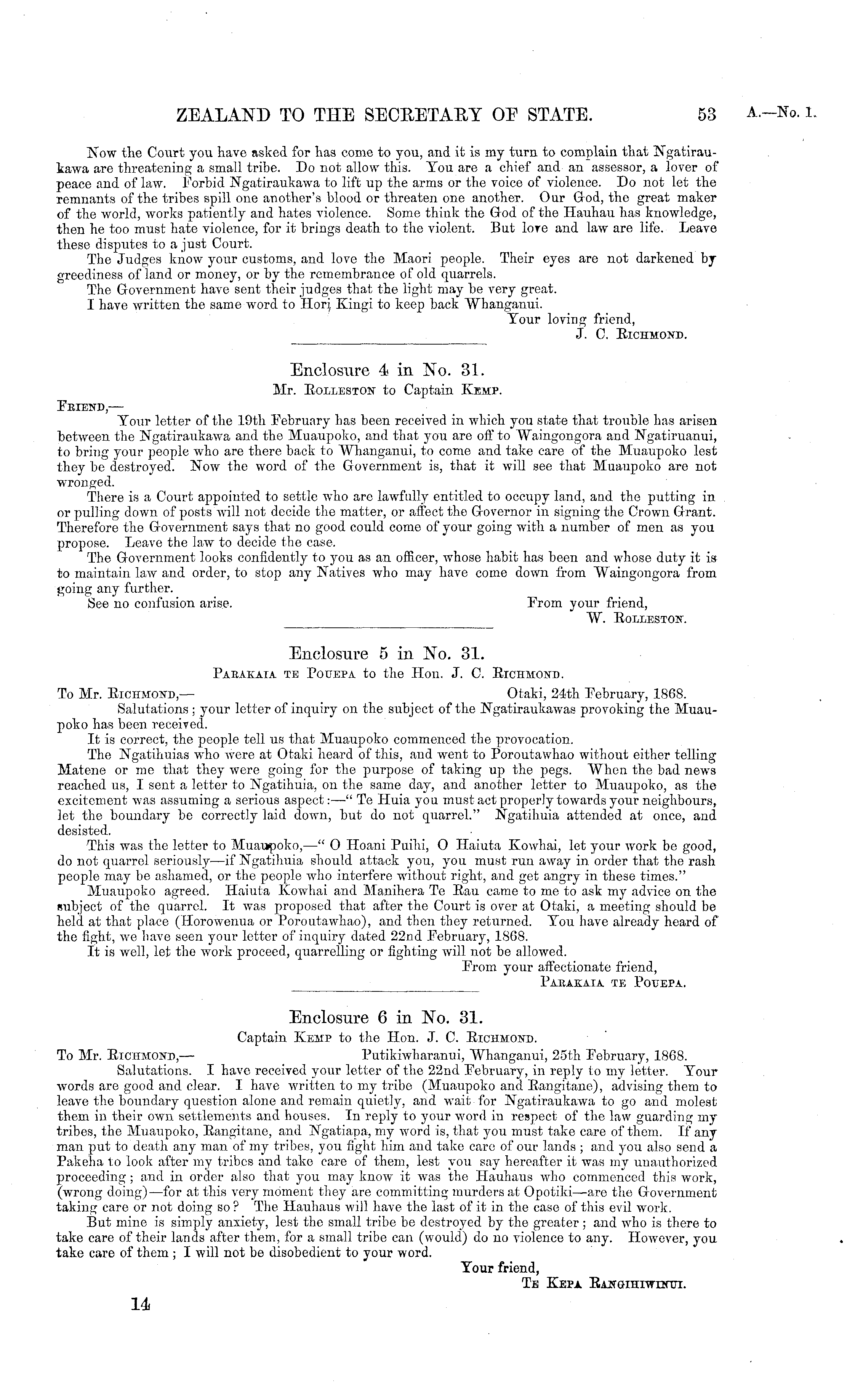 Enclosure 6 in No. 31. Captain Kemp to the Hon. J. C. Richmond. To Mr. Richmond, — Putikiwharanui, Whanganui, 25th February, 1868. Salutations. I have receiyed your letter of the 22nd February, in reply to my letter. Tour words are good and clear. I have written to my tribe (Muaupoko and Rangitane), advising them to leave the boundary question alone and remain quietly, and wait for Ngatiraukawa to go and molest them in their own settlements and houses. In reply to your word in respect of the law guarding my tribes, the Muaupoko, Rangitane, and Ngatiapa, my word is, that you must take care of thorn. If any man put to death any man of my tribes, you fight him and take care of our lands ; and you also send a Pakeha to look after my tribes and take care of them, lest you say hereafter it was my unauthorized proceeding; and in order also that you may know it was the Hauhaus who commenced this work, (wrong doing)—for at this very moment they are committing murders at Opotiki—are the Government taking care or not doing so? The Hauhaus will have the last of it in the case of this evil work. But mine is simply anxiety, lest the small tribe be destroyed by the greater; and who is there to take care of their lands after them, for a small tribe can (would) do no violence to any. However, you take care of them ; I will not be disobedient to your word. Tour friend, Te Kepa EAwaiHiwnnn. 14