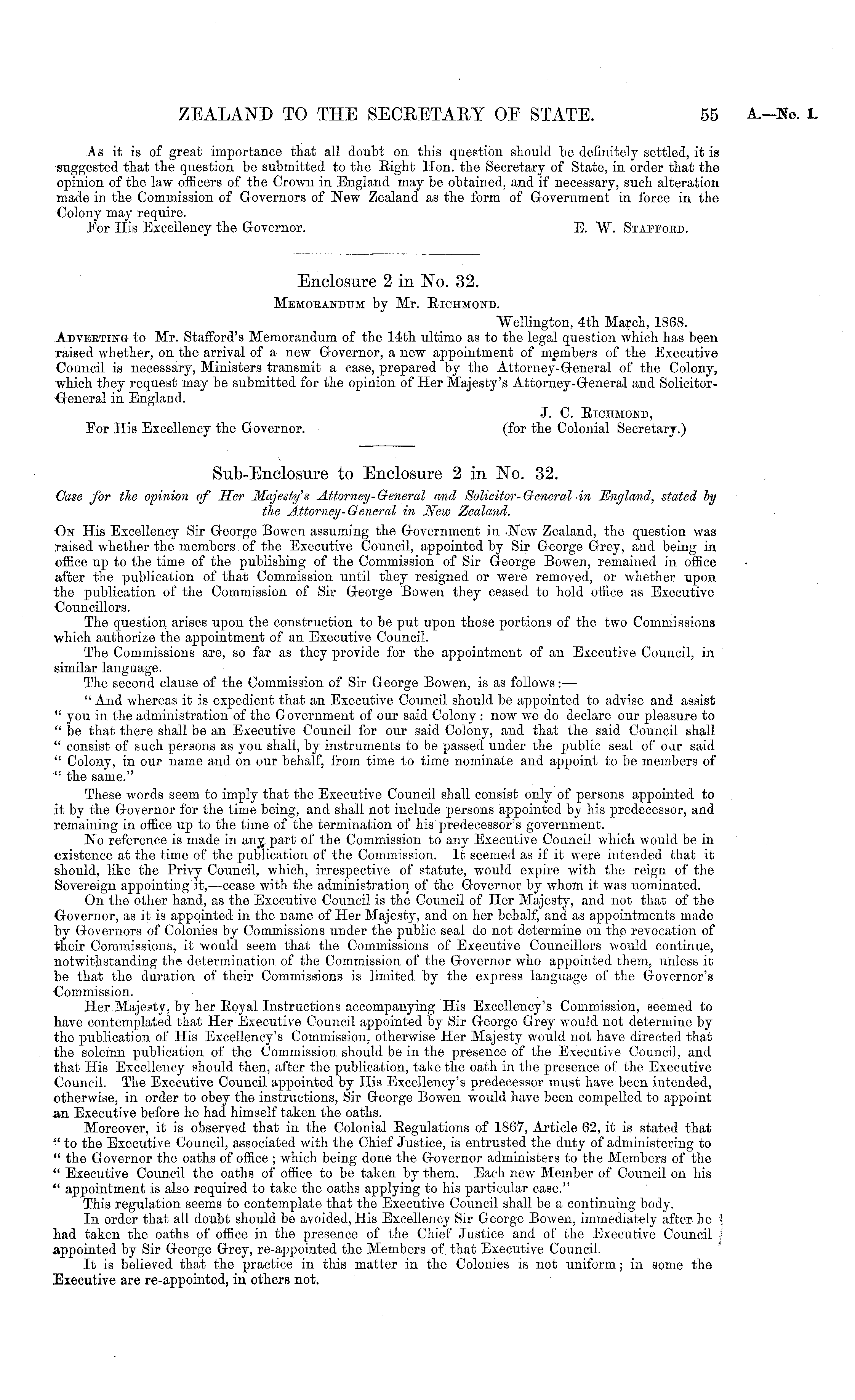 Enclosure 2 in No. 32. Mesiokanditm by Mr. Eichmond. "Wellington, 4th March, 18G8. Adverting to Mr. Stafford's Memorandum of the 14th ultimo as to the legal question which has been raised whether, on the arrival of a new Governor, a new appointment of members of the Executive Council is necessary, Ministers transmit a case, prepared by the Attorney-General of the Colony, which they request may be submitted for the opinion of Her Majesty's Attorney-General and SolicitorGeneral in England. J. C. Richmond, Eor His Excellency the Governor. (for the Colonial Secretary.)