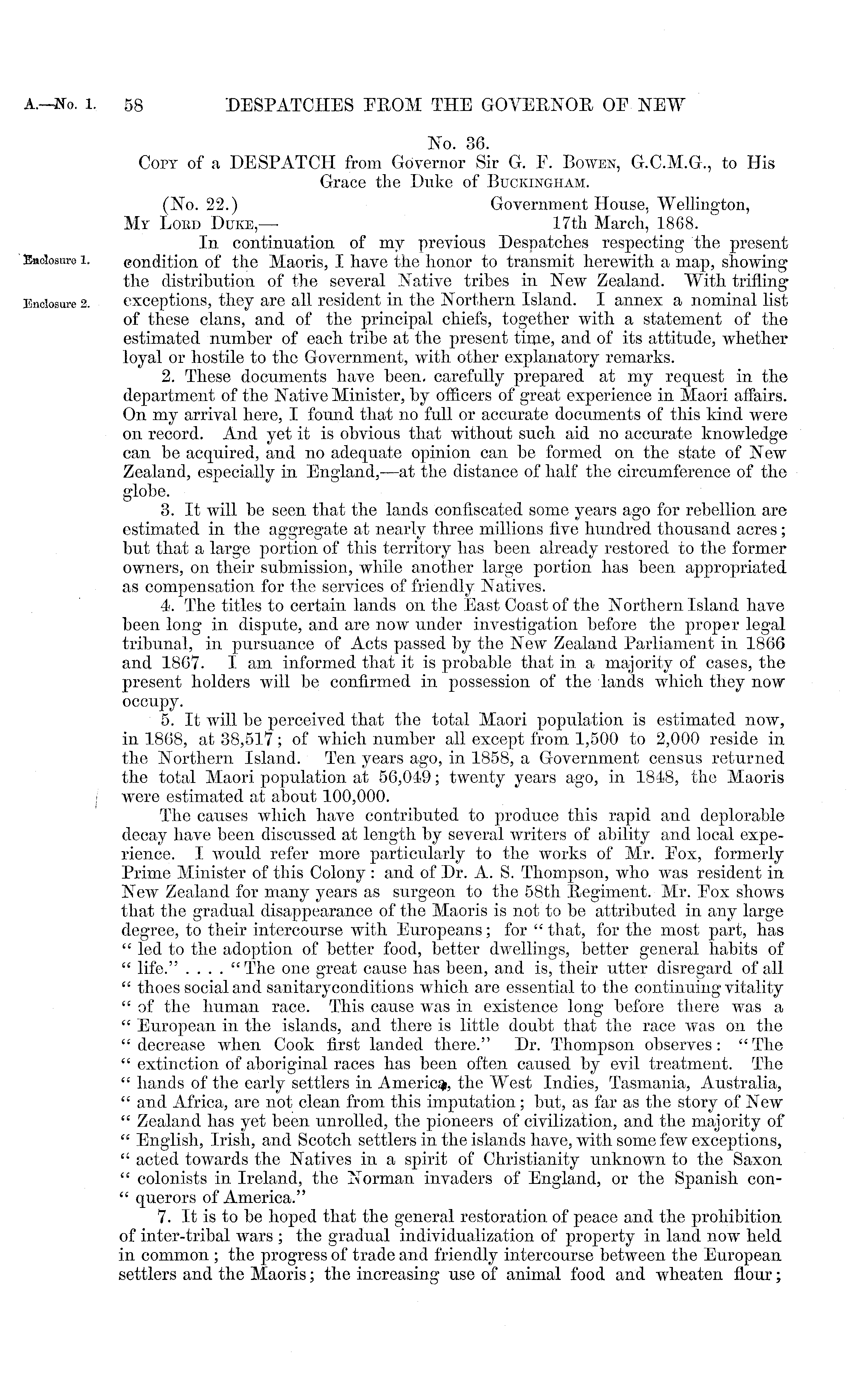 No. 36. Copy of a DESPATCH from Governor Sir G. F. Bowen, G.C.M.G., to His Grace the Duke of Buckingham. (No. 22.) Government House, Wellington, My Loed Duke,— 17th March j 1868. In oontinnation of my previous Despatches respecting the present condition of the Maoris, I have the honor to transmit herewith a map, showing the distribution of the several Native tribes in New Zealand. With trifling exceptions, they are all resident in the Northern Island. I annex a nominal list of these clans, and of the principal chiefs, together with a statement of the estimated number of each tribe at the present time, and of its attitude, whether loyal or hostile to the Government, with other explanatory remarks. 2. These documents have been, carefully prepared at my request in the department of the Native Minister, by officers of great experience in Maori affairs. On my arrival here, I found that no full or accurate documents of this kind were on record. And yet it is obvious that without such aid no accurate knowledge can be acquired, and no adequate opinion can be formed on the state of New Zealand, especially in England, —at the distance of half the circumference of the globe. 8. It will be seen that the lands confiscated some years ago for rebellion are estimated in the aggregate at nearly three millions five hundred thousand acres; but that a large portion of this territory has been already restored to the former owners, on their submission, while another large portion has been appropriated as compensation for the services of friendly Natives. 4. The titles to certain lands on the East Coast of the Northern Island have been long in dispute, and are now under investigation before the proper legal tribunal, in pursuance of Acts passed by the New Zealand Parliament in 1866 and 1867. 1 am informed that it is probable that in a majority of cases, the present holders will be confirmed in possession of the lands which they now occupy. 5. It will be perceived that the total Maori population is estimated now, in 1868, at 88,517 ; of which number all except from 1,500 to 2,000 reside in the Northern Island. Ten years ago, in 1858, a Government census returned the total Maori population at 56,049; twenty years ago, in 1818, the Maoris were estimated at about 100,000. The causes which have contributed to produce this rapid and deplorable decay have been discussed at length by several writers of ability and local experience. I would refer more particularly to the works of Mr. Eox, formerly Prime Minister of this Colony : and of Dr. A. S. Thompson, who was resident in New Zealand for many years as surgeon to the 58th Regiment. Mr. Eox shows that the gradual disappearance of the Maoris is not to be attributed in any large degree, to their intercourse with Europeans; for " that, for the most part, has " led to the adoption of better food, better dwellings, better general habits of " life." .... "The one great cause has been, and is, their utter disregard of all " thoes social and sanitaryconditions which are essential to the continuing vitality "of the human race. This cause was in existence long before there was a " European in the islands, and there is little doubt that the race was on the "decrease when Cook first landed there." Dr. Thompson observes: "The " extinction of aboriginal races has been often caused by evil treatment. The " hands of the early settlers in America, the West Indies, Tasmania, Australia, " and Africa, are not clean from this imputation; but, as far as the story of New " Zealand has yet been unrolled, the pioneers of civilization, and the majority of " English, Irish, and Scotch settlers in the islands have, with some few exceptions, " acted towards the Natives in a spirit of Christianity unknown to the Saxon " colonists in Ireland, the Norman invaders of England, or the Spanish con- " querors of America." 7. It is to be hoped that the general restoration of peace and the prohibition of inter-tribal wars ; the gradual individualization of property in land, now held in common ; the progress of trade and friendly intercourse between the European settlers and the Maoris; the increasing use of animal food and wheaten flour;