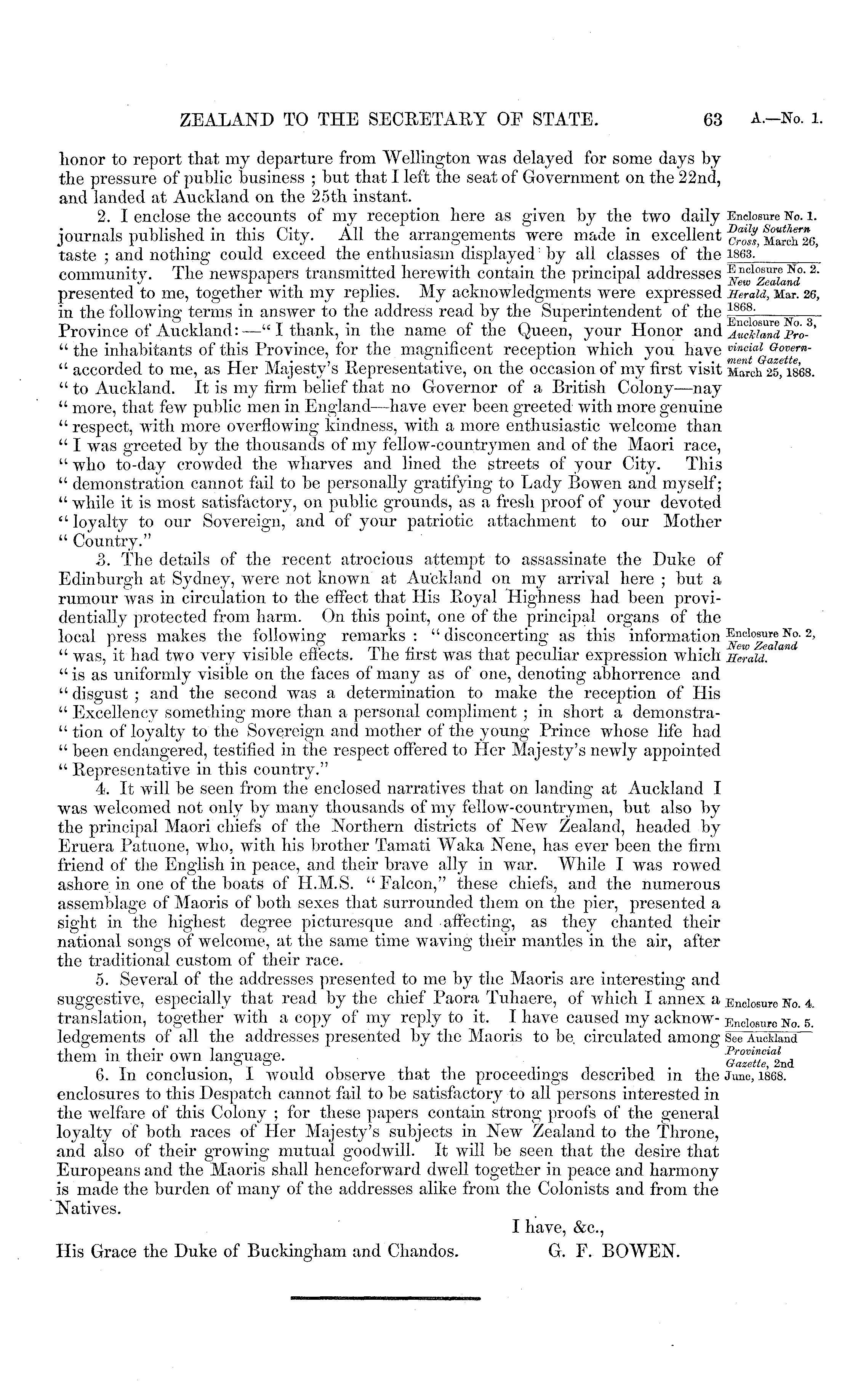 honor to report that my departure from Wellington was delayed for some days by the pressure of public business ; but that I left the seat of Government on the 22nd, and landed at Auckland on the 25th instant. 2. I enclose the accounts of my reception here as given by the two daily journals published in this City. All the arrangements were made in excellent taste ; and nothing could exceed the enthusiasm displayed: by all classes of the community. The newspapers transmitted herewith contain the principal addresses presented to me, together with my replies. My acknowledgments were expressed in the following terms in answer to the address read by the Superintendent of the Province of Auckland: —" I thank, in the name of the Queen, your Honor and " the inhabitants of this Province, for the magnificent reception which you have " accorded to me, as Her Majesty's Kepresentative, on the occasion of my first visit "to Auckland. It is my firm belief that no Governor of a British Colony—nay " more, that few public men in England —have ever been greeted with more genuine " respect, with more overflowing kindness, with a more enthusiastic welcome than " I was greeted by the thousands of my fellow-countrymen and of the Maori race, " who to-day crowded the wharves and lined the streets of your City. This " demonstration cannot fail to be personally gratifying to Lady Bowen and myself; " while it is most satisfactory, on public grounds, as a fresh proof of your devoted "loyalty to our Sovereign, and of your patriotic attachment to our Mother " Country." ?>. The details of the recent atrocious attempt to assassinate the Duke of Edinburgh at Sydney, were not known at Auckland on my arrival here ; but a rumour was in circulation to the effect that His Royal Highness had been providentially protected from harm. On this point, one of the principal organs of the local press makes the following remarks : " disconcerting as this information " was, it had two very visible effects. The first was that peculiar expression which "is as uniformly visible on the faces of many as of one, denoting abhorrence and " disgust ; and the second was a determination to make the reception of His " Excellency something more than a personal compliment ; in short a demonstra- " tion of loyalty to the Sovereign and mother of the young Prince whose life had " been endangered, testified in the respect offered to Her Majesty's newly appointed " Representative in this country." 4. It will be seen from the enclosed narratives that on landing at Auckland I was welcomed not only by many thousands of my fellow-countrymen, but also by the principal Maori chiefs of the Northern districts of New Zealand, headed by Emera Patuone, who, with his brother Tamati Waka Nene, has ever been the firm friend of the English in peace, and their brave ally in war. While I was rowed ashore in one of the boats of H.M.S. "Falcon," these chiefs, and the numerous assemblage of Maoris of both sexes that surrounded them on the pier, presented a sight in the highest degree picturesque and affecting, as they chanted their national songs of welcome, at the same time waving their mantles in the air, after the traditional custom of their race. 5. Several of the addresses presented to me by the Maoris are interesting and suggestive, especially that read by the chief Paora Tuhaere, of which I annex a translation, together with a copy of my reply to it. I have caused my acknowledgements of all the addresses presented by the Maoris to be. circulated among them in their own language. 6. In conclusion, I would observe that the proceedings described in the enclosures to this Despatch cannot fail to be satisfactory to all persons interested in the welfare of this Colony ; for these papers contain strong proofs of the general loyalty of both races of Her Majesty's subjects in New Zealand to the Throne, and also of their growing mutual goodwill. It will be seen that the desire that Europeans and the Maoris shall henceforward dwell together in peace and harmony is made the burden of many of the addresses alike from the Colonists and from the Natives. I have, &c, His Grace the Duke of Buckingham and Chandos. G. F. BOWEN.
