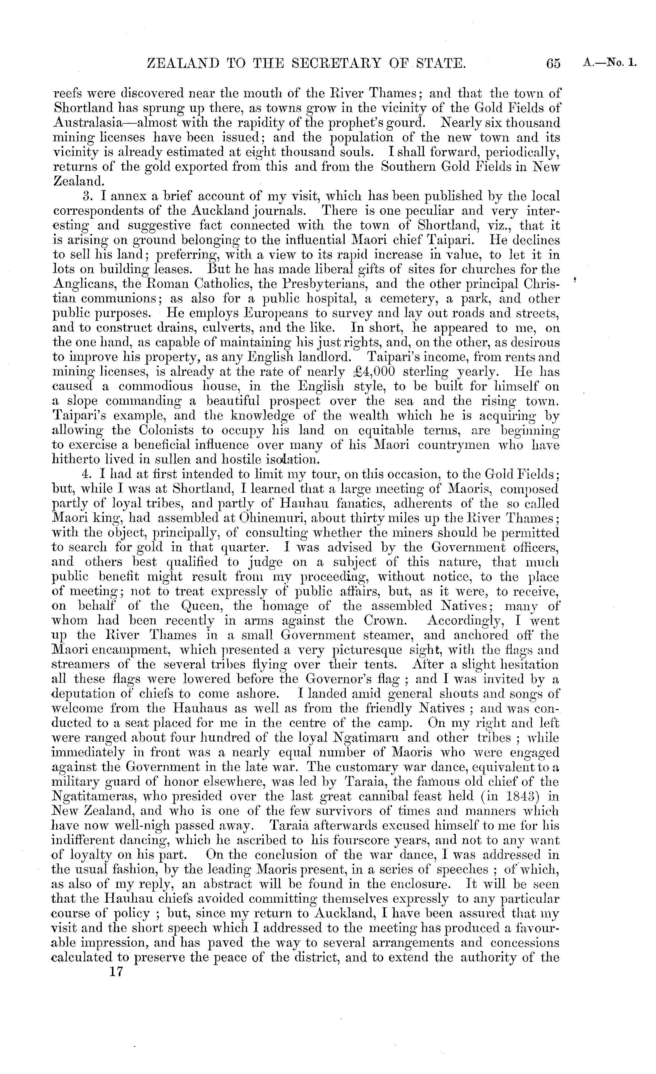reefs were discovered near tlie mouth of the River Thames ; and that the town of Shortland has sprung up there, as towns grow in the vicinity of the Gold Fields of Australasia—almost with the rapidity of the prophet's gourd. Nearly six thousand mining licenses have been issued; and the population of the new town and its vicinity is already estimated at eight thousand souls. I shall forward, periodically, returns of the gold exported from this and from the Southern Gold Fields in New Zealand. 3. I annex a brief account of my visit, which has been published by the local correspondents of the Auckland journals. There is one peculiar and very interesting and suggestive fact connected with the town of Shortland, viz., that it is arising on ground belonging to the influential Maori chief Taipari. He declines to sell his land; preferring, with a view to its rapid increase in value, to let it in lots on building leases. But he has made liberal gifts of sites for churches for the Anglicans, the Roman Catholics, the Presbyterians, and the other principal Christian communions; as also for a public hospital, a cemetery, a park, and other public purposes. He employs Europeans to survey and lay out roads and streets, and to construct drains, culverts, and the like. In short, he appeared to me, on the one hand, as capable of maintaining his just rights, and, on the other, as desirous to improve his property, as any English landlord. Taipari's income, from rents and mining licenses, is already at the rate of nearly £4,000 sterling yearly. He has caused a commodious house, in the English style, to be built for himself on a slope commanding a beautiful prospect over the sea and the rising town. Taipari's example, and the knowledge of the wealth which he is acquiring by allowing the Colonists to occupy his land on equitable terms, are beginning to exercise a beneficial influence over many of his Maori countrymen who have hitherto lived in sullen and hostile isolation. 4. I had at first intended to limit my tour, on this occasion, to the Gold Fields; but, while I was at Shortland, I learned that a large meeting of Maoris, composed partly of loyal tribes, and partly of Hauhau fanatics, adherents of the so called Maori king, had assembled at Ohinemuri, about thirty miles up the River Thames; with the object, principally, of consulting whether the miners should be permitted to search for gold in that quarter. 1 was advised by the Government officers, and others best qualified to judge on a subject of this nature, that much public benefit might result from my proceeding, without notice, to the place of meeting; not to treat expressly of public affairs, but, as it were, to receive, on behalf of the Queen, the homage of the assembled Natives; many of ■whom had been recently in arms against the Crown. Accordingly, I went up the River Thames in a small Government steamer, and anchored off' the Maori encampment, which presented a very picturesque sight, with the flags and streamers of the several tribes flying over their tents. After a slight hesitation all these flags were lowered before the Governor's flag ; and I was invited by a deputation of chiefs to come ashore. I landed amid general shouts and songs of welcome from the liauhaus as well as from the friendly Natives ; and. was conducted to a seat placed for me in the centre of the camp. On my right and left were ranged about four hundred of the loyal Ngatimaru and other tribes ; while immediately in front was a nearly equal number of Maoris who were engaged against the Government in the late war. The customary war dance, equivalent to a military guard of honor elsewhere, was led by Taraia, the famous old chief of the Ngatitameras, who presided over the last great cannibal feast held (in 1848) in New Zealand, and who is one of the few survivors of times and manners which have now well-nigh passed away. Taraia afterwards excused himself to me for his indifferent dancing, which he ascribed to his fourscore years, and not to any want of loyalty on his part. On the conclusion of the war dance, I was addressed in the usual fashion, by the leading Maoris present, in a series of speeches ; of which, as also of my reply, an abstract will be found in the enclosure. It will be seen that the Hauhau chiefs avoided committing themselves expressly to any particular course of policy ; but, since my return to Auckland, I have been assured that my visit and the short speech which I addressed to the meeting has produced a favourable impression, and has jmved the way to several arrangements and concessions calculated to preserve the peace of the district, and to extend the authority of the 17