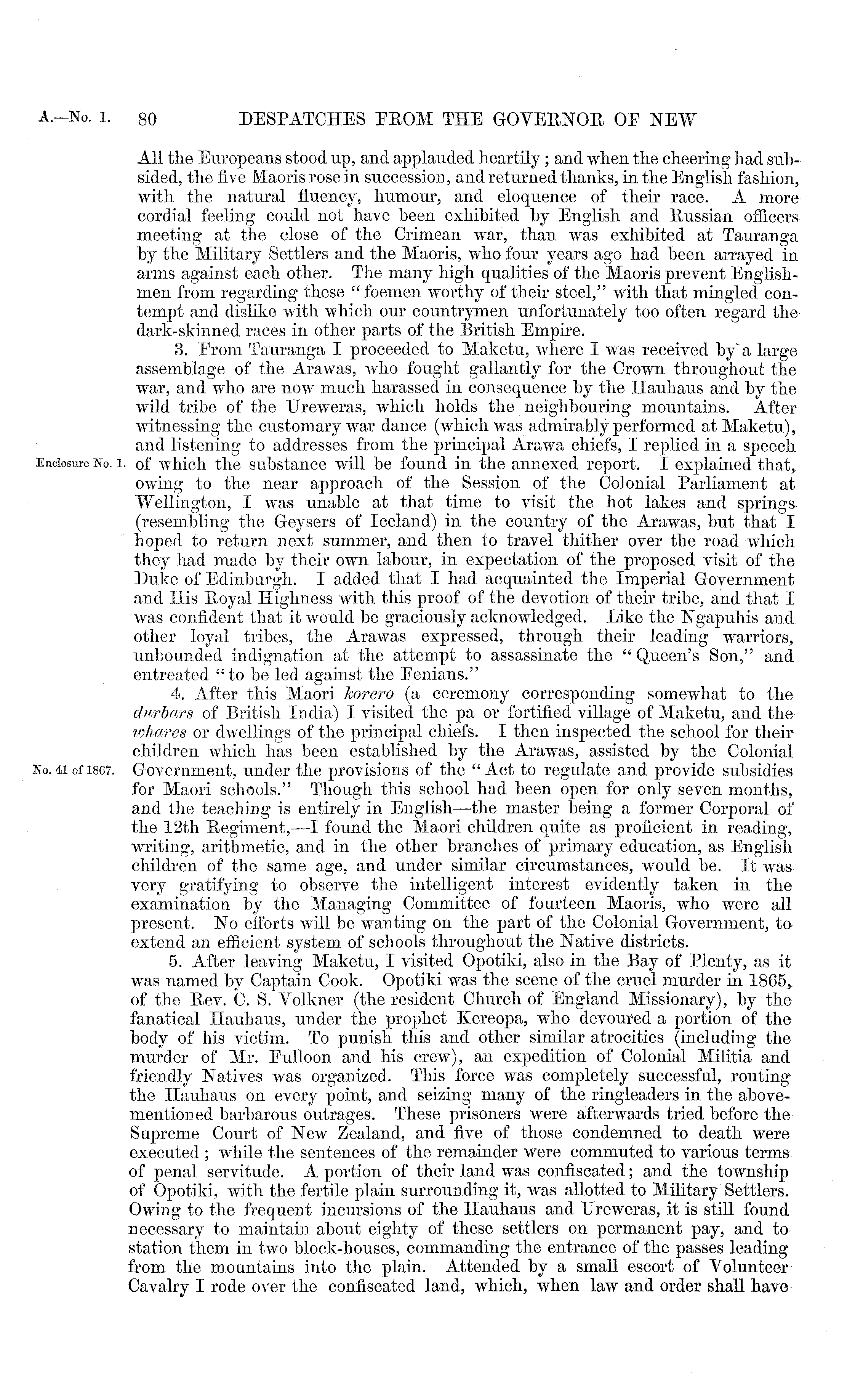 All the Europeans stood up, and applauded heartily; and when the cheering had subsided, the five Maoris rose in succession, and returned thanks, in the English fashion, with the natural fluency, humour, and eloquence of their race. A more cordial feeling could not have been exhibited by English and Russian officers meeting at the close of the Crimean Avar, than was exhibited at Tauranga by the Military Settlers and the Maoris, who four years ago had been arrayed in arms against each other. The many high qualities of the Maoris prevent Englishmen from regarding these "foemen worthy of their steel," with that mingled contempt and dislike with Avhich our countrymen unfortunately too often regard the dark-skinned races in other parts of the British Empire. 3. From Tauranga I proceeded to Maketu, where I was received by* a large assemblage of the Arawas, Avho fought gallantly for the CroAvn throughout the Avar, and who are now much harassed in consequence by the Hauhaus and by the wild tribe of the UreAveras, which holds the neighbouring mountains. After Avitnessing the customary Avar dance (which w ras admirably performed at Maketu), and listening to addresses from the principal Arawa chiefs, I replied in a speech of which the substance Avill be found in the annexed report. I explained that, owing to the near approach of the Session of the Colonial Parliament at Wellington, I was unable at that time to visit the hot lakes and springs (resembling the Geysers of Iceland) in tho country of the Arawras, but that I hoped to return next summer, and then to tra\"el thither over the road AA rhich they had made by their own labour, in expectation of the proposed visit of the Duke of Edinburgh. I added that I had acquainted the Imperial Government and His Royal Highness with this proof of the devotion of their tribe, and that I Avas confident that it Avould be graciously acknowledged. Like the Ngapuhis and other loyal tribes, the Arawas expressed, through their leading warriors, unbounded indignation at the attempt to assassinate the " Queen's Son," and entreated "to be led against the Fenians." 4. After this Maori horero (a ceremony corresponding somewhat to the durbars of British India) I visited the pa or fortified village of Maketu, and the ivhares or dwellings of the principal chiefs. I then inspected the school for their children which has been established by the Arawas, assisted by the Colonial Government, under the provisions of the " Act to regulate and provide subsidies for Maori schools." Though this school had been open for only seven months, and the teaching is entirely in English —the master being a former Corporal of the 12th Regiment,—l found the Maori children quite as proficient in reading, writing, arithmetic, and in the other branches of primary education, as English children of the same age, and under similar circumstances, would be. It was very gratifying to observe the intelligent interest evidently taken in the examination by the Managing Committee of fourteen Maoris, who were all present. No efforts will be w ranting on the part of the Colonial Government, to extend an efficient system of schools throughout the Native districts. 5. After leaving Maketu, I visited Opotiki, also in the Bay of Plenty, as if was named by Captain Cook. Opotiki was the scene of the cruel murder in 1865, of the Rev. C. S. Volkner (the resident Church of England Missionary), by tho fanatical Hauhaus, under the prophet Kereopa, who devoured a portion of the body of his victim. To punish this and other similar atrocities (including the murder of Mr. Fulloon and his crew), an expedition of Colonial Militia and friendly Natives was organized. This force was completely successful, routing the Hauhaus on every point, and seizing many of the ringleaders in the abovementioned barbarous outrages. These prisoners were afterwards tried before the Supreme Court of Ncav Zealand, and five of those condemned to death Avere executed ; while the sentences of the remainder were commuted to various terms of penal servitude. A portion of their land Avas confiscated; and the township of Opotiki, with the fertile plain surrounding it, was allotted to Military Settlers. Owing to the frequent incursions of the Hauhaus and Ureweras, it is still found necessary to maintain about eighty of these settlers on permanent pay, and to station them in two block-houses, commanding the entrance of the passes leading from the mountains into the plain. Attended by a small escort of Volunteer Cavalry I rode over the confiscated land, which, wdien law and order shall have