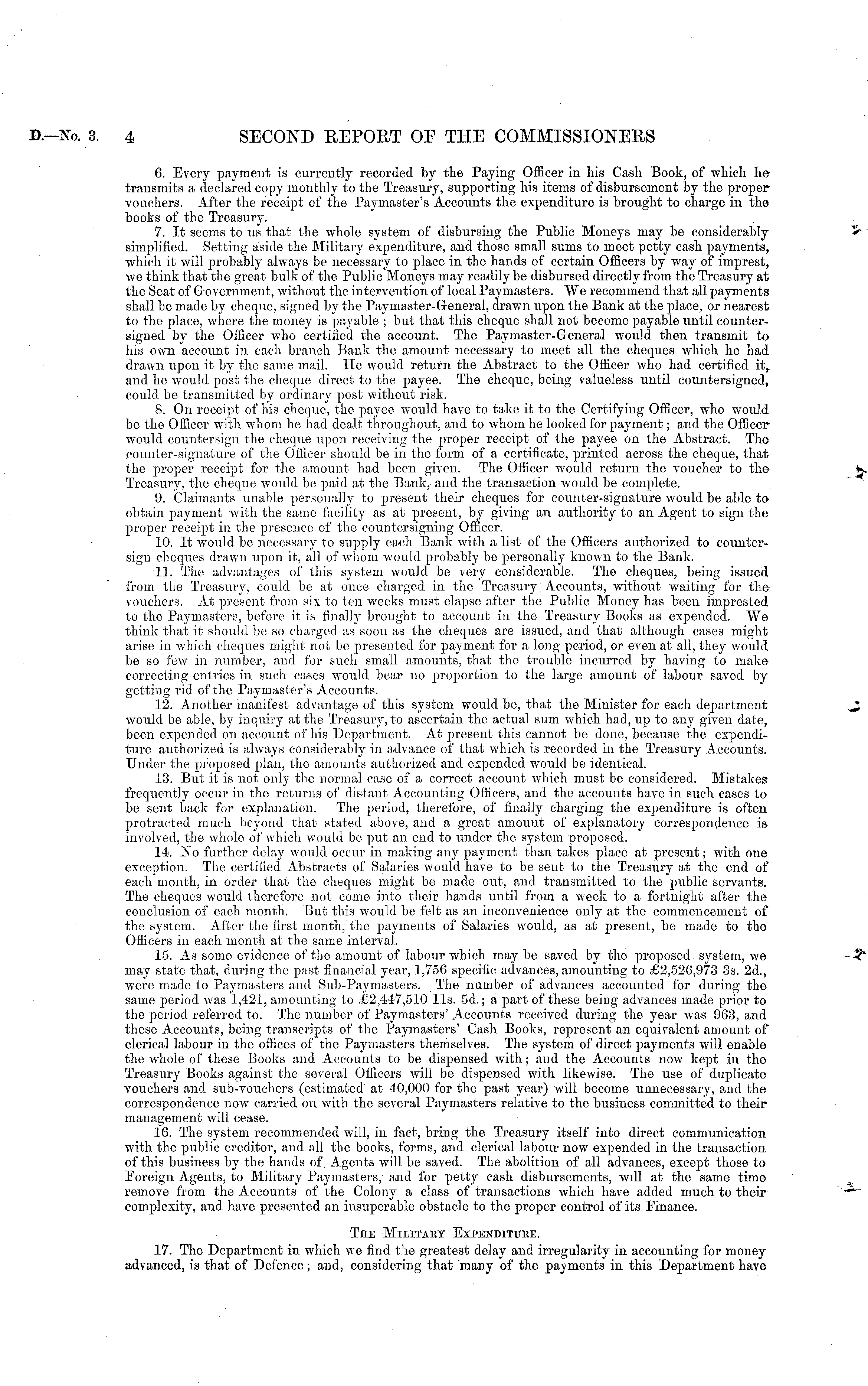 6. Every payment is currently recorded by the Paying Officer in his Cash Book, of which he transmits a declared copy monthly to the Treasury, supporting his items of disbursement by the proper vouchers. After the receipt of the Paymaster's Accounts the expenditure is brought to charge in tho books of the Treasury. 7. It seems to us that the whole system of disbursing tho Public Moneys may be considerably simplified. Setting aside the Military expenditure, and those small sums to meet petty cash payments, which it will probably always be necessary to place in the hands of certain Officers by way of imprest, we think that the great bulk of the Public Moneys may readily be disbursed directly from the Treasury at the Seat of Government, without the intervention of local Paymasters. We recommend that all payments shall be made by cheque, signed by the Paymaster-General, drawn upon tho Bank at the place, or nearest to the place, where the money is payable ; but that this cheque shall not become payable until countersigned by the Officer who certified the account. The Paymaster-General would then transmit to his own account in each branch Bank the amount necessary to meet all the cheques which he had drawn upon it by the same mail, lie would return the Abstract to the Officer who had certified it, and he would post the cheque direct to the payee. The cheque, being valueless until countersigned, could be transmitted by ordinary post without risk. 8. On receipt of his cheque, the payee would have to take it to tho Certifying Officer, who would be the Officer with whom he had dealt throughout, and to whom he looked for payment; and the Officer would countersign the cheque upon receiving the proper receipt of tho payee on the Abstract. The counter-signature of the Officer should be in the form of a certificate, printed across the cheque, that the proper receipt for the amount had been given. The Officer would return the voucher to theTreasury, the cheque would be paid at the Bank, and the transaction would be complete. 9. Claimants unable personally to present their cheques for counter-signature would be able to obtain payment with the same facility as at present, by giving an authority to an Agent to sign the proper receipt in the presence of the countersigning Officer. 10. It would be necessary to supply each Bank with a list of tho Officers authorized to countersign cheques drawn upon it, all of whom would probably be personally known to the Bank. If. The advantages of this system would be very considerable. The cheques, being issued from the Treasury, could bo at once charged in the Treasury Accounts, without waiting for the vouchers. At present from six to ten weeks must elapse after the Public Money has been imprcsted to tho Paymasters, before it is finally brought to account in the Treasury Books as expended. We think that it should be so charged as soon as the cheques are issued, and that although cases might arise in which cheques might not be presented for payment for a long period, or even at all, they would be so few in number, and for such small amounts, that the trouble incurred by having to make correcting entries in such cases would bear no proportion to the largo amount of labour saved by getting rid of the Paymaster's Accounts. 12. Another manifest advantage of this system would be, that tho Minister for each department would be able, by inquiry at the Treasury, to ascertain the actual sum which had, up to any given date, been expended on account of his Department. At present this cannot be done, because the expenditure authorized is always considerably in advance of that which is recorded in the Treasury Accounts. Under the proposed plan, the amounts authorized and expended would be identical. 13. But it is not only the normal case of a correct account which must be considered. Mistakes frequently occur in the returns of distant Accounting Officers, and the accounts have in such cases to be sent back for explanation. The period, therefore, of finally charging the expenditure is often protracted much beyond that stated above, and a great amount of explanatory correspondence is involved, the whole of which would bo put an end to under the system proposed. 14. No further delay would occur in making any payment than takes place at present; with one exception. The certified Abstracts of Salaries would have to be sent to the Treasury at the end of each month, in order that the cheques might be made out, and transmitted to the public servants. The cheques would therefore not come into their hands until from a week to a fortnight after the conclusion of each month. But this would be felt as an inconvenience only at the commencement of the system. After the first month, the payments of Salaries would, as at present, be made to the Officers in each month at the same interval. 15. As some evidence of the amount of labour which may be saved by the proposed system, we may state that, during the past financial year, 1,756 specific advances, amounting to £2,526,973 3s. 2d., were made to Paymasters and Sub-Paymasters. The number of advances accounted for during the same period was 1,421, amounting to £2,447,510 lis. 5d.; a part of these being advances made prior to the period referred to. The number of Paymasters' Accounts received during the year was 963, and these Accounts, being transcripts of the Paymasters' Cash Books, represent an equivalent amount of clerical labour in the offices of the Paymasters themselves. The system of direct payments will enable the whole of these Books and Accounts to be dispensed with; and the Accounts now kept in the Treasury Books against the several Officers will be dispensed with likewise. The use of duplicate vouchers and sub-vouchers (estimated at 40,000 for the past year) will become unnecessary, and tho correspondence now carried on with the several Paymasters relative to the business committed to their management will cease. 16. The system recommended w
