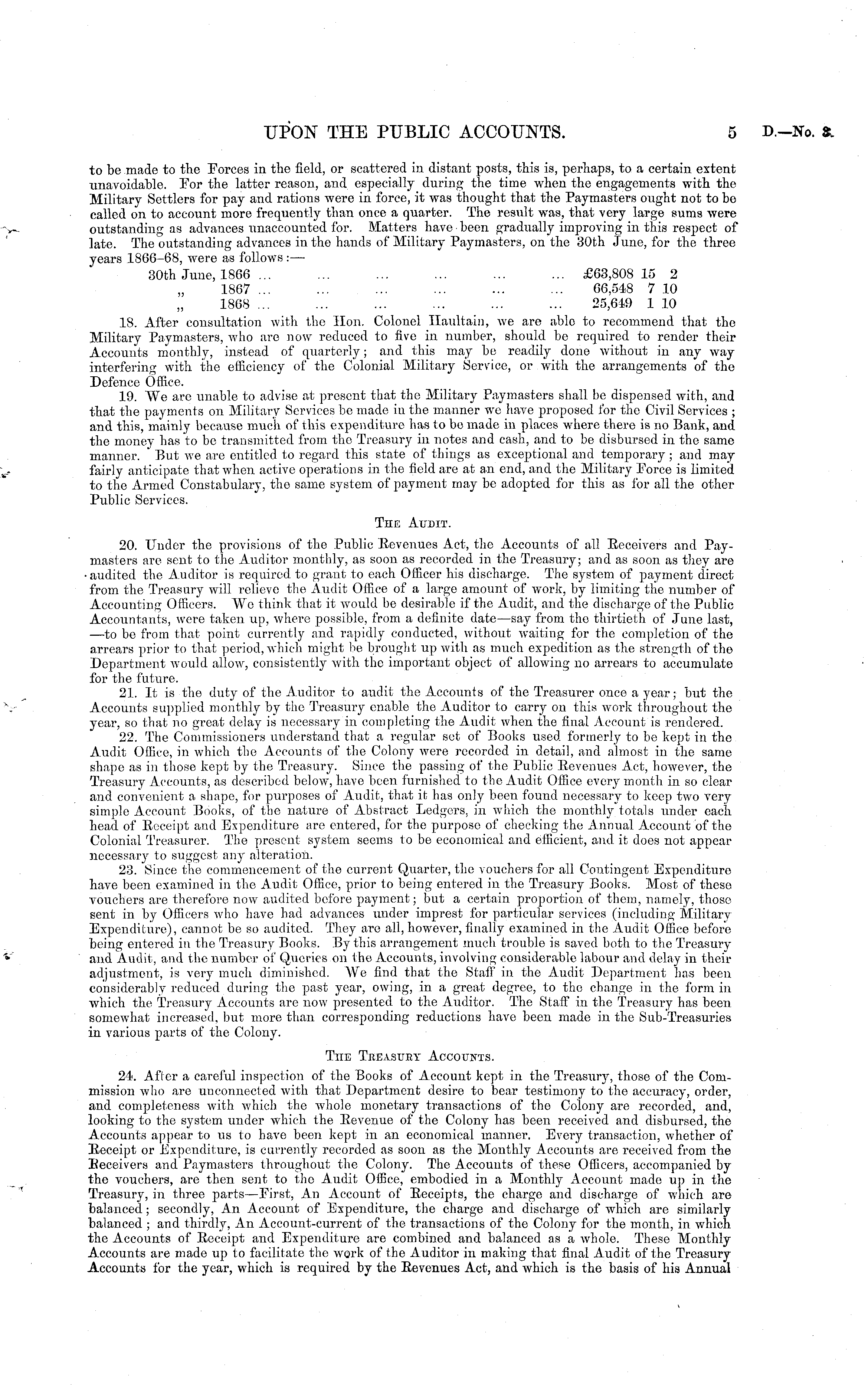 to be made to the Eorces in the field, or scattered in distant posts, this is, perhaps, to a certain extent unavoidable. Eor the latter reason, and especially during the time when the engagements with the Military Settlers for pay and rations were in force, it was thought that the Paymasters ought not to be called on to account more frequently than once a quarter. The result was, that very large sums were outstanding as advances unaccounted for. Matters have been gradually improving in this respect of late. The outstanding advances in the hands of Military Paymasters, on the 30th June, for the three years 1866-68, were as follows : — 30th June, 1866 ... ... ... ... ... ... £63,808 15 2 1867 ... ... ... ... ... ... 66,548 7 10 1868 ... ... ... ... ... ... 25,649 1 10 18. After consultation with tho Hon. Colonel Ilaultain, we are able to recommend that the Military Paymasters, who are now reduced to five in number, should be required to render their Accounts monthly, instead of quarterly; and this may be readily done without in any way interfering with the efficiency of the Colonial Military Service, or with the arrangements of the Defence Office. 19. We arc unable to advise at present that the Military Paymasters shall be dispensed with, and that the payments on Military Services be made in the manner we have proposed for the Civil Services ; and this, mainly because much of this expenditure has to bo made in places where there is no Bank, and the money has to be transmitted from tho Treasury in notes and cash, and to be disbursed in the same manner. * But we are entitled to regard this state of things as exceptional and temporary; and may fairly anticipate that when active operations in the field are at an end, and the Military Porce is limited to the Armed Constabulary, tho same system of payment may be adopted for this as for all the other Public Services. The Audit. 20. Under the provisions of the Public Revenues Act, the Accounts of all Receivers and Paymasters are sent to the Auditor monthly, as soon as recorded in the Treasury; and as soon as they are •audited the Auditor is required to grant to each Officer his discharge. The system of payment direct from the Treasury will relievo the Audit Office of a largo amount of work, by limiting the number of Accounting Officers. Wo think that it would be desirable if tho Audit, and the discharge of the Public Accountants, were taken up, where possible, from a definite date —say from the thirtieth of June last, —to be from that point currently and rapidly conducted, without waiting for the completion of the arrears prior to that period, which might be brought up with as much expedition as the strength of the Department would allow, consistently with the important object of allowing no arrears to accumulate for the future. 21. It is the duty of the Auditor to audit the Accounts of the Treasurer onco a year; but the Accounts supplied monthly by tho Treasury enable the Auditor to carry on this work throughout the year, so that no great delay is necessary in completing the Audit when the final Account is rendered. 22. The Commissioners understand that a regular sot of Books used formerly to be kept in the Audit Office, in which the Accounts of the Colony were recorded in detail, and almost in the same shape as in those kept by the Treasury. Since the passing of the Public Revenues Act, however, the Treasury Accounts, as described below, have been furnished to the Audit Office every month in so clear and convenient a shape, for purposes of Audit, that it has only been found necessary to keep two very simple Account Books, of tho nature of Abstract Ledgers, in which the monthly totals under each head of Receipt and Expenditure are entered, for the purpose of checking the Annual Account of the Colonial Treasurer. The present system seems to be economical and efficient, and it does not appear necessar}' to suggest any alteration. 23. Since the commencement of the current Quarter, the vouchers for all Contingent Expenditure have been examined in the Audit Office, prior to being entered in the Treasury Books. Most of these vouchers are therefore now audited before payment; but a certain proportion of them, namely, those sent in by Officers who have had advances under imprest for particular services (including Military Expenditure), cannot be so audited. They are all, however, finally examined in the Audit Office before being entered in the Treasury Books. By this arrangement much trouble is saved both to the Treasury and Audit, and the number of Queries on the Accounts, involving considerable labour and delay in their adjustment, is very much diminished. We find that the Staff in the Audit Department has been considerably reduced during the past year, owing, in a great degree, to tho change in the form in which the Treasury Accounts are now presented to the Auditor. The Staff in the Treasury has been somewhat increased, but more than corresponding reductions have been made in the Sub-Treasuries in various parts of the Colony. The Teeasuey Accounts. 24. After a careful inspection of the Books of Account kept in the Treasury, those of the Commission who are unconnected with that Department desire to bear testimony to the accuracy, order, and completeness with which the whole monetary transactions of the Colony are recorded, and, looking to the system under which the Revenue of the Colony has been received and disbursed, the Accounts appear to us to have been kept in an economical manner. Every transaction, whether of Receipt or Expenditure, is currently recorded as soon as tho Monthly Accounts are received from the Receivers and Paymasters throughout the Colony. The Accounts of these Officers, accompanied by the vouchers, are then sent to the Audit Office, embodied in a Monthly Account made up in the Treasury, in three parts —First, An Account of Receipts, the charge and discharge of which are balanced; secondly, An Account of Expenditure, t