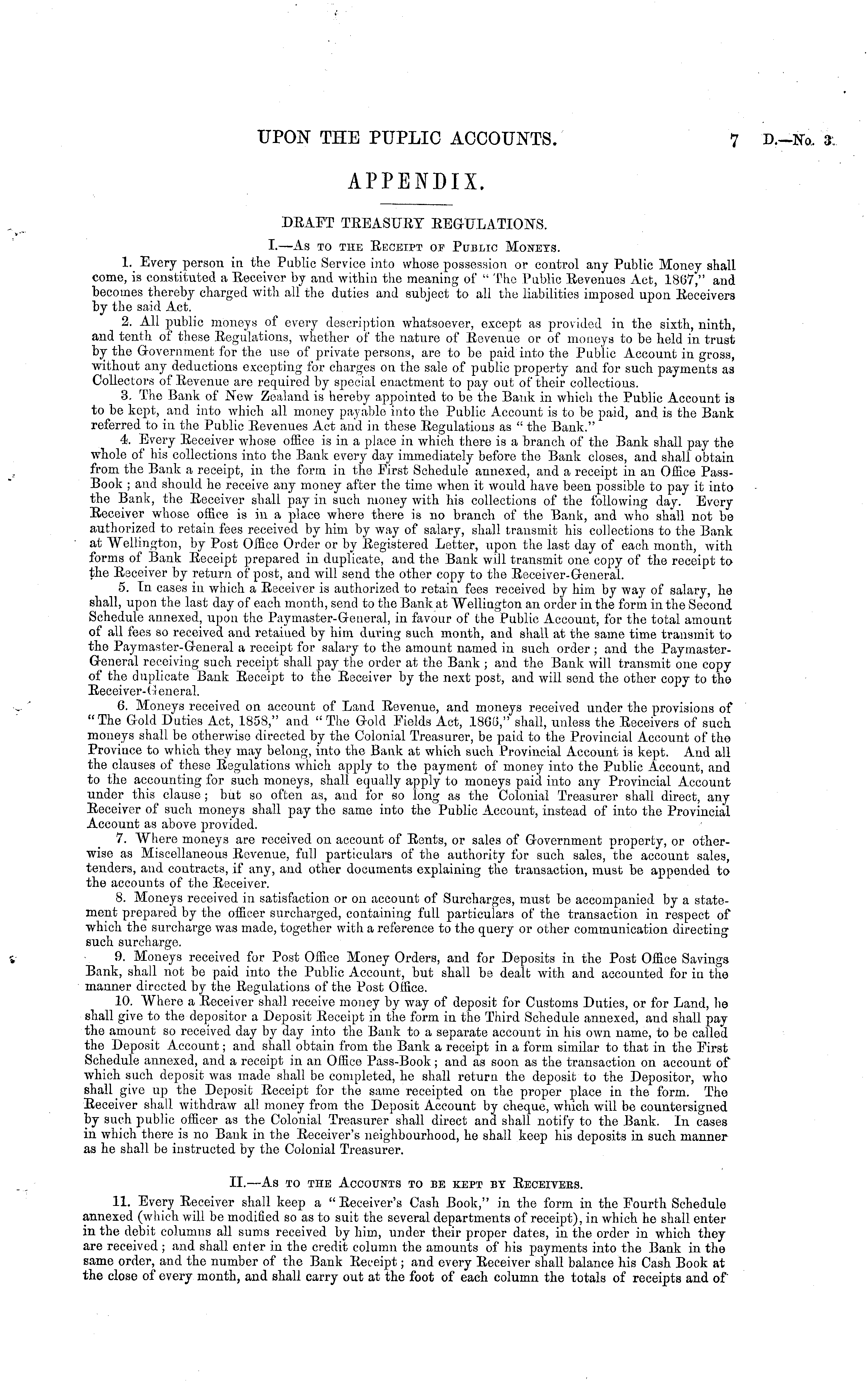 DRAFT TREASURY REGULATIONS. I.—As to the Receipt of Public Moneys. 1. Every person in the Public Service into whose possession or control any Public Money shall come, is constituted a Receiver by and within the meaning of " Tho Public Revenues Act, 1867," and becomes thereby charged with all the duties and subject to all the liabilities imposed upon Receivers by the said Act. 2. All public moneys of every description whatsoever, except as provided in the sixth, ninth, and tenth of these Regulations, whether of the nature of Revenue or of moneys to be held in trust by the Government for the use of private persons, are to be paid into the Public Account in gross, without any deductions excepting for charges on the sale of public property and for such payments as Collectors of Revenue are required by special enactment to pay out of their collections. 3. The Bank of New Zealand is hereby appointed to be the Bank in which the Public Account is to be kept, and into which all money payable into the Public Account is to be paid, and is the Bank referred to in the Public Revenues Act and in these Regulations as " the Bank." 4. Every Receiver whose office is in a place in which there is a branch of tho Bank shall pay the whole of his collections into the Bank every day immediately before the Bank closes, and shall obtain from the Bank a receipt, in the form in tho First Schedule annexed, and a receipt in an Office PassBook ; and should he receive any money after the time when it would have been possible to pay it into the Bank, the Receiver shall pay in such money with his collections of the following day. Every Receiver whose office is in a place where there is no branch of the Bank, and who shall not be authorized to retain fees received by him by way of salary, shall transmit his collections to the Bank at Wellington, by Post Office Order or by Registered Letter, upon the last day of each month, with forms of Bank Receipt prepared in duplicate, and the Bank will transmit one copy of the receipt to the Receiver by return of post, and will send the other copy to the Receiver-General. 5. In cases in which a Receiver is authorized to retain fees received by him by way of salary, ho shall, upon the last day of each month, send to the Bank at Wellington an order in the form in the Second Schedule annexed, upon the Paymaster-General, in favour of the Public Account, for the total amount of all fees so received and retained by him during such month, and shall at the same time transmit to the Paymaster-General a receipt for salary to the amount named in such order ; and the PaymasterGeneral receiving such receipt shall pay the order at the Bank ; and the Bank will transmit one copy of the duplicate Bank Receipt to the Receiver by the next post, and will send the other copy to the Receiver- General. 6. Moneys received on account of Land Revenue, and moneys received under the provisions of "The Gold Duties Act, 1858," and " The Gold Fields Act, 186(5," shall, unless the Receivers of such moneys shall be otherwise directed by the Colonial Treasurer, be paid to the Provincial Account of the Province to which they may belong, into the Bank at which such Provincial Account is kept. And all the clauses of these Regulations which apply to the payment of money into the Public Account, and to the accounting for such moneys, shall equally apply to moneys paid into any Provincial Account under this clause; but so often as, and for so long as the Colonial Treasurer shall direct, any Receiver of such moneys shall pay the same into the Public Account, instead of into the Provincial Account as above provided. 7. Where moneys are received on account of Rents, or sales of Government property, or otherwise as Miscellaneous Revenue, full particulars of the authority for such sales, the account sales, tenders, and contracts, if any, and other documents explaining the transaction, must be appended to the accounts of the Receiver. 8. Moneys received in satisfaction or on account of Surcharges, must be accompanied by a statement prepared by the officer surcharged, containing full particulars of the transaction in respect of which the surcharge was made, together with a reference to the query or other communication directing such surcharge. 9. Moneys received for Post Office Money Orders, and for Deposits in the Post Office Savings Bank, shall not be paid into the Public Account, but shall bo dealt with and accounted for in the manner directed by the Regulations of tho Post Office. 10. Where a Receiver shall receive money by way of deposit for Customs Duties, or for Land, he shall give to the depositor a Deposit Receipt in the form in the Third Schedule annexed, and shall pay the amount so received day by day into the Bank to a separate account in his own name, to be called the Deposit Account; and shall obtain from the Bank a receipt in a form similar to that in the First Schedule annexed, and a receipt in an Office Pass-Book; and as soon as the transaction on account of which such deposit was made shall be completed, he shall return the deposit to the Depositor, who shall give up the Deposit Receipt for the same receipted on the proper place in the form. The Receiver shall withdraw all money from the Deposit Account by cheque, which will be countersigned by such public officer as the Colonial Treasurer shall direct and shall notify to the Bank. In cases in which there is no Bank in the Receiver's neighbourhood, he shall keep his deposits in such manner as he shall be instructed by the Colonial Treasurer. II.—As to the Accounts to be kept by Receivees. 11. Every Receiver shall keep a "Receiver's Cash Book," in the form in the Fourth Schedule annexed (which will be modified so as to suit the several departments of receipt), in which he shall enter in the debit columns all sums received by him, under their proper dates, in the order in which they are received ; and shall enter in the credit column the amounts of his payments