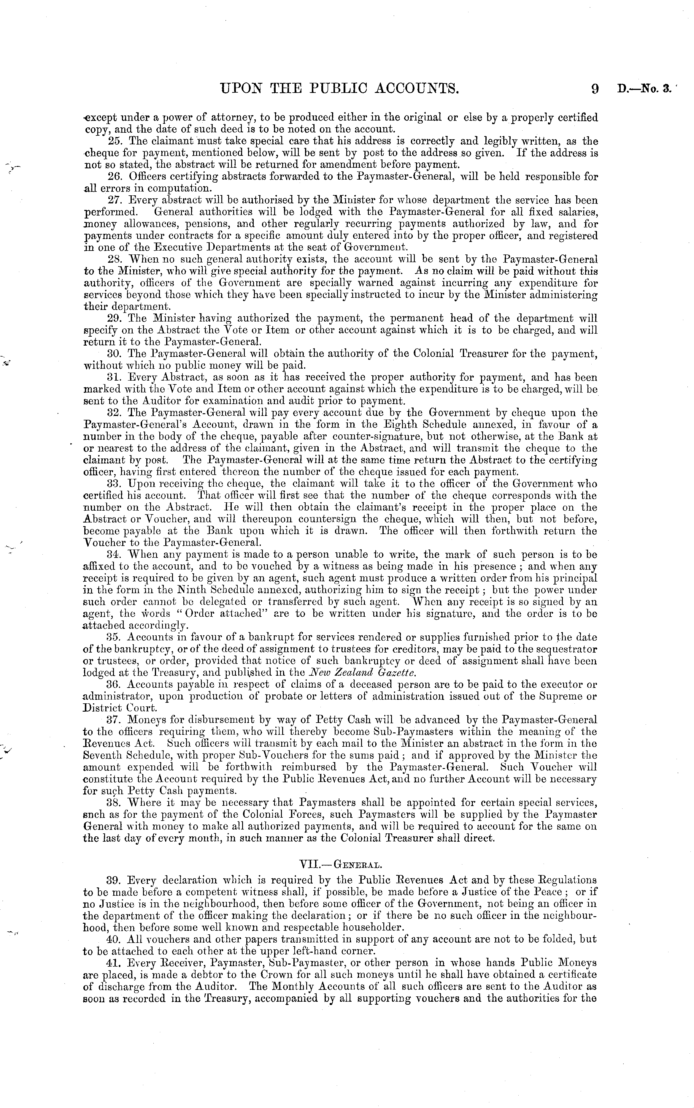 except under a power of attorney, to be produced either in the original or else by a properly certified copy, and the date of such deed is to be noted on the account. 25. The claimant must take special care that his address is correctly and legibly written, as the cheque for payment, mentioned below, will be sent by post to the address so given. If the address is not so stated, the abstract will be returned for amendment before payment. 26. Officers certifying abstracts forwarded to the Paymaster-General, will be held responsible for all errors in computation. 27. Every abstract will be authorised by the Minister for whose department the service has been performed. General authorities will be lodged with the Paymaster-General for all fixed salaries, money allowances, pensions, and other regularly recurring payments authorized by law, and for payments under contracts for a specific amount duly entered into by the proper officer, and registered in one of the Executive Departments at the seat of Government. 28. When no such general authority exists, the account will be sent by the Paymaster-General to the Minister, who will give special authority for the payment. As no claim will be paid without this authority, officers of the Government are specially warned against incurring any expenditure for services beyond those which they have been specially instructed to incur by the Minister administering their department. 29. The Minister having authorized the payment, the permanent head of the department will specify on the Abstract the Vote or Item or other account against which it is to be charged, and will return it to the Paymaster-General. 30. The Paymaster-General will obtain the authority of the Colonial Treasurer for the payment, without which no public money will be paid. 31. Every Abstract, as soon as it has received the proper authority for payment, and has been marked with tho Vote and Item or other account against which the expenditure is to be charged, will be sent to the Auditor for examination, and audit prior to payment. 32. The Paymaster-General will pay every account due by the Government by cheque upon the Paymaster-General's Account, drawn in the form in the Eighth Schedule annexed, in favour of a number in the body of the cheque, payable after counter-signature, but not otherwise, at the Bank at or nearest to the address of the claimant, given in the Abstract, and will transmit the cheque to the claimant by post. The Paymaster-General will at the same time return the Abstract to the certifying officer, having first entered thereon the number of the cheque issued for each payment. 33. Upon receiving the cheque, the claimant will take it to the officer of the Government who certified his account. That officer will first see that the number of the cheque corresponds with the number on the Abstract. He will then obtain the claimant's receipt in the proper place on the Abstract or Voucher, and will thereupon countersign the cheque, which will then, but not before, become payable at the Bank upon which it is drawn. The officer will then forthwith return the Voucher to the Paymaster-General. 34. When any payment is made to a person unable to write, the mark of such person is to be affixed to the account, and to be vouched by a witness as being made in his presence ; and when any receipt is required to be given by an agent, such agent must produce a written order from his principal in the form in tho Ninth Schedule annexed, authorizing him to sign the receipt; but the power under such order cannot be delegated or transferred by such agent. When any receipt is so signed by an agent, the words " Order attached" are to be written under his signature, and the order is to be attached accordingly. 35. Accounts in favour of a bankrupt for services rendered or supplies furnished prior to the date of the bankruptcy, or of the deed of assignment to trustees for creditors, may be paid to the sequestrator or trustees, or order, provided that notice of such bankruptcy or deed of assignment shall have been lodged at the Treasury, and published in the New Zealand Gazette. 36. Accounts payable in respect of claims of a deceased person are to be paid to the executor or administrator, upon production of probate or letters of administration issued out of the Supreme or District Court. 37. Moneys for disbursement by way of Petty Cash will be advanced by the Paymaster-General to the officers requiring them, who will thereby become Sub-Paymasters within the meaning of the Revenues Act. Such officers will transmit by each mail to the Minister an abstract in the form in the Seventh Schedule, with, proper Sub-Vouchers for the sums paid; and if approved by the Minister tho amount expended will bo forthwith reimbursed by the Paymaster-General. Such Voucher will constitute the Account required by the Public Revenues Act, and no further Account will be necessary for such Petty Cash payments. 38. Where it may be necessary that Paymasters shall be appointed for certain special services, _nch as for the payment of the Colonial Forces, such Paymasters will be supplied by the Paymaster General with money to make all authorized payments, and will be required to account for the same on the last day of every month, in such manner as the Colonial Treasurer shall direct. VII. — Genebal. 39. Every declaration which is required by the Public Revenues Act and by these Regulations to be made before a competent witness shall, if possible, be made before a Justice of the Peace ; or if no Justice is in the neighbourhood, then before some officer of the Government, not being an officer in the department of the officer making the declaration; or if there be no such officer in the neighbourhood, then before some well known and respectable householder. 40. All vouchers and other papers transmitted in support of any account are not to be folded, but to be attached to each other at the upper left-hand corner. 41. Every Receiver, Pay